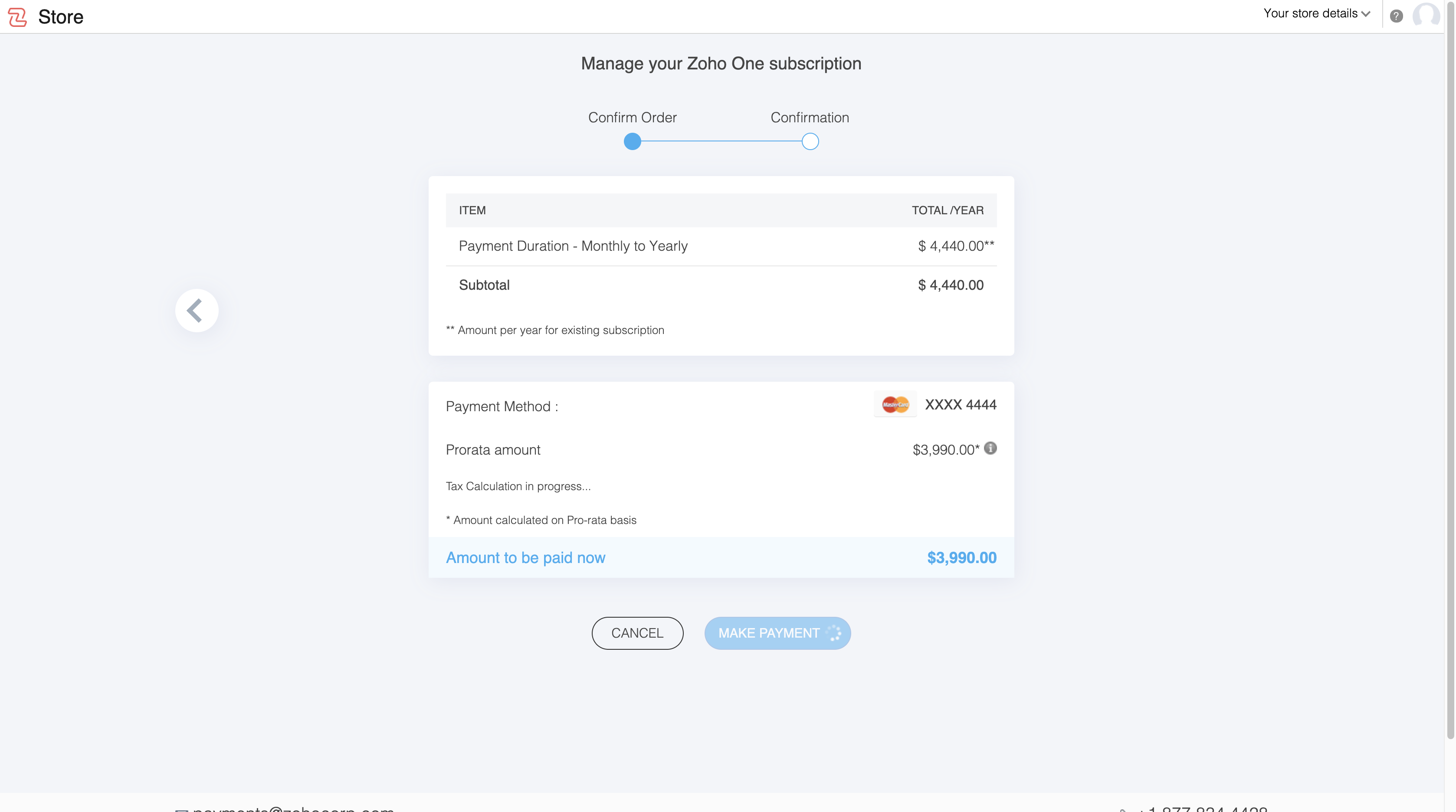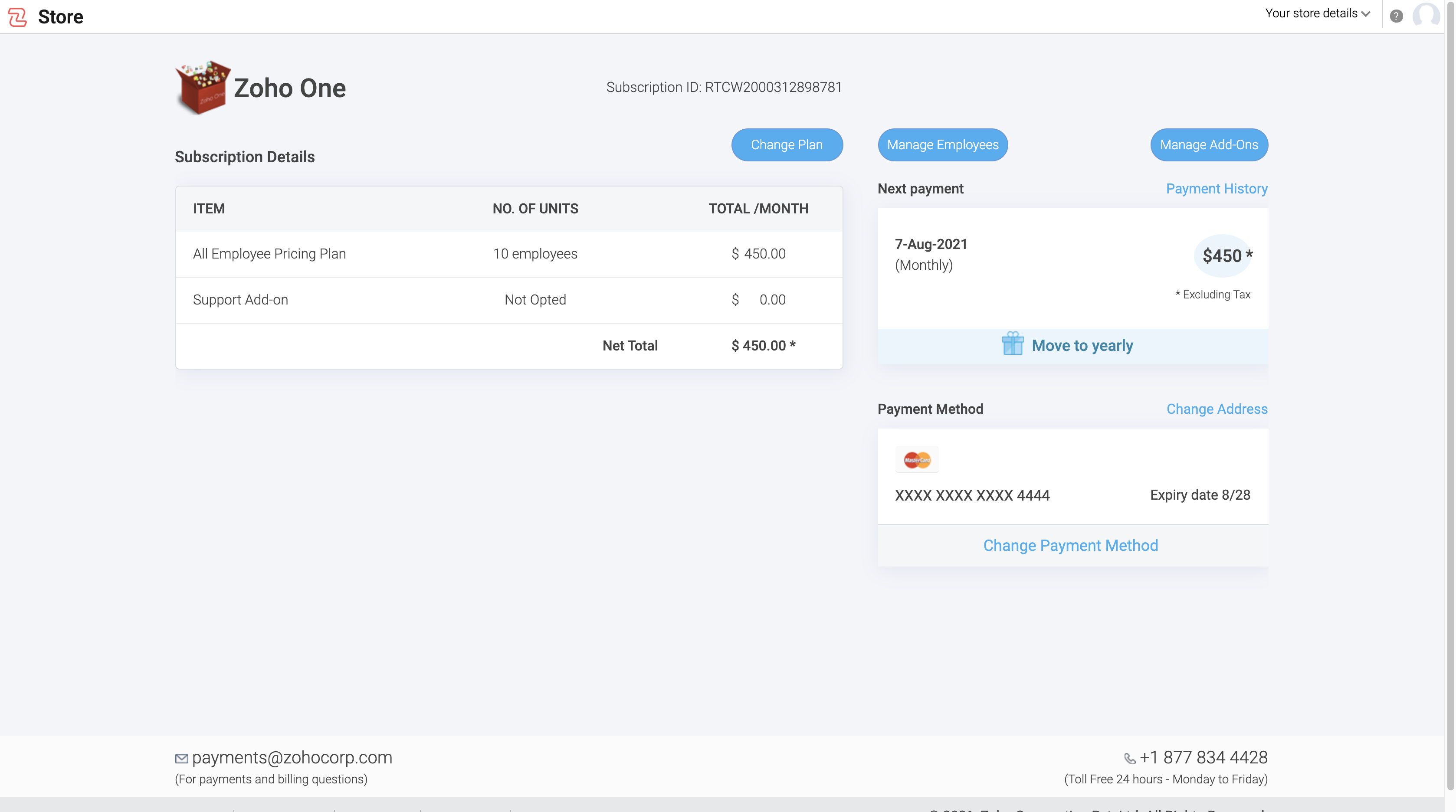 メモ:オフラインで支払いを行っている場合、サブスクリプションを変更するには、sales@zohocorp.comに連絡するか、オンライン決済に変更してください。