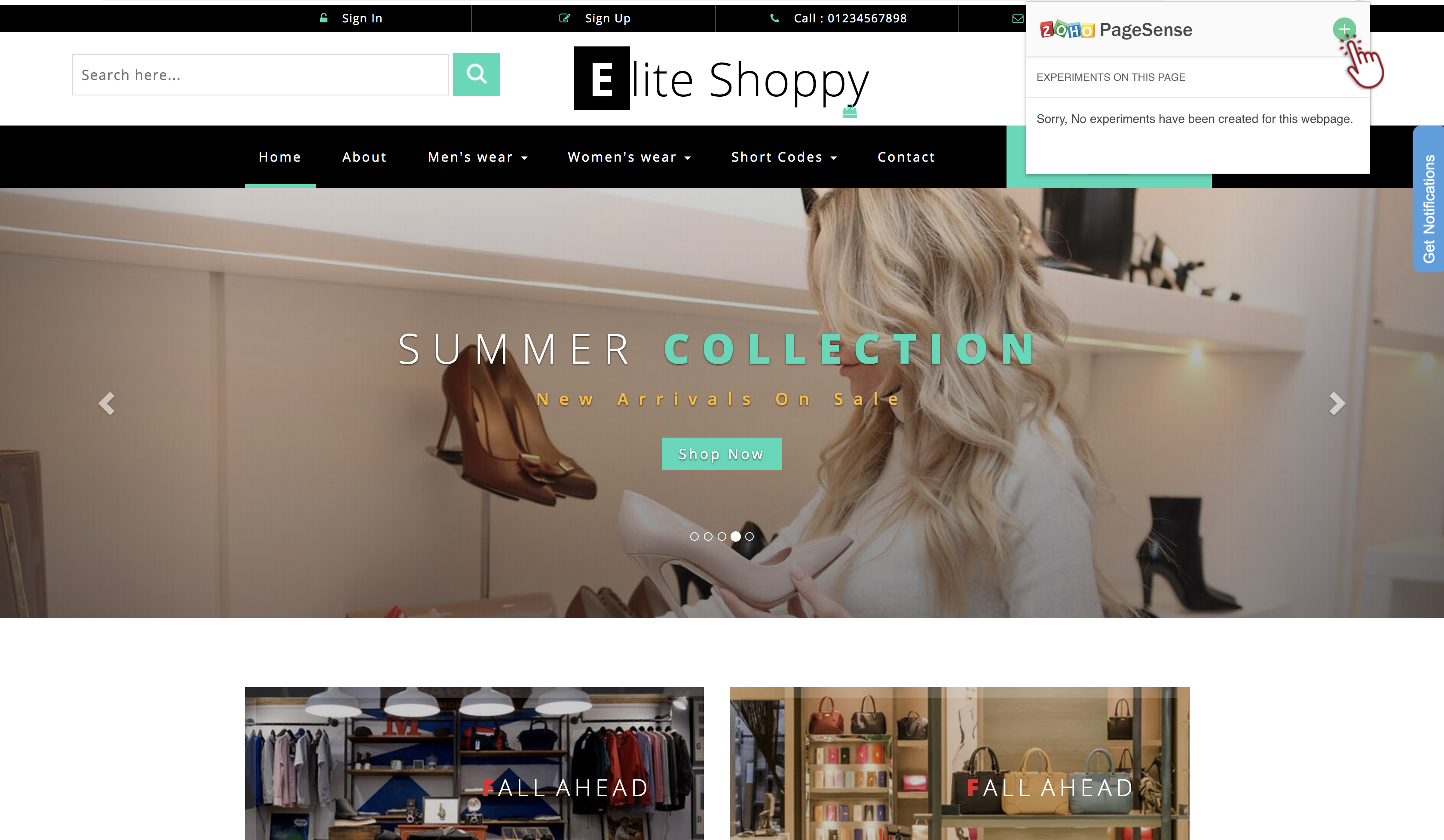 1. ヒートマップを作成したいウェブページを開き、ChromeブラウザのZoho PageSense拡張機能アイコン、そしてプラスの「+」アイコンをクリックします。