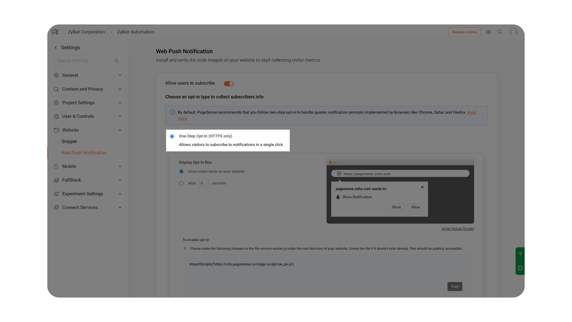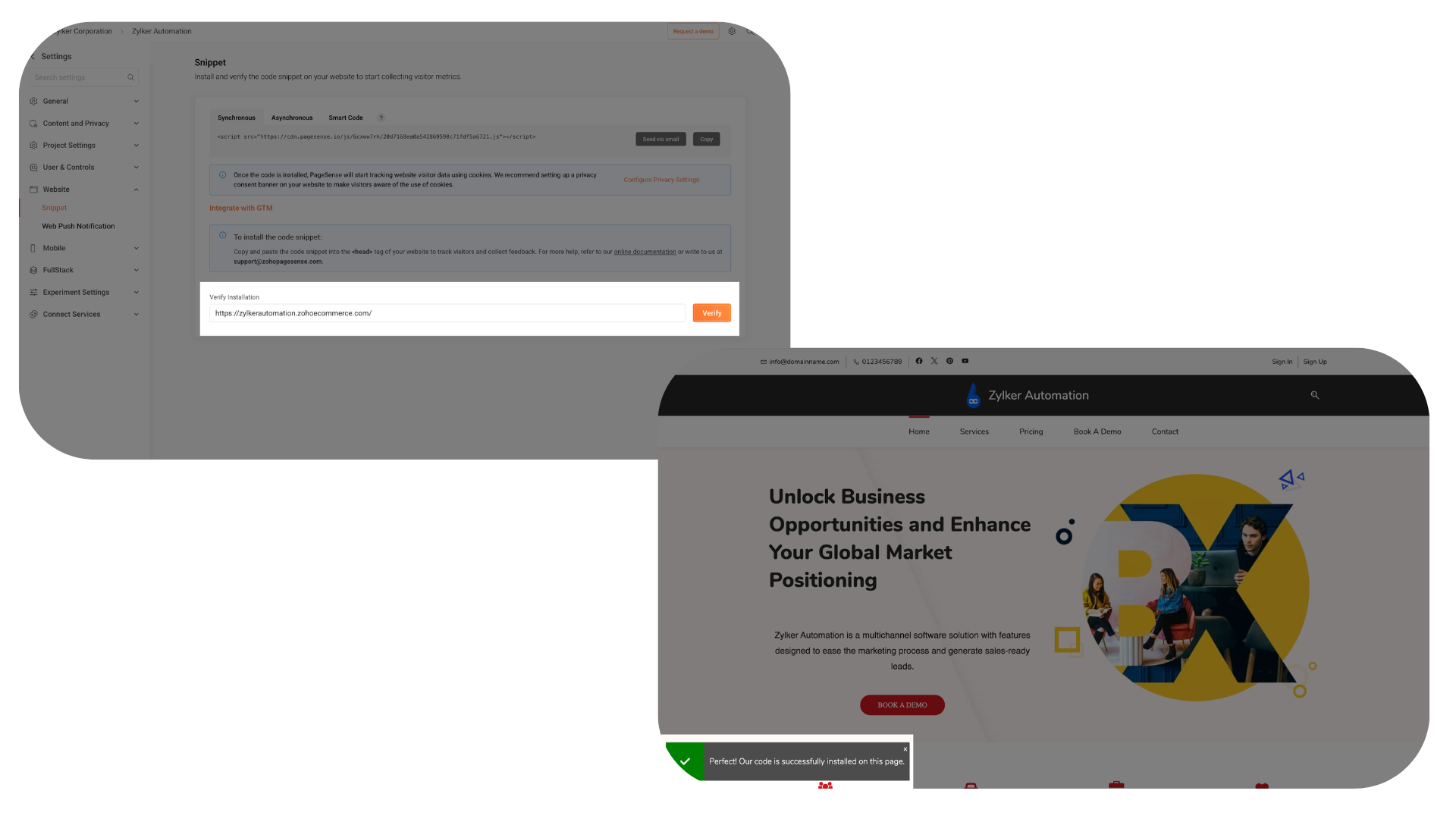 これらの設定により、PageSense が訪問者の行動をトラッキングし、実験を実行し、インサイトを収集し、通知を通じてユーザーと直接コミュニケーションできるようになります。