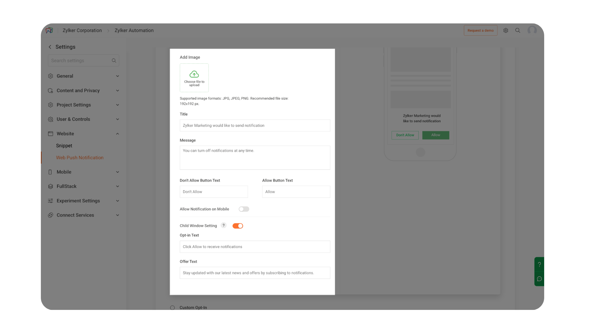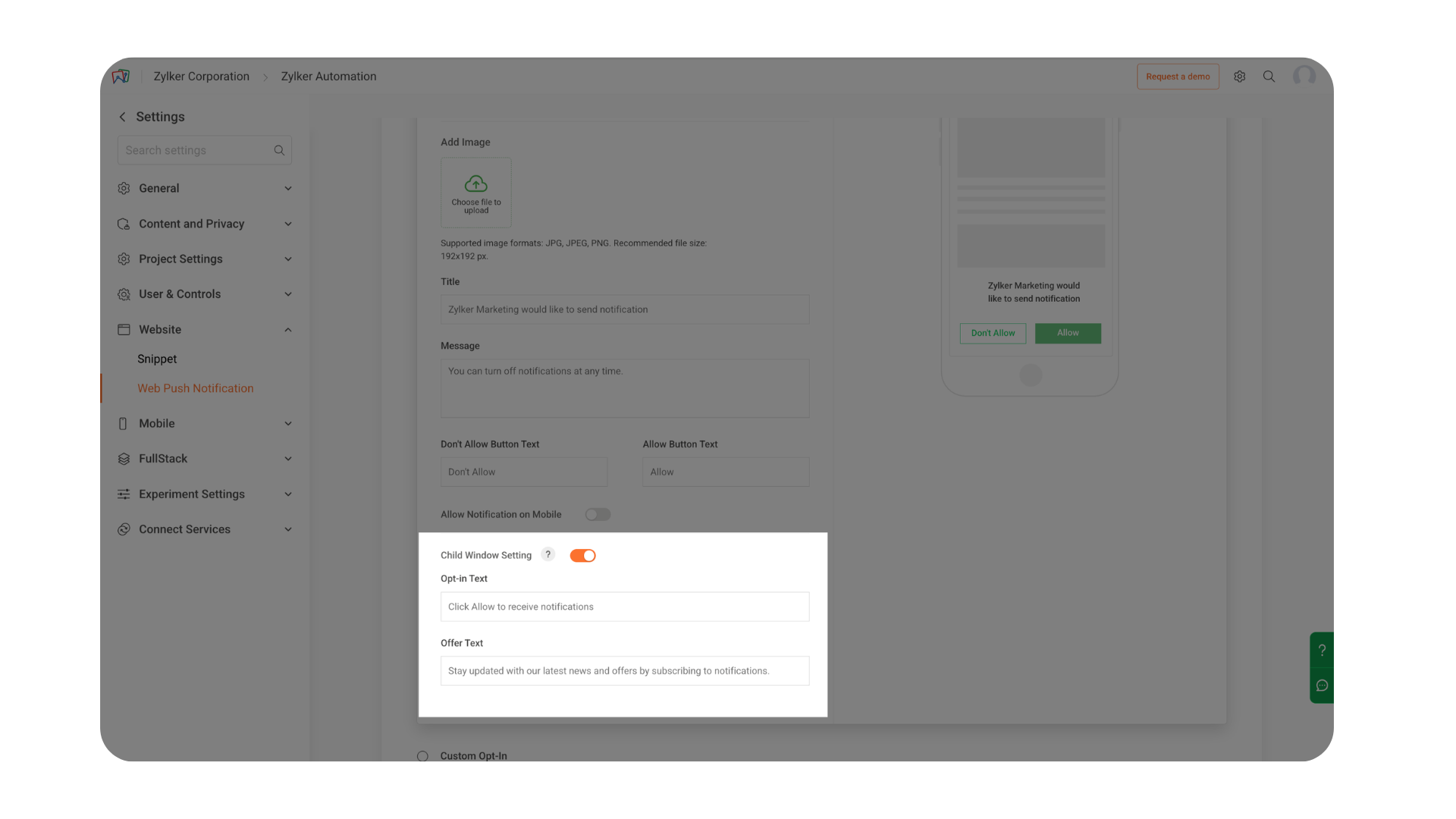 [子ウィンドウ]設定では、ブラウザー内に開くセカンダリウィンドウ内にオプトインプロンプトを表示します。このウィンドウはメインページの拡張として動作し、利用可能なすべてのボタンと設定オプションをサポートします。