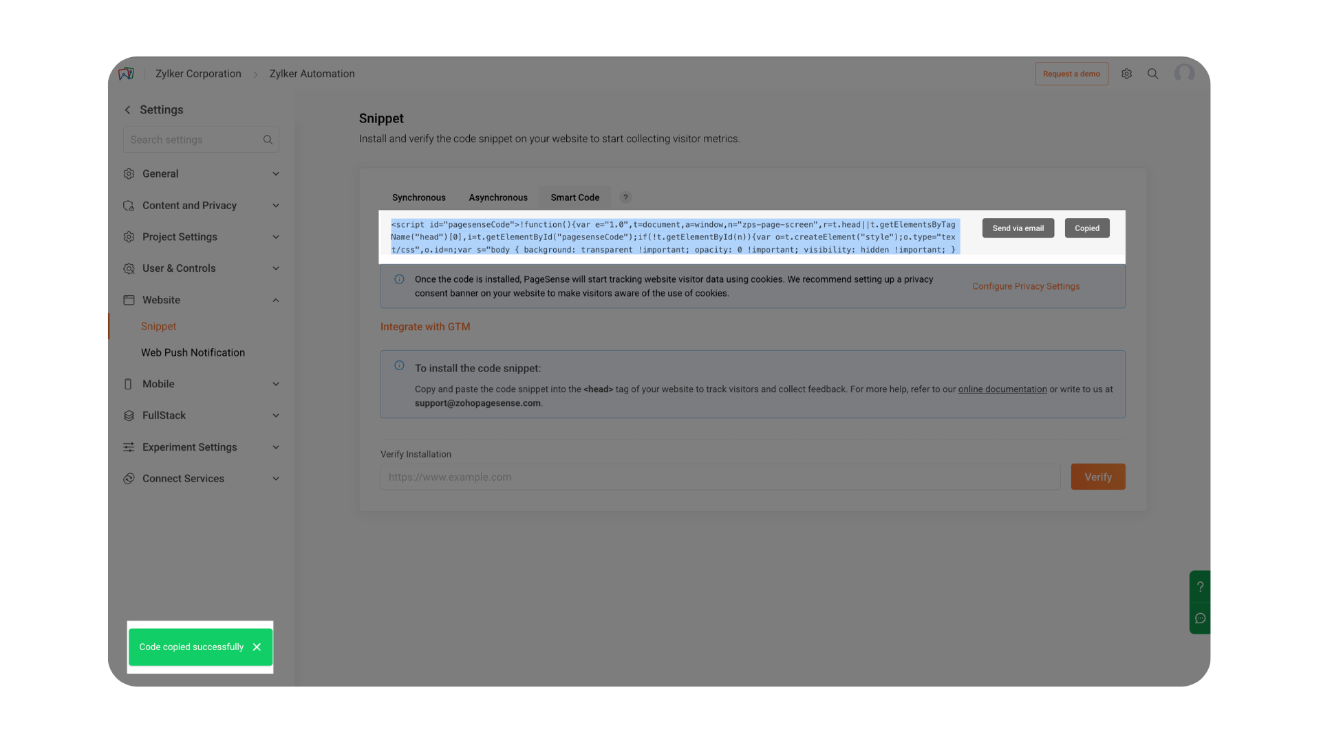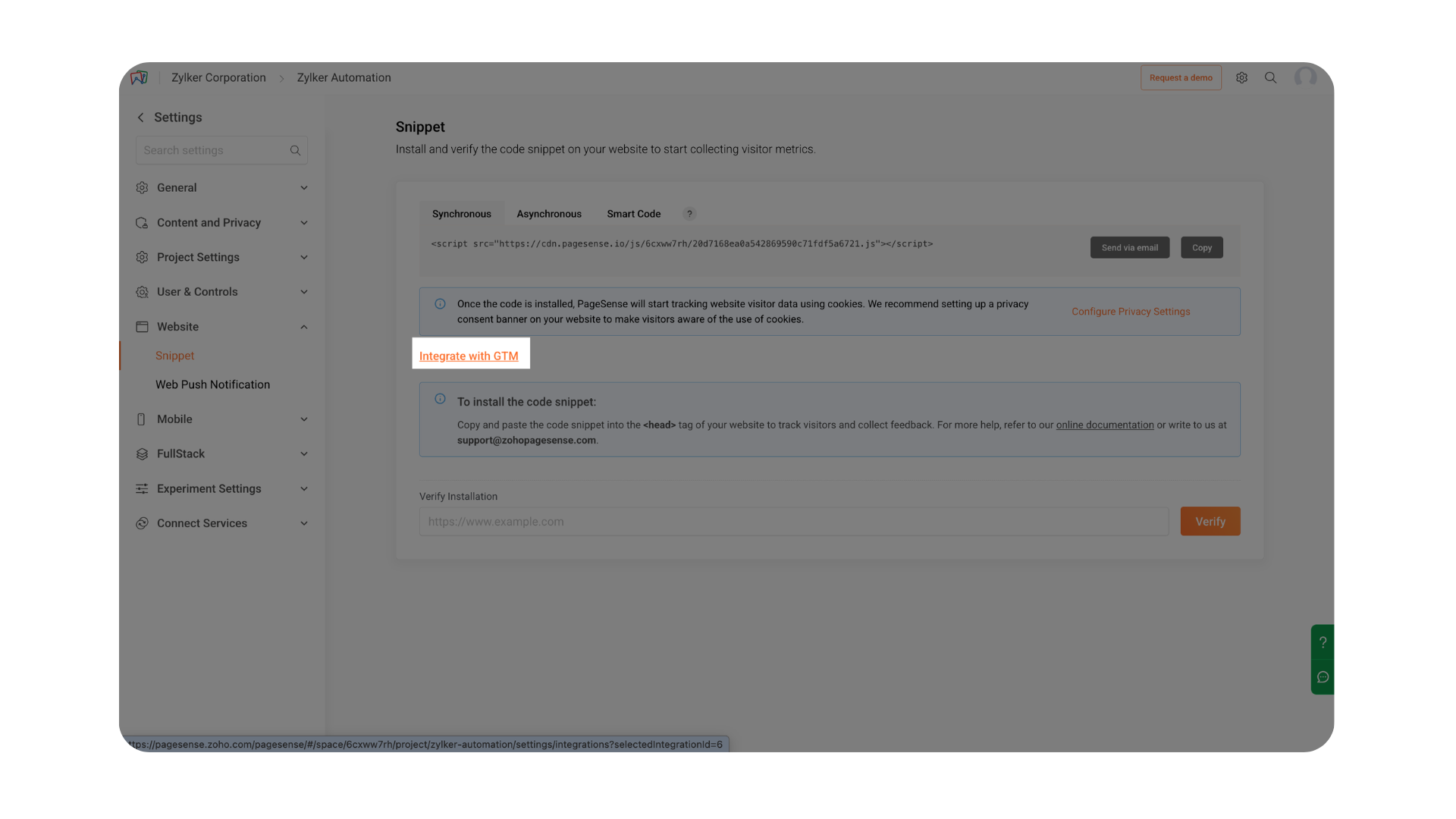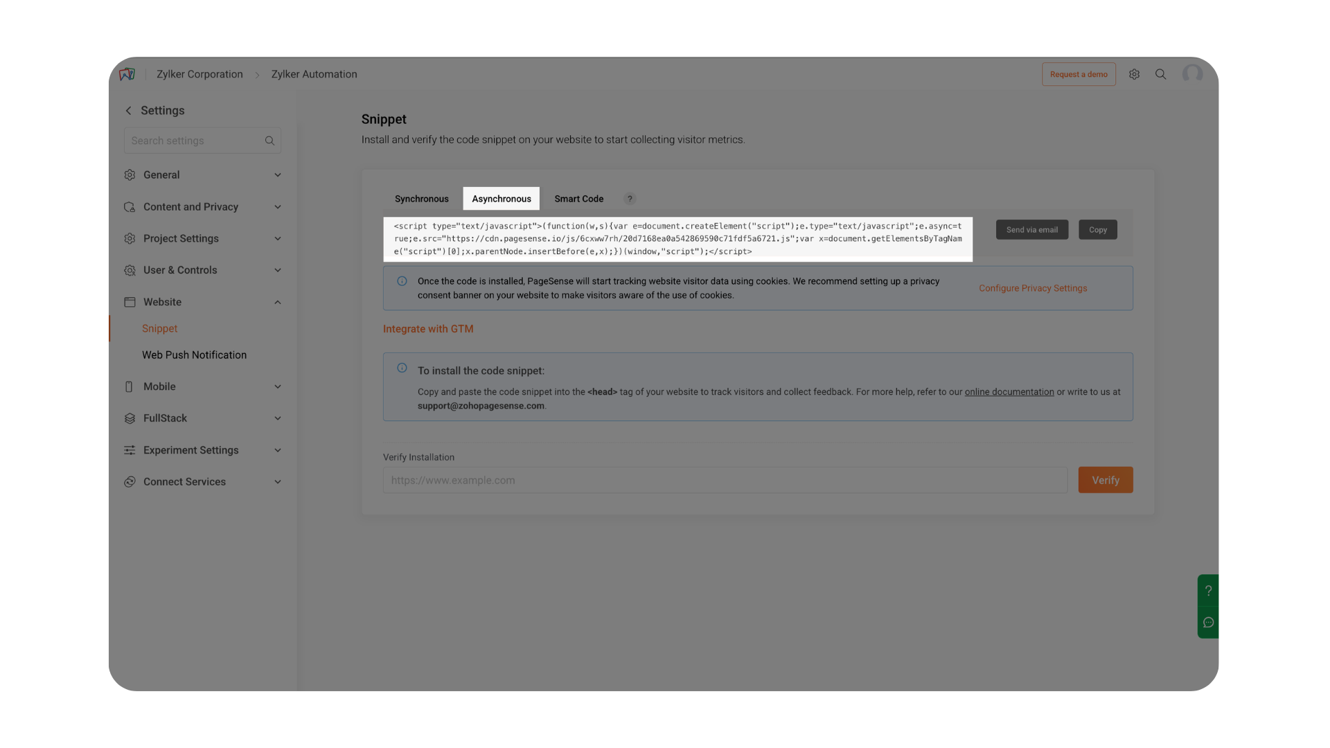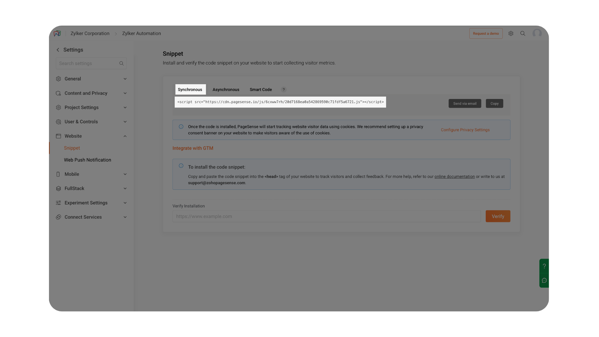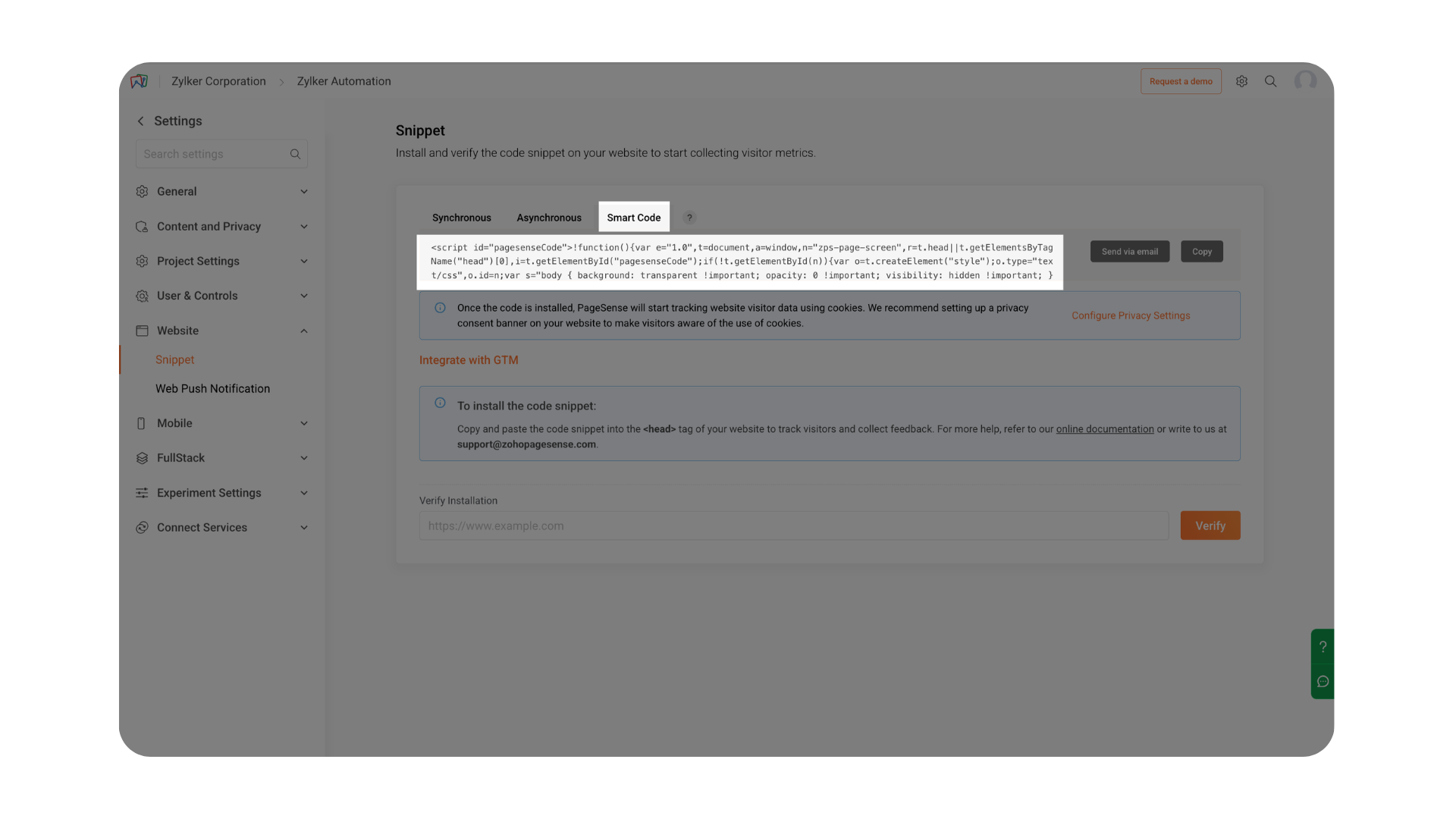 Zoho PageSense のWebサイト設定内にあるSnippetセクションでは、Webサイトに PageSense のトラッキングコードをインストールおよび管理できます。このスニペットのインストールは、訪問者の行動データを収集し、サイト上で最適化実験を開始するための最初かつ最も重要なステップです。