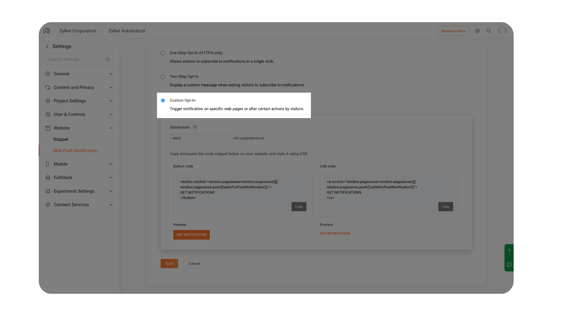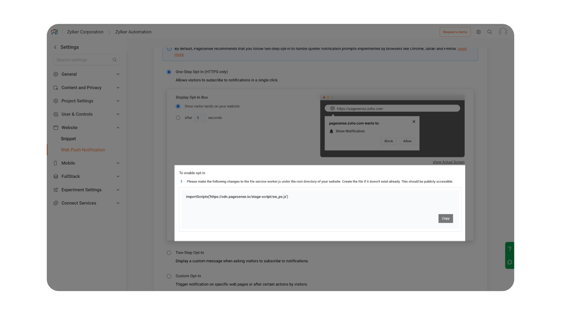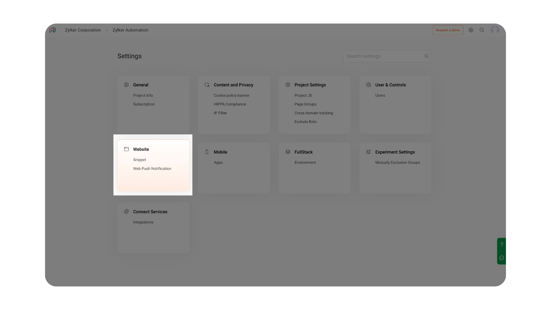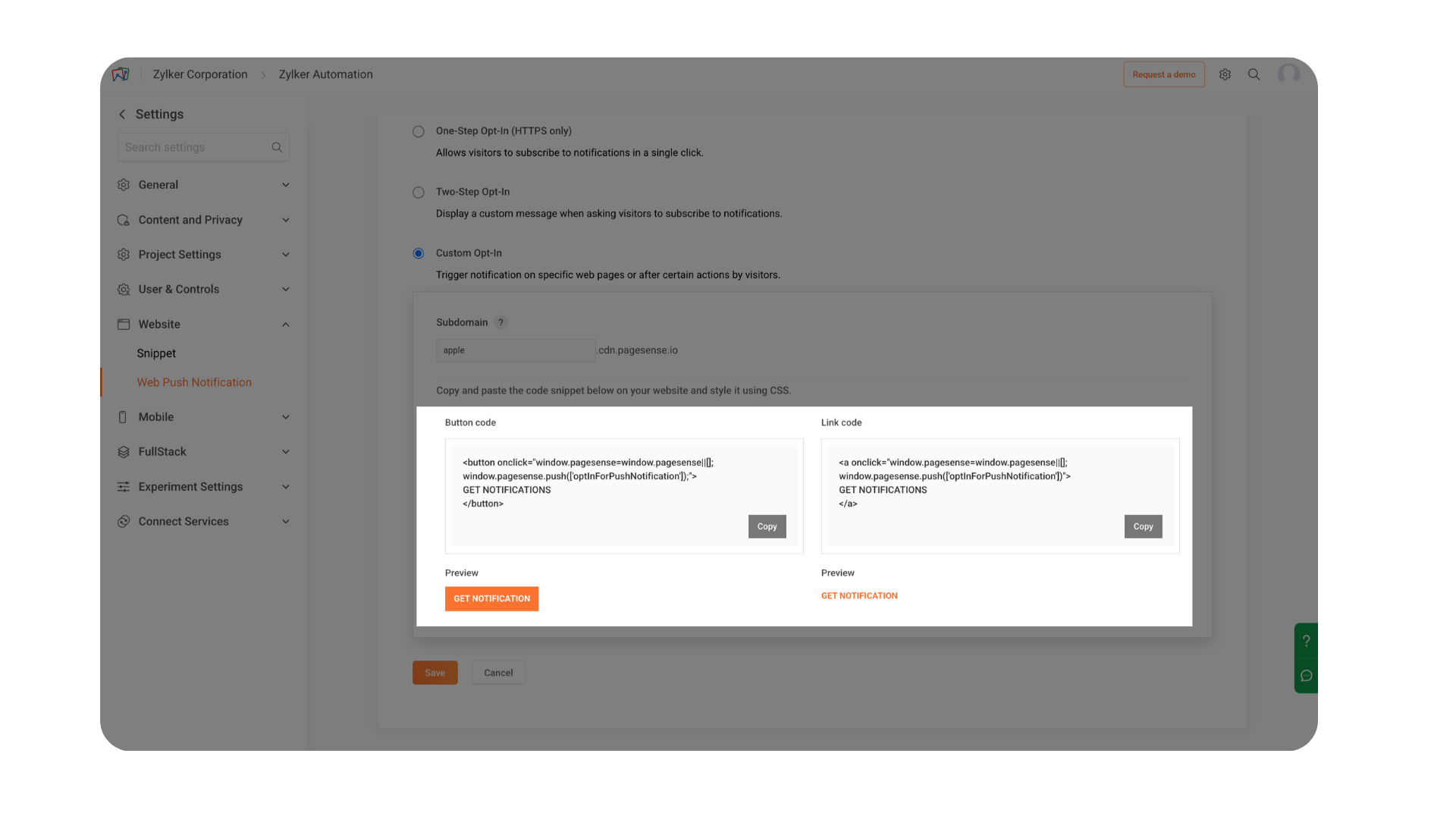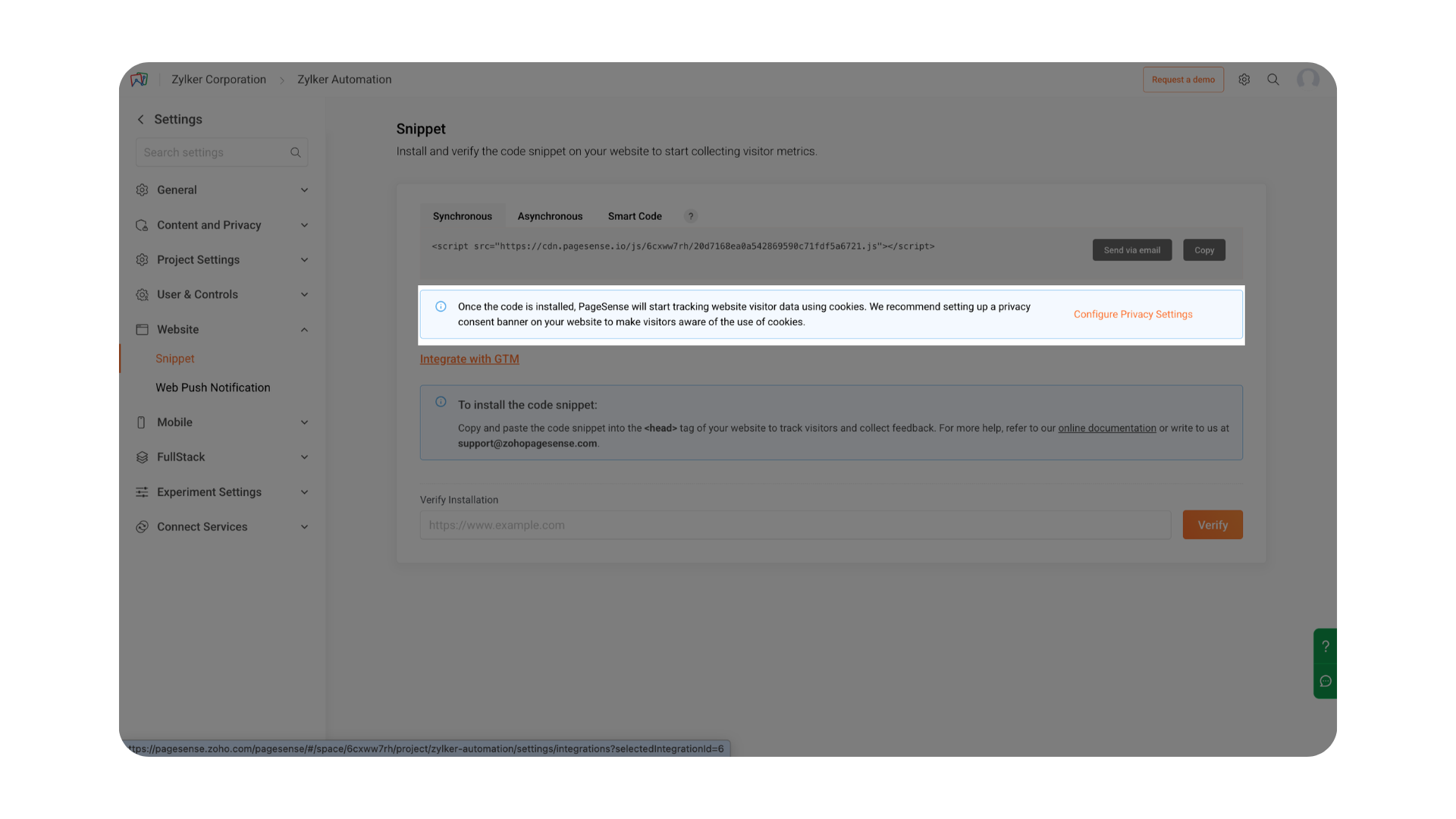 Zoho PageSense のWebサイト設定内にあるSnippetセクションでは、Webサイトに PageSense のトラッキングコードをインストールおよび管理できます。このスニペットのインストールは、訪問者の行動データを収集し、サイト上で最適化実験を開始するための最初かつ最も重要なステップです。