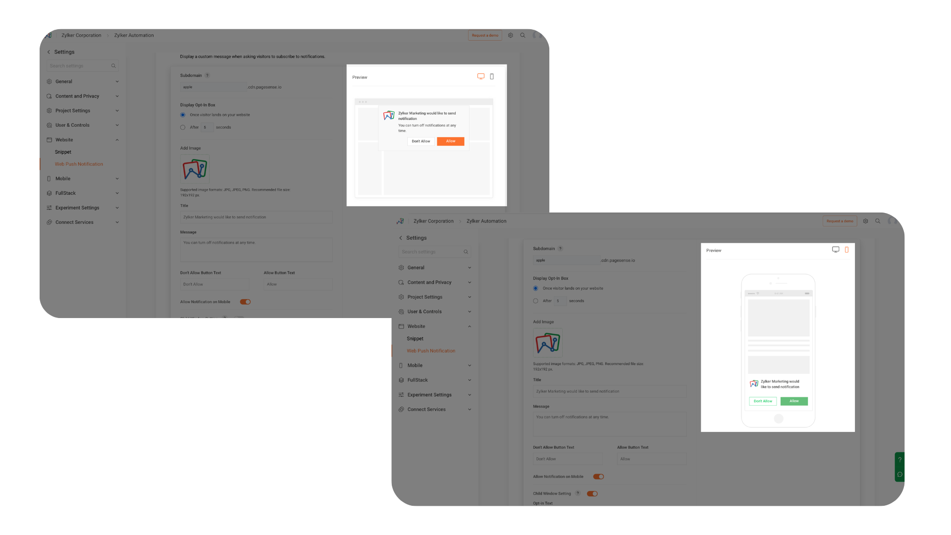Web とモバイルのプレビューモードを切り替えて、オプトインボタンやリンクが各デバイスでどのように動作するかを確認できます。これにより、Webサイトに公開する前に、購読プロンプトが正しく表示され、デスクトップとモバイルの両方で一貫した体験を提供できることを確認できます。