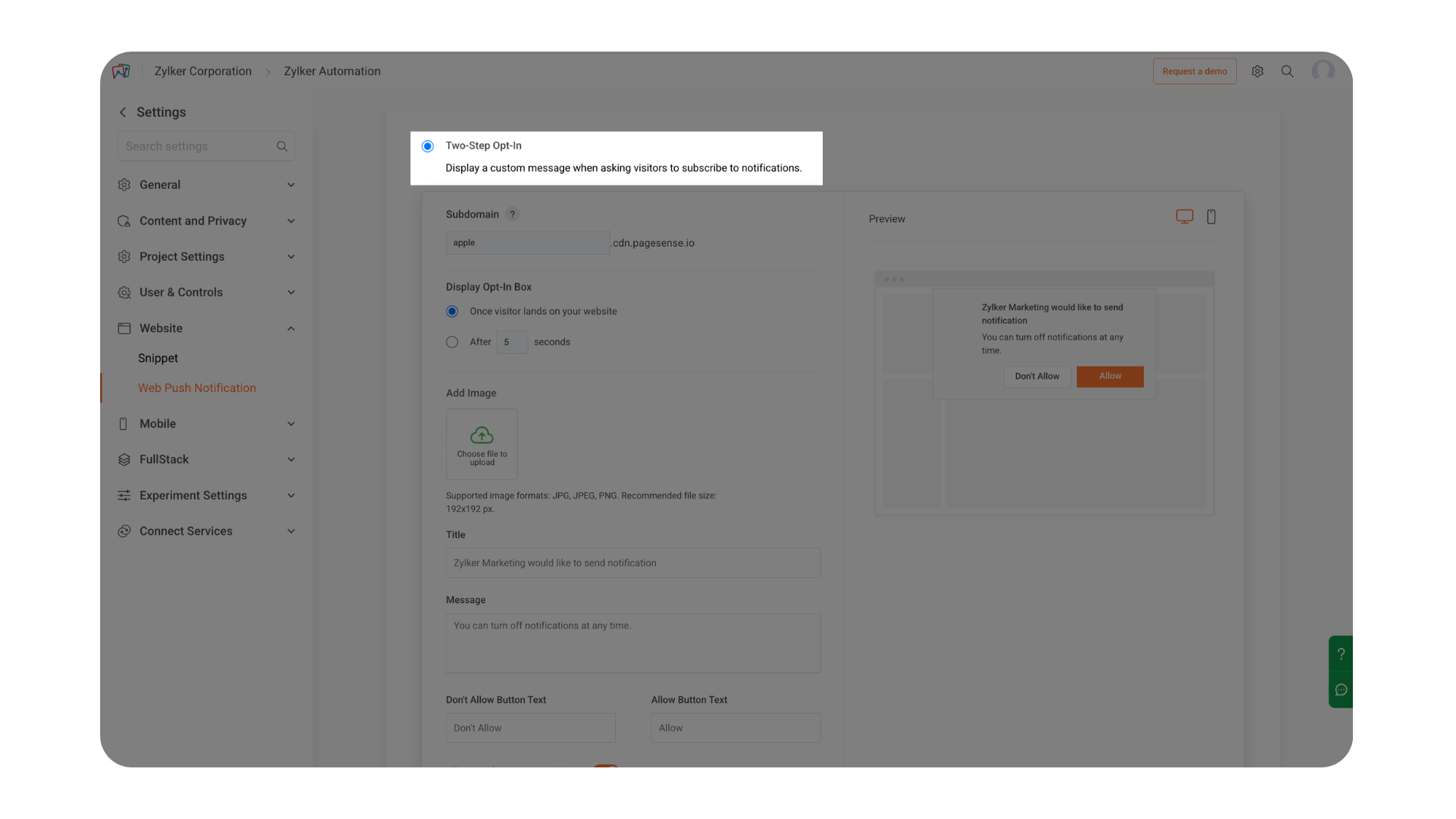 カスタムオプトイントリガーを設定した後、PageSense では訪問者にどのように通知購読プロンプトが表示されるかをプレビューすることもできます。