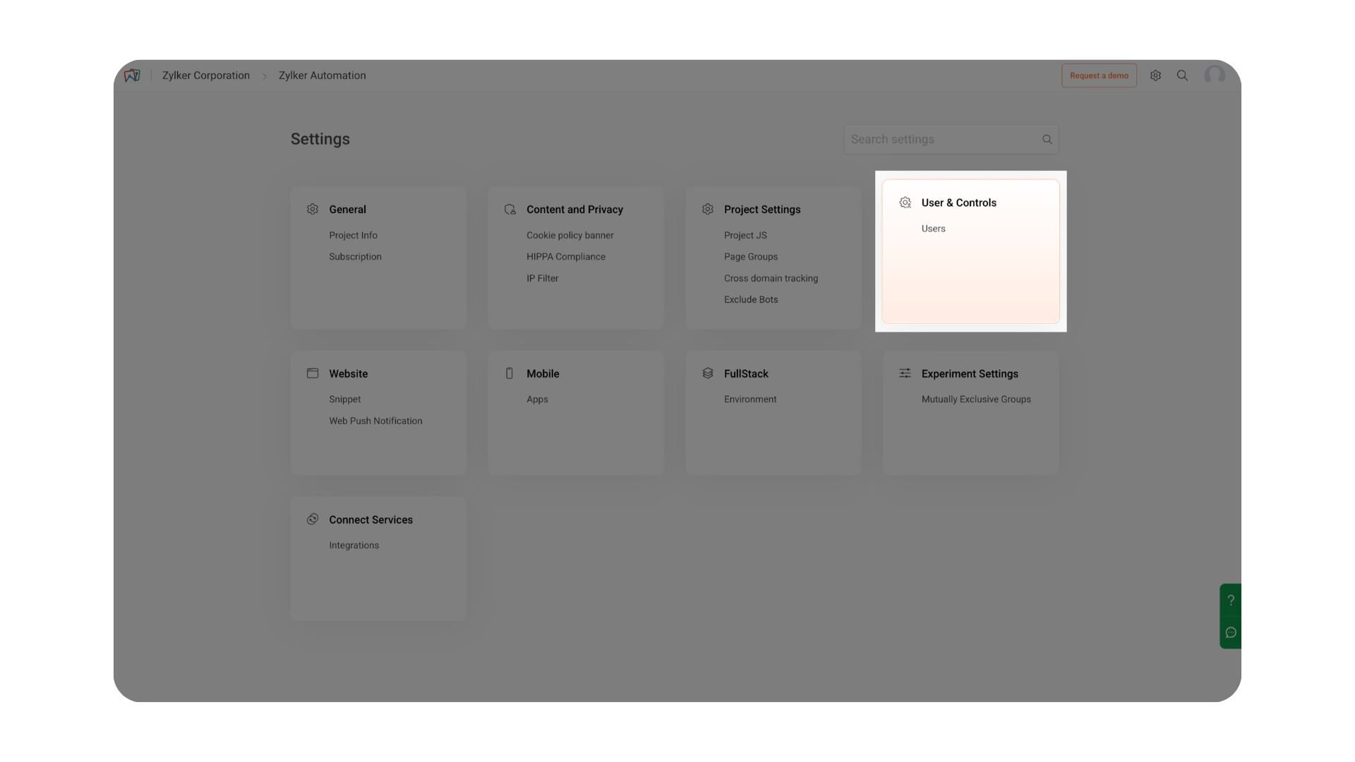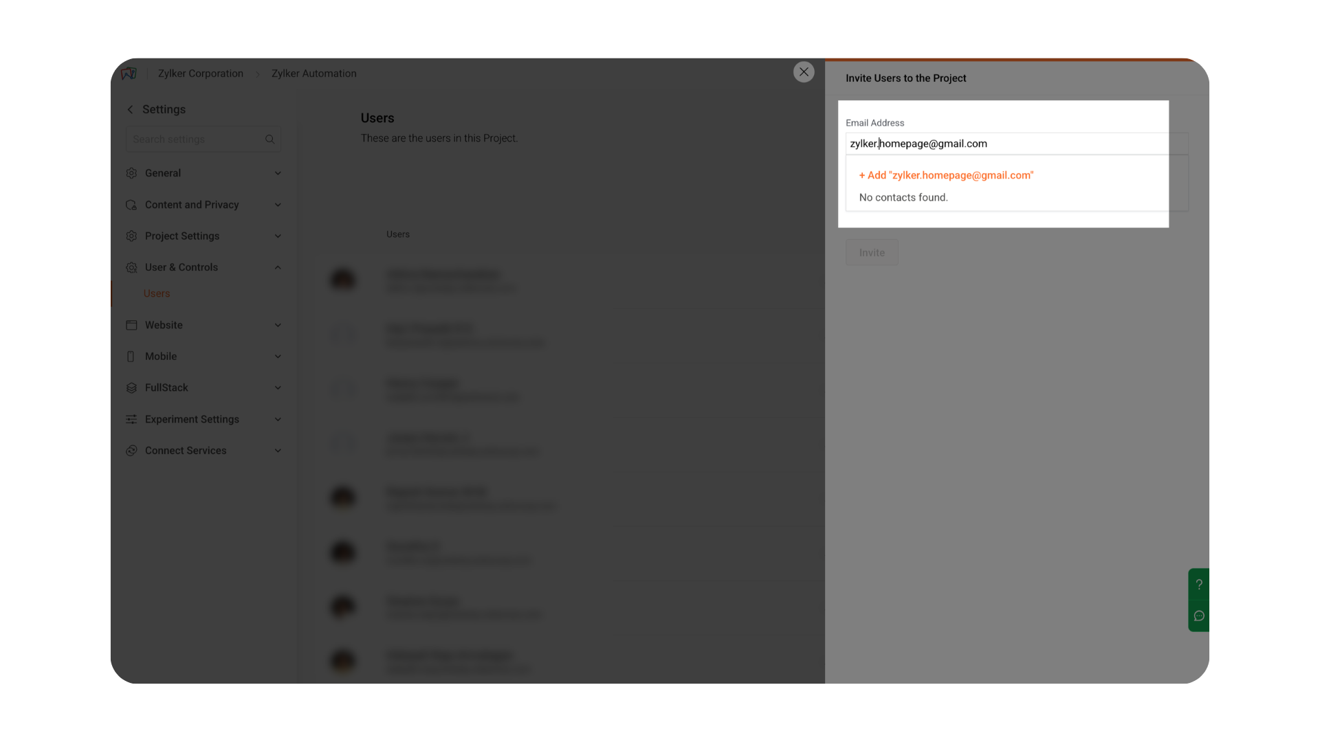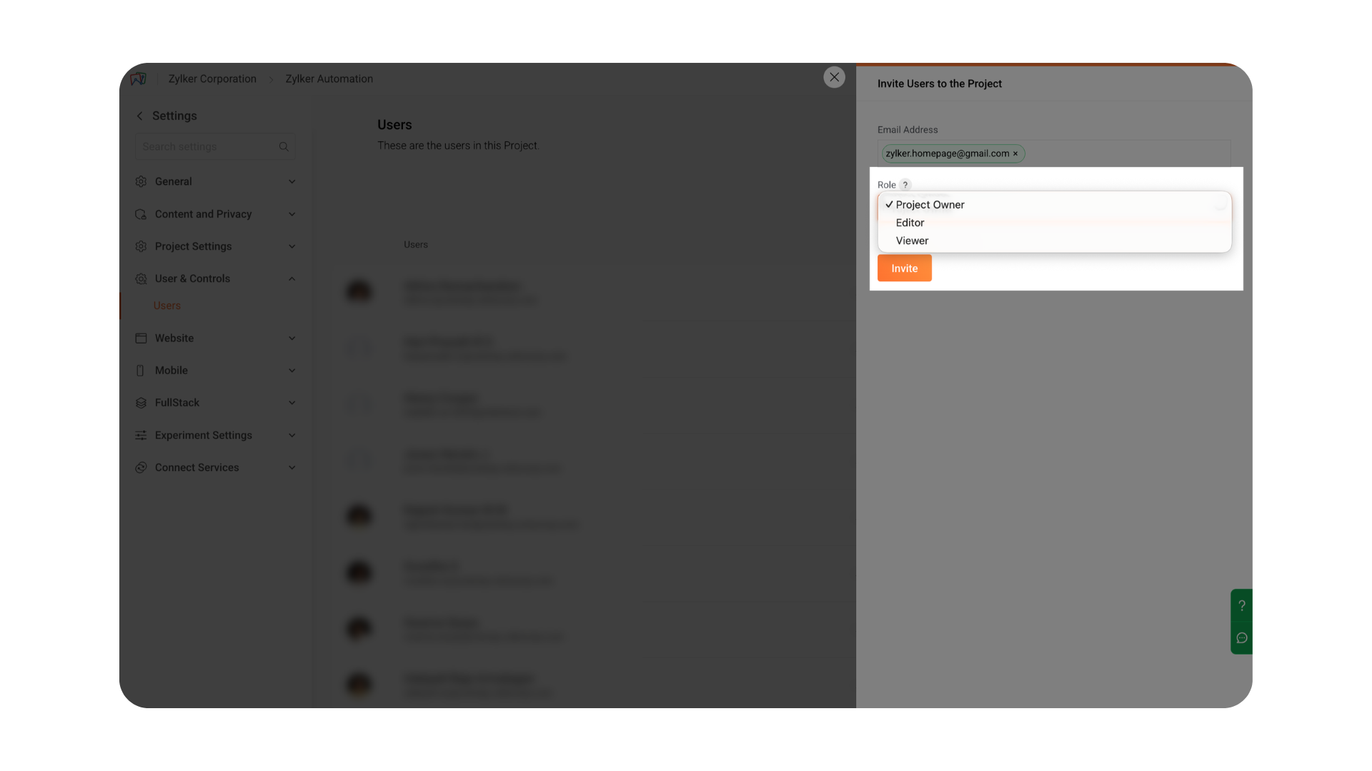 メモ:[設定] アイコンは、PageSense の画面右上にあります。そこから[ユーザー & コントロール] → [ユーザー]へ移動して、プロジェクトユーザーを管理できます。