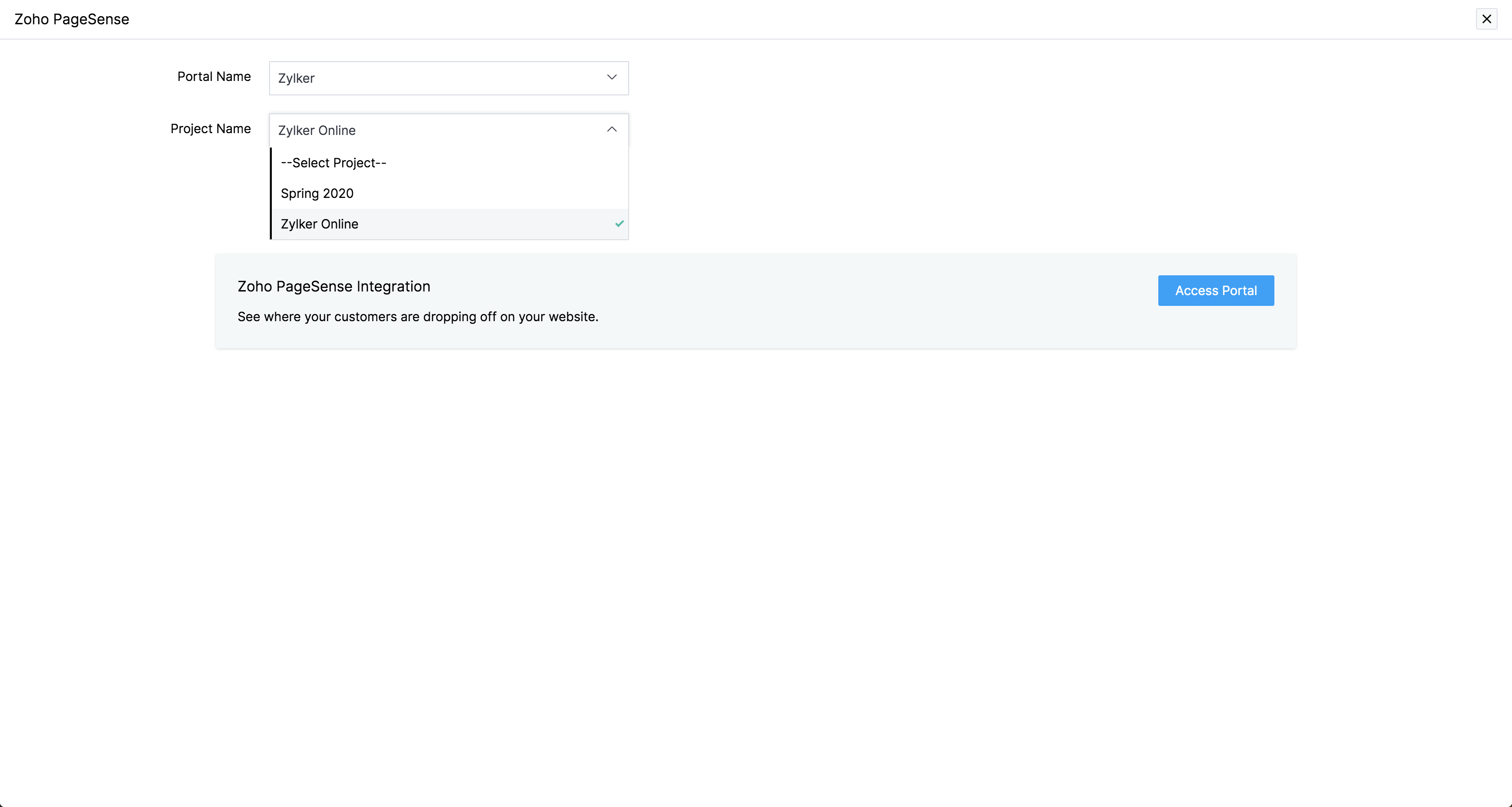 4.  次に、 プロジェクト  名前ドロップダウンメニューを使って、Zoho PageSenseでアクセスしたいプロジェクトを選択します。