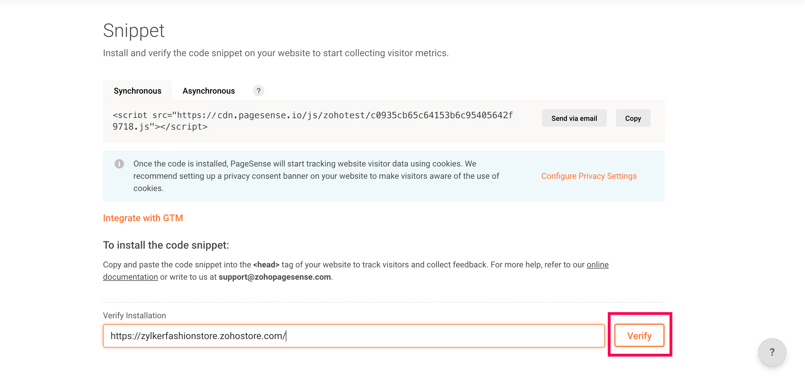 メモ: PageSenseのスニペットがあなたのWebサイトに正常にインストールされたことを確認するために、PageSenseのスニペットタブに移動し、URLテキストボックスにWebページのURLを入力して、以下の図に示すように認証するをクリックします。
