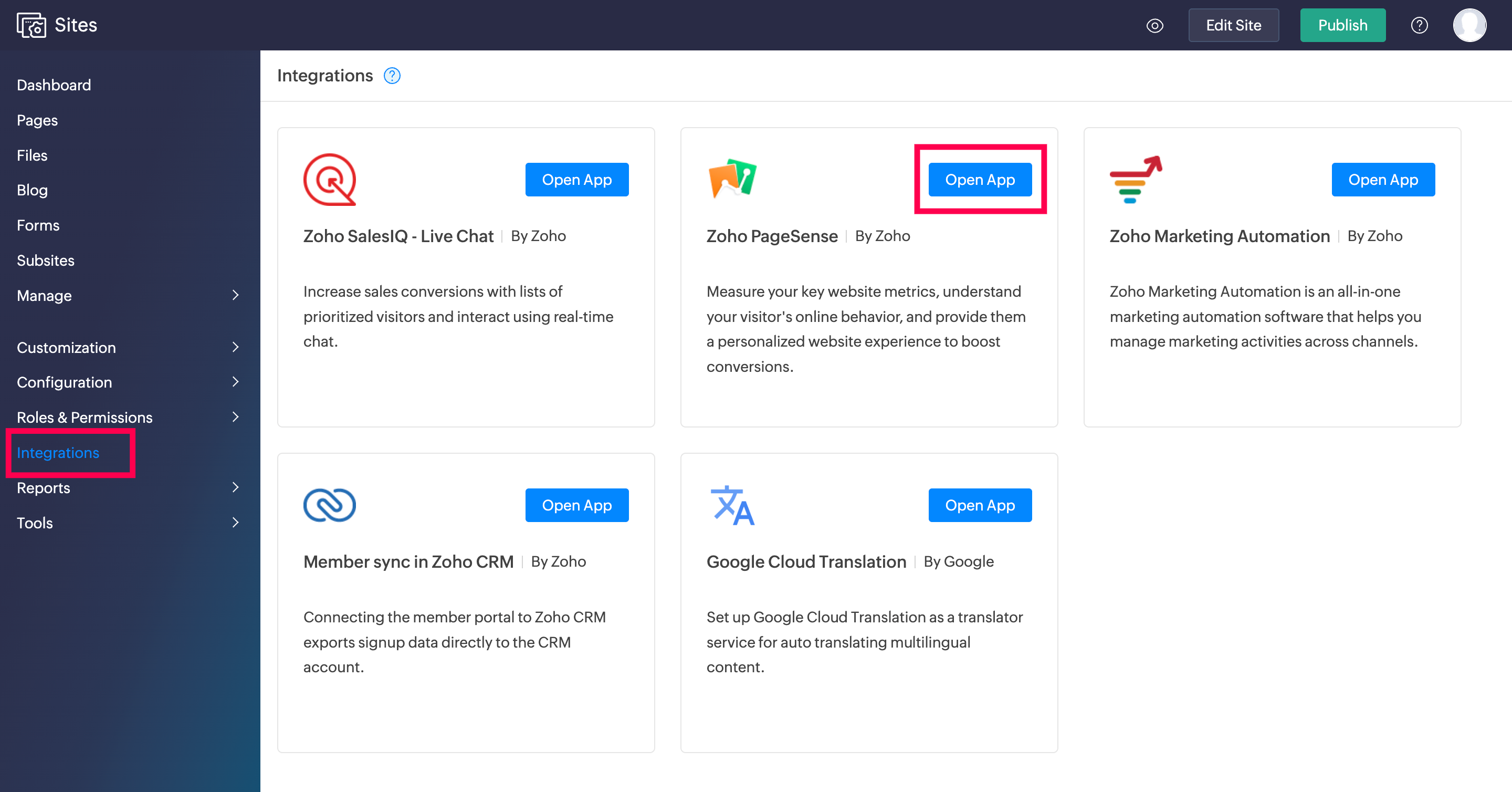 2.  Integrationsを左下でクリックし、次にZoho PageSenseを選択します。
