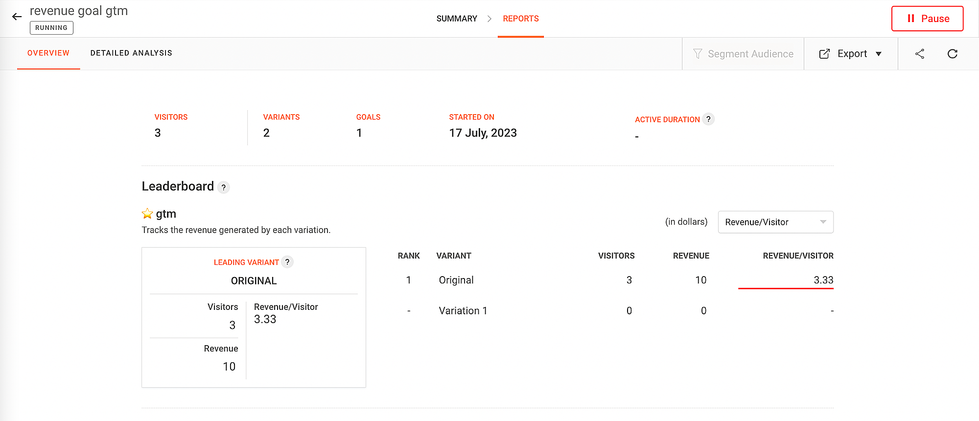 下に表示されているスクリーンショットは、A/Bテストのレポートの見た目です。同様に、Split URLのレポートも表示できます。