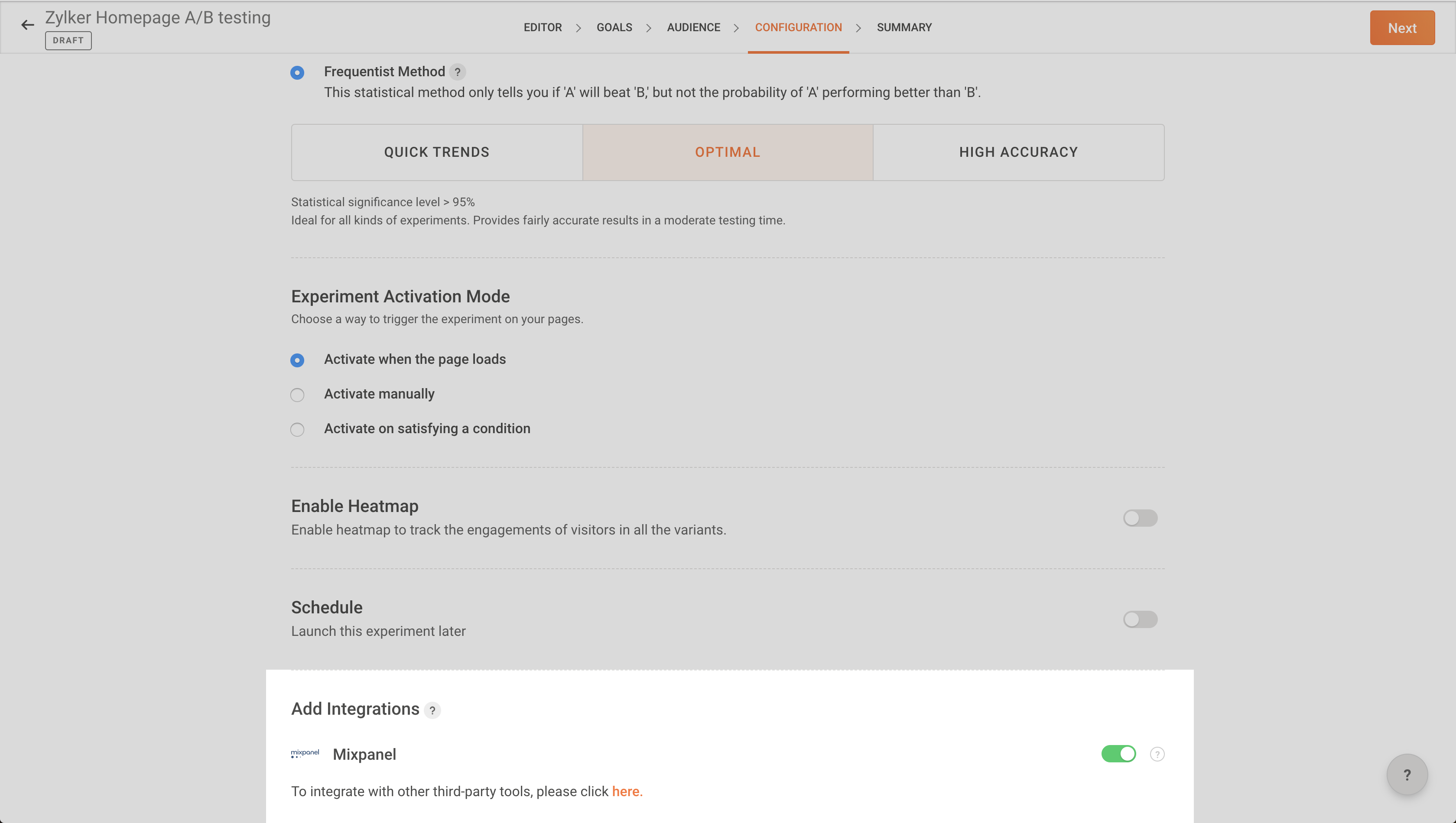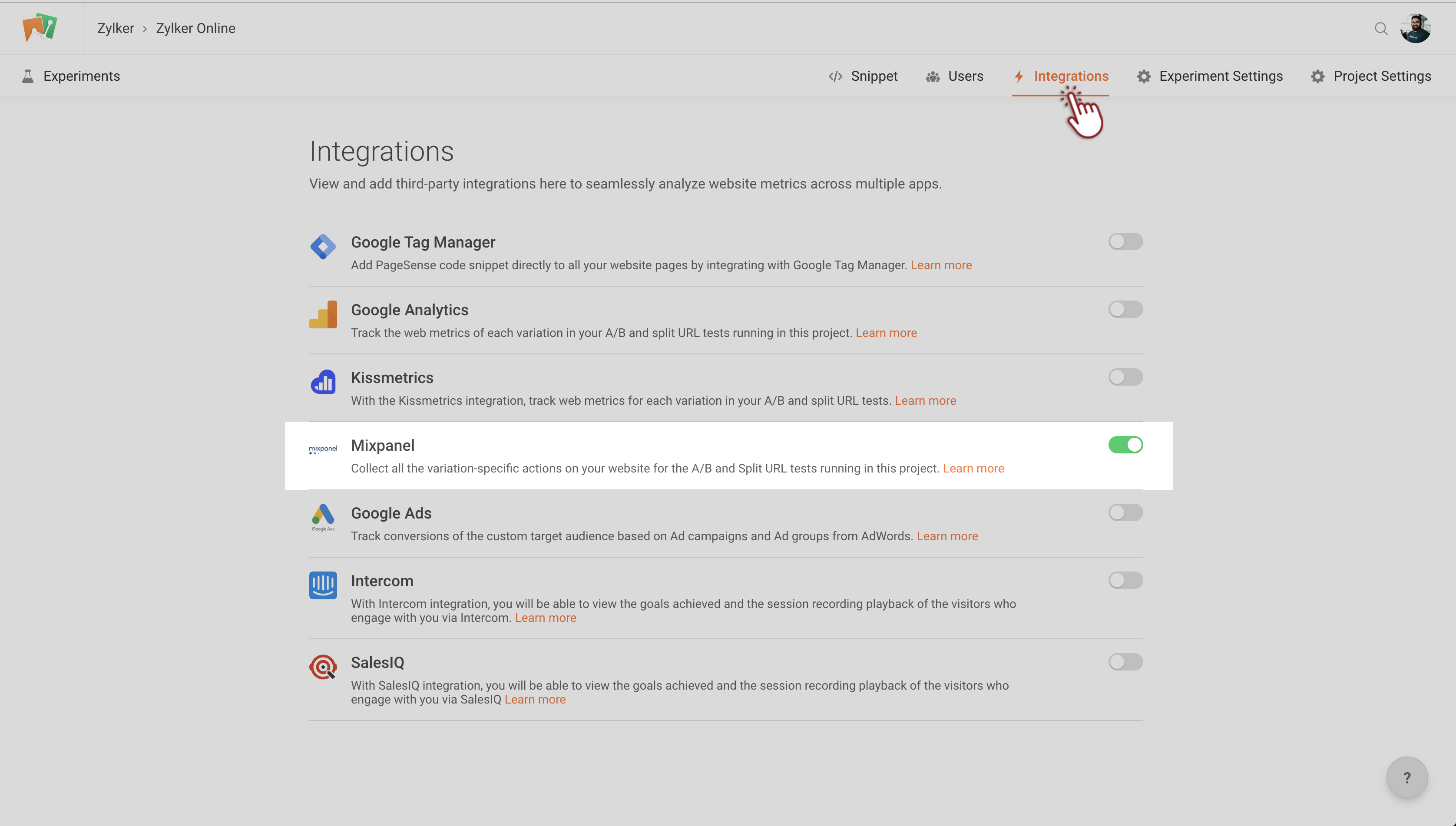 Mixpanel を使用して Webサイトのトラフィックを監視し、顧客がサイトページでどのように行動しているかを分析している場合、PageSense との連携により、A/B および分割 URL 実験データから貴重なインサイトを抽出できます。この連携を有効化すると、すべての A/B および分割 URL 実験データが自動的に Mixpanel レポートに送信され、各実験バリエーションごとの訪問者の行動を詳細に把握できます。