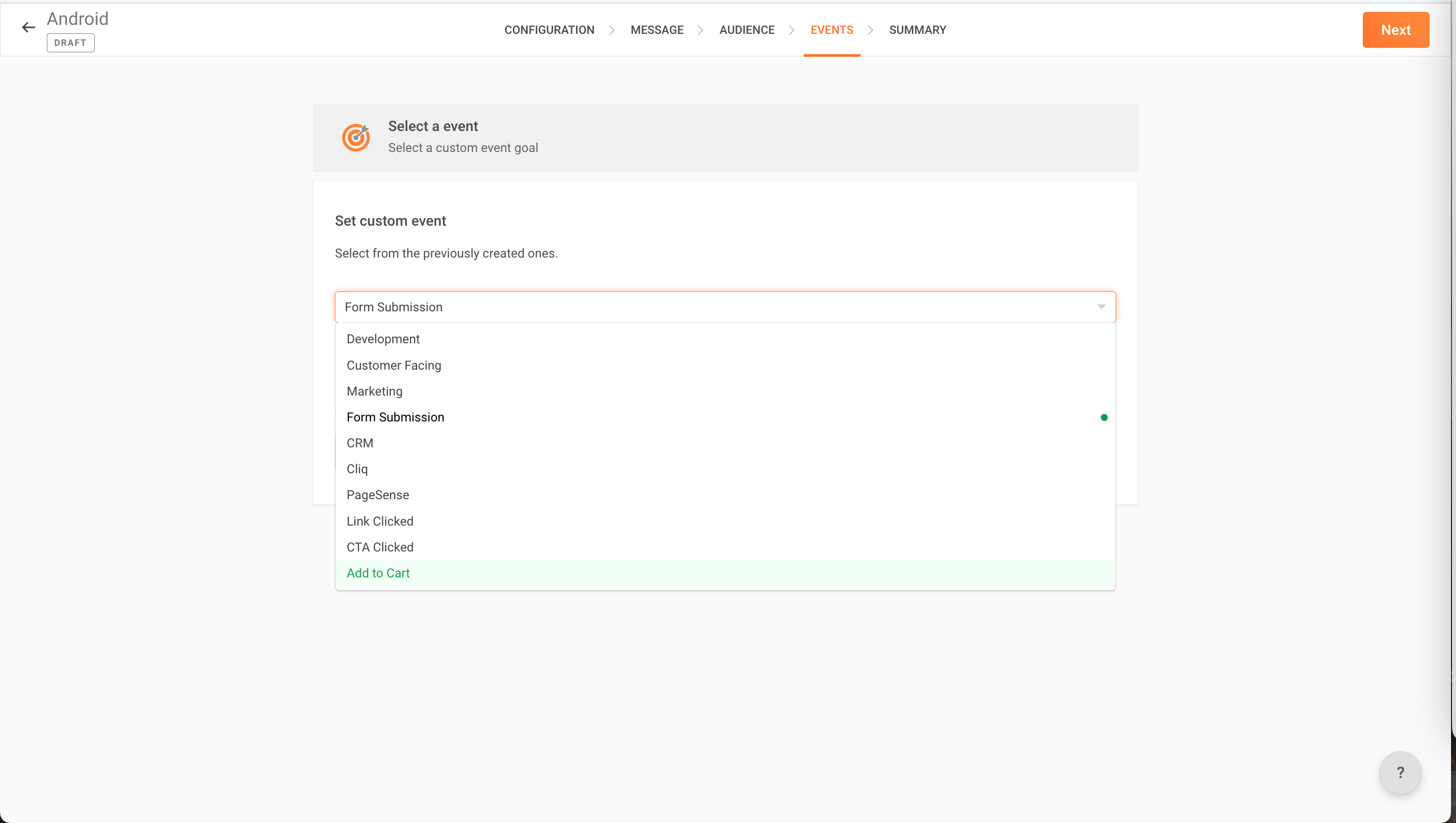 10. このプッシュ通知を介して実行したいカスタムイベントを選択します。
