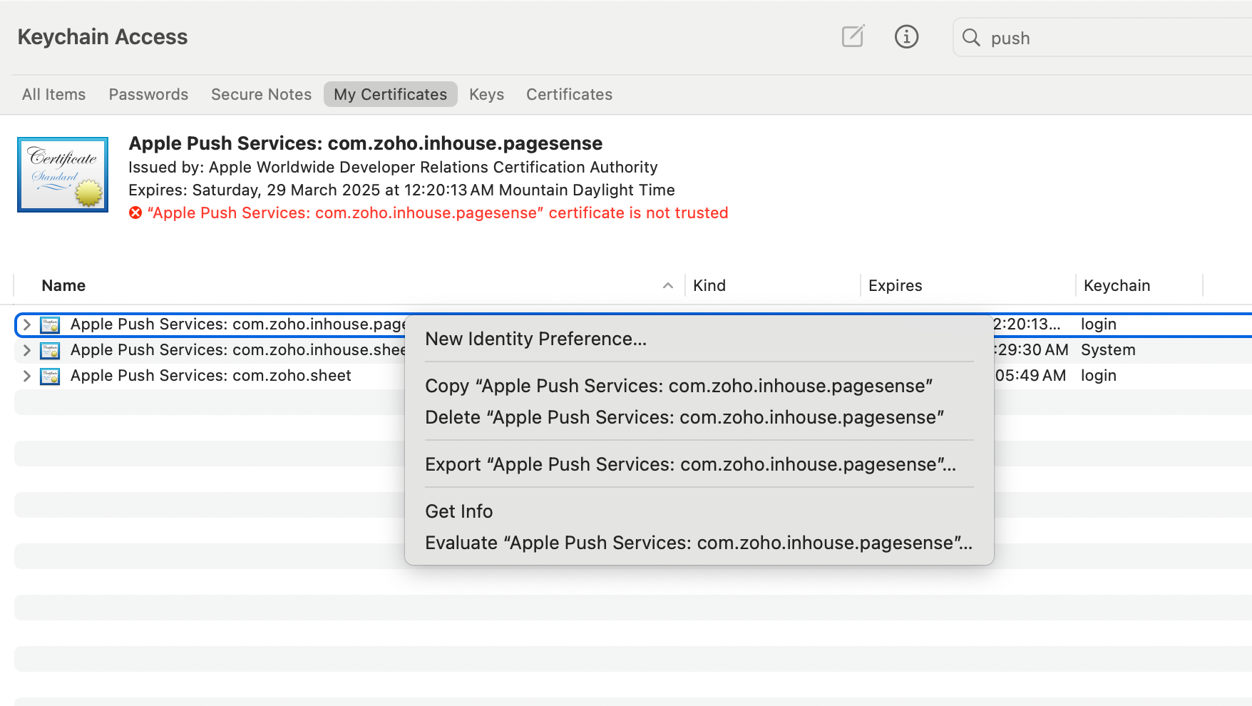 作成された証明書をダウンロードし、キーチェーンアクセス (Keychain Access) アプリケーションで開きます。