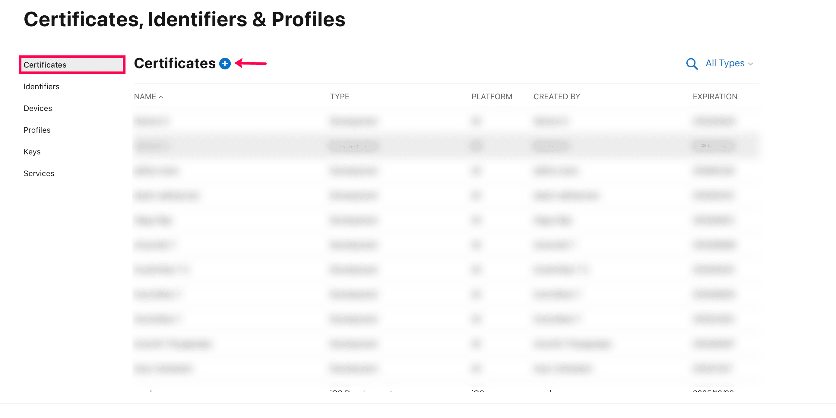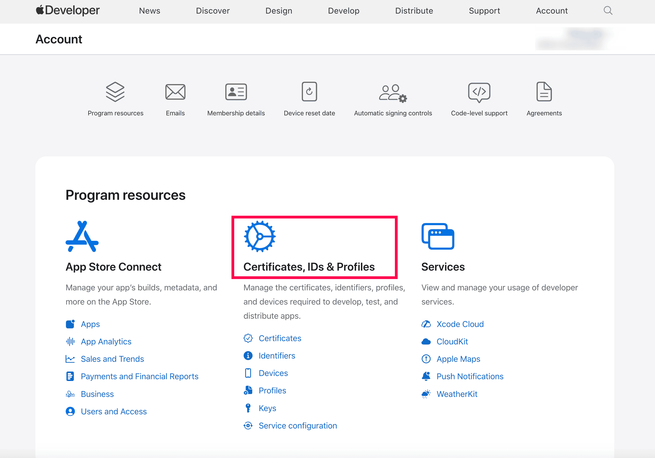 以下にログインします: Apple Developer アカウントにログインし、Program Resourcesタブに移動して、Certificates, Identifiers & Profilesを選択します。