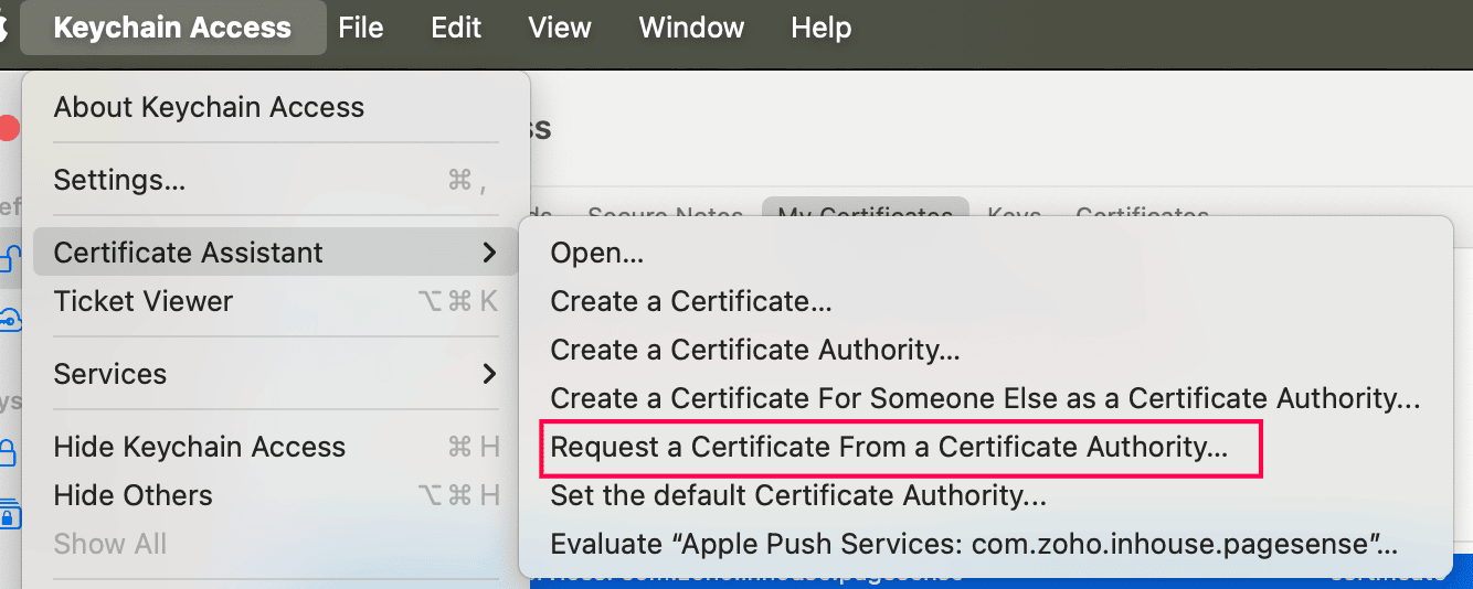 Apple から証明書署名要求(CSR)ファイルのアップロードを求められます。Mac で キーチェーンアクセス (Keychain Access)を開き、証明書アシスタント (Certificate Assistant)に移動します。[認証局に証明書を要求 (Request a Certificate from a Certificate Authority)] を選択します。