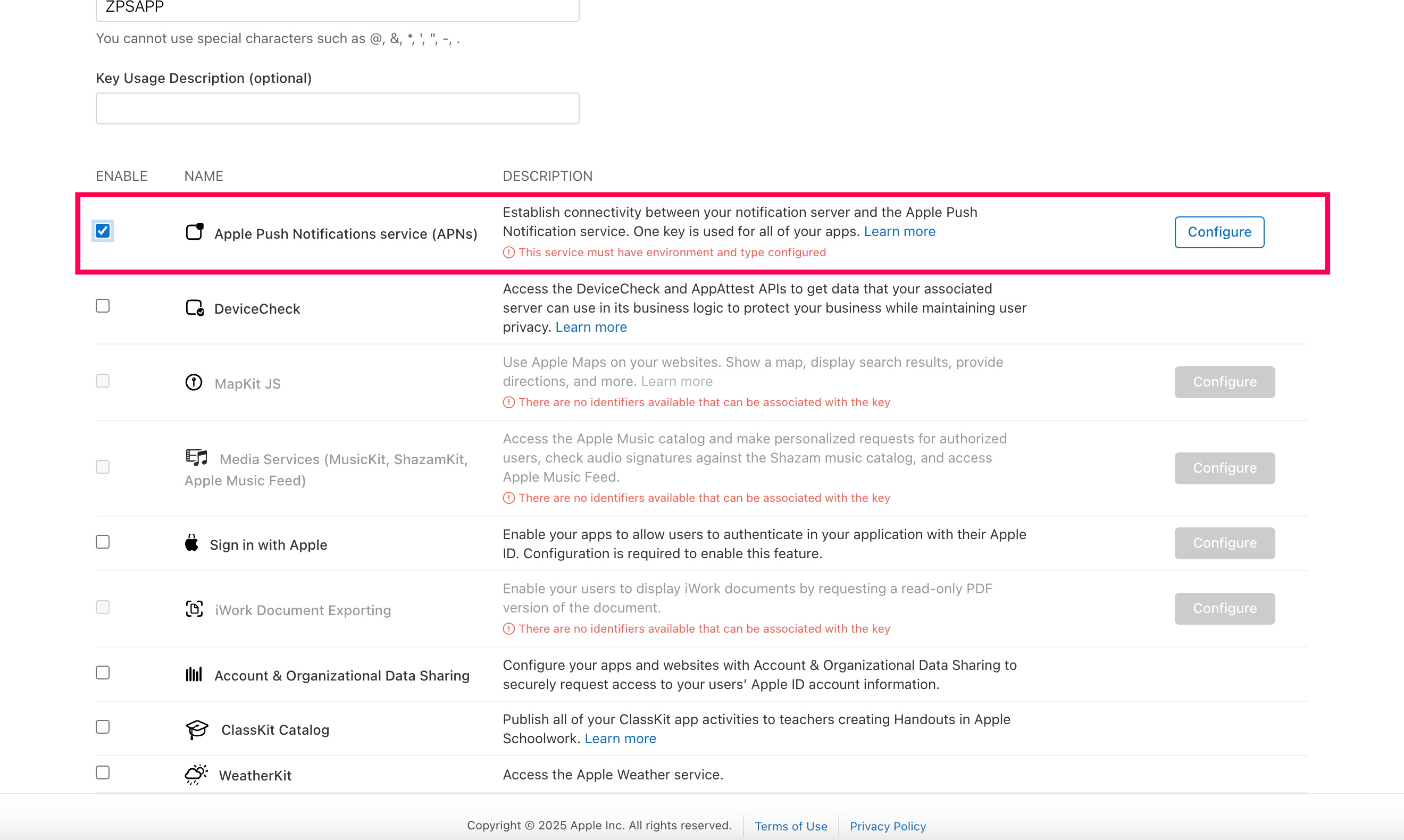 キーの一意の名前を入力し、Apple Push Notification service (APNs) のチェックボックスを選択します。[Continue] をクリックし、続いて [Register] をクリックします。