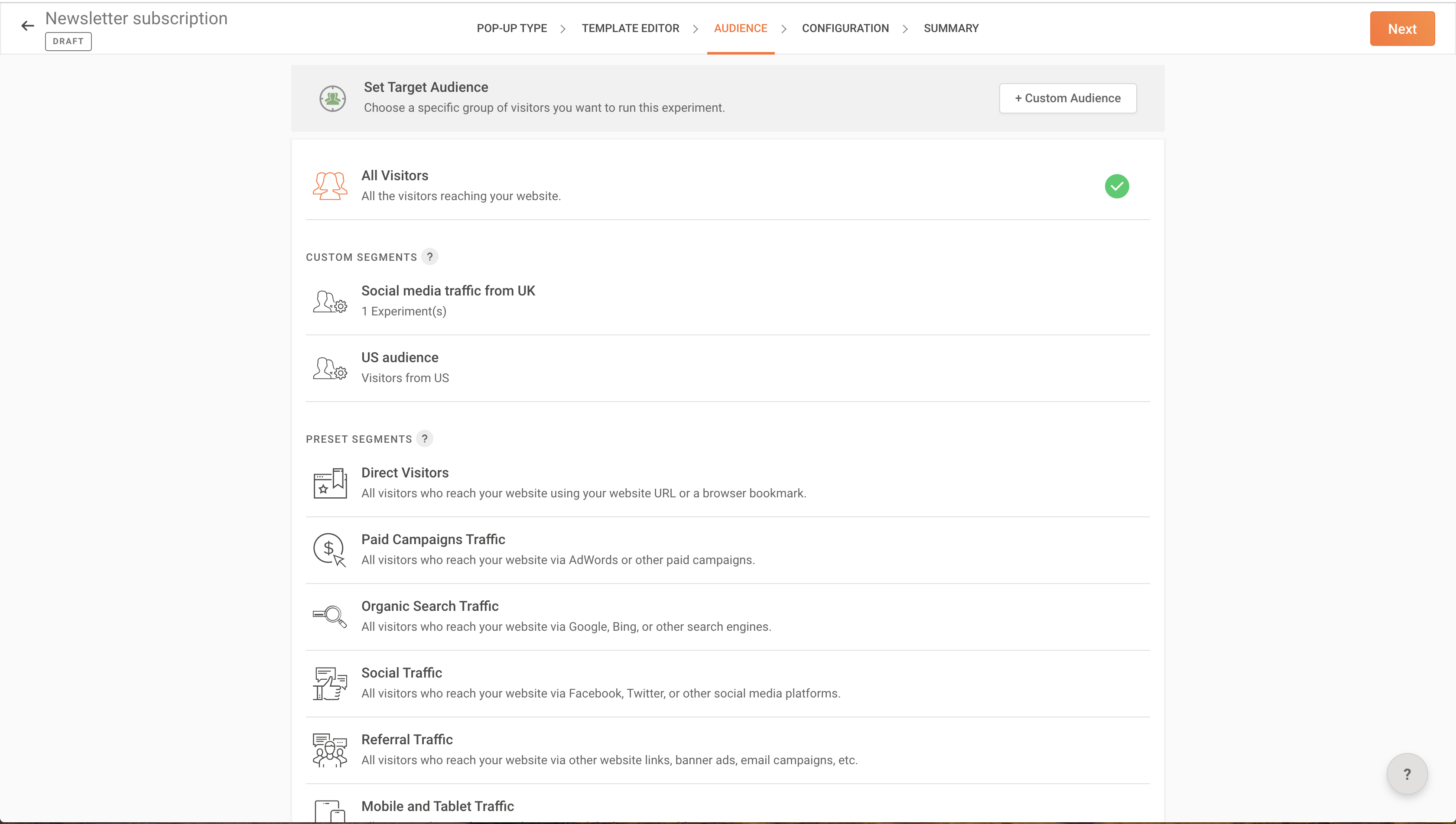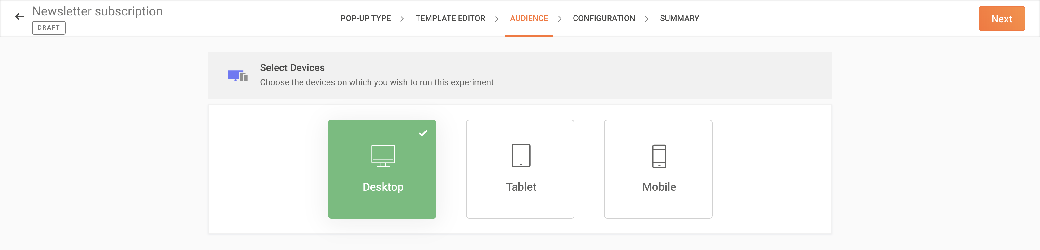 1. AUDIENCEページで、ポップアップを表示するデバイスを選択します。モバイル、デスクトップ、またはタブレットを選択できます。