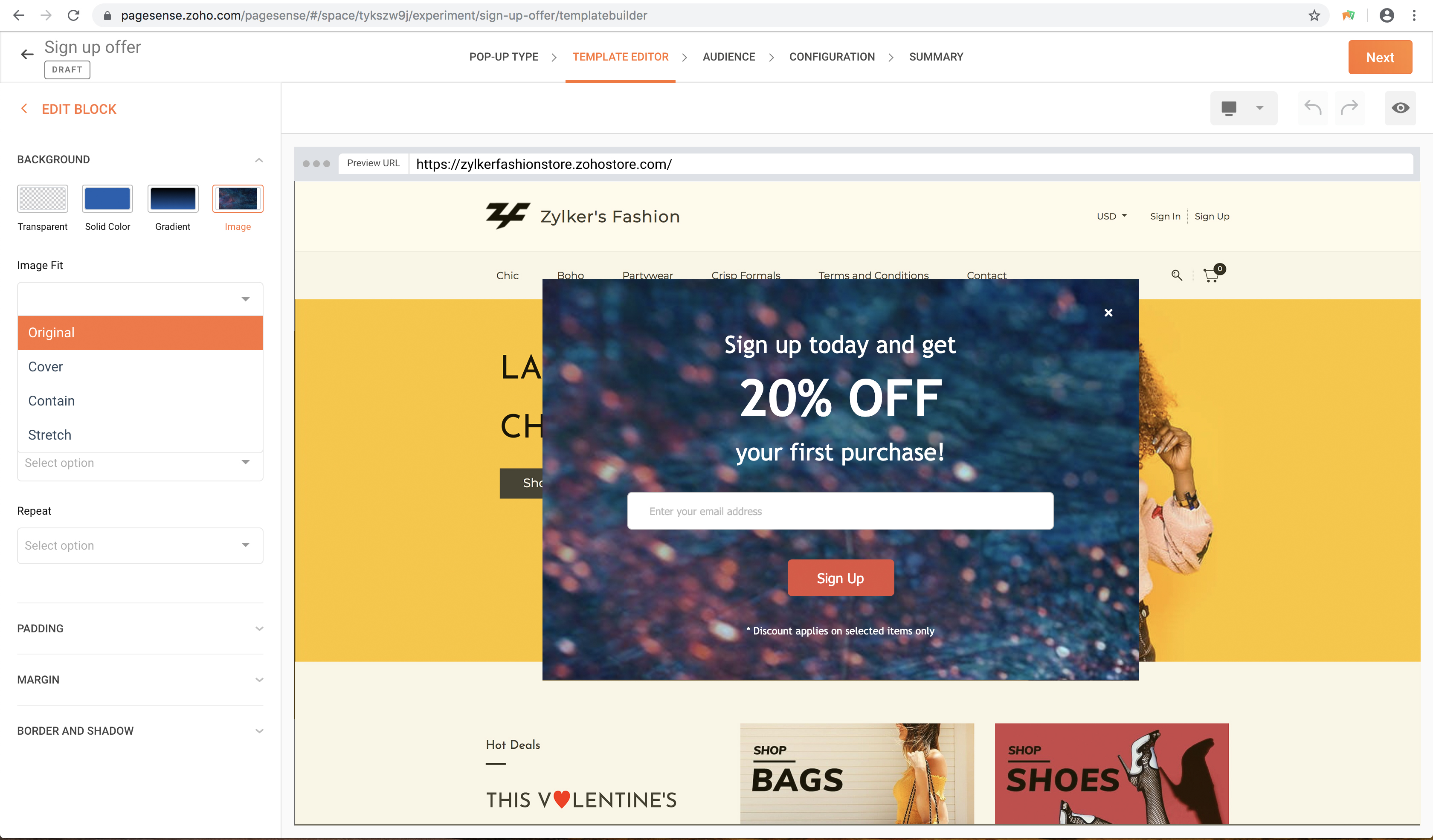 画像: コンピュータから画像を選択して、ポップアップの背景に適用します。