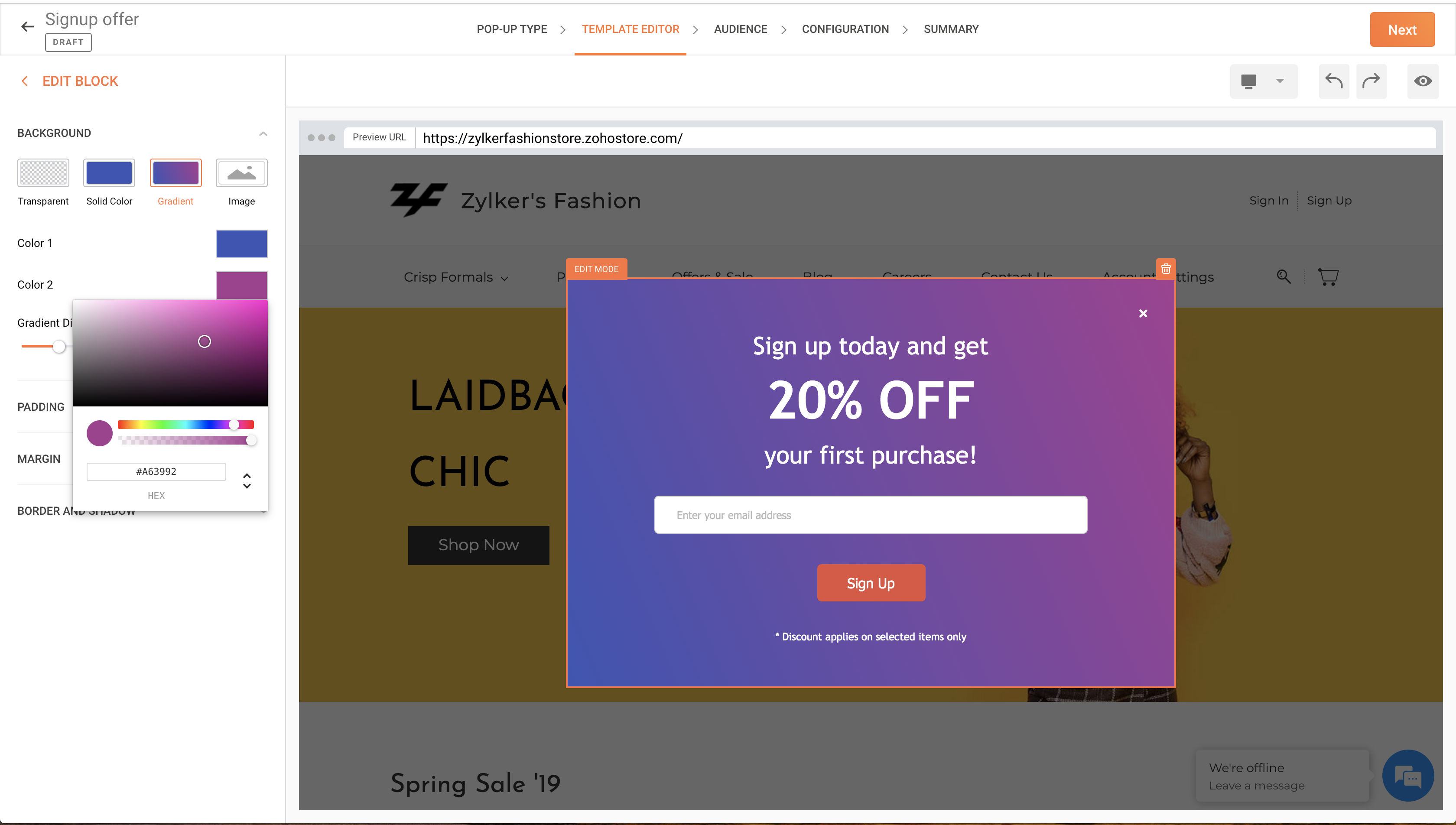 単色: ポップアップに一様な単一の色を適用するには、カラーピッカーをクリックします。