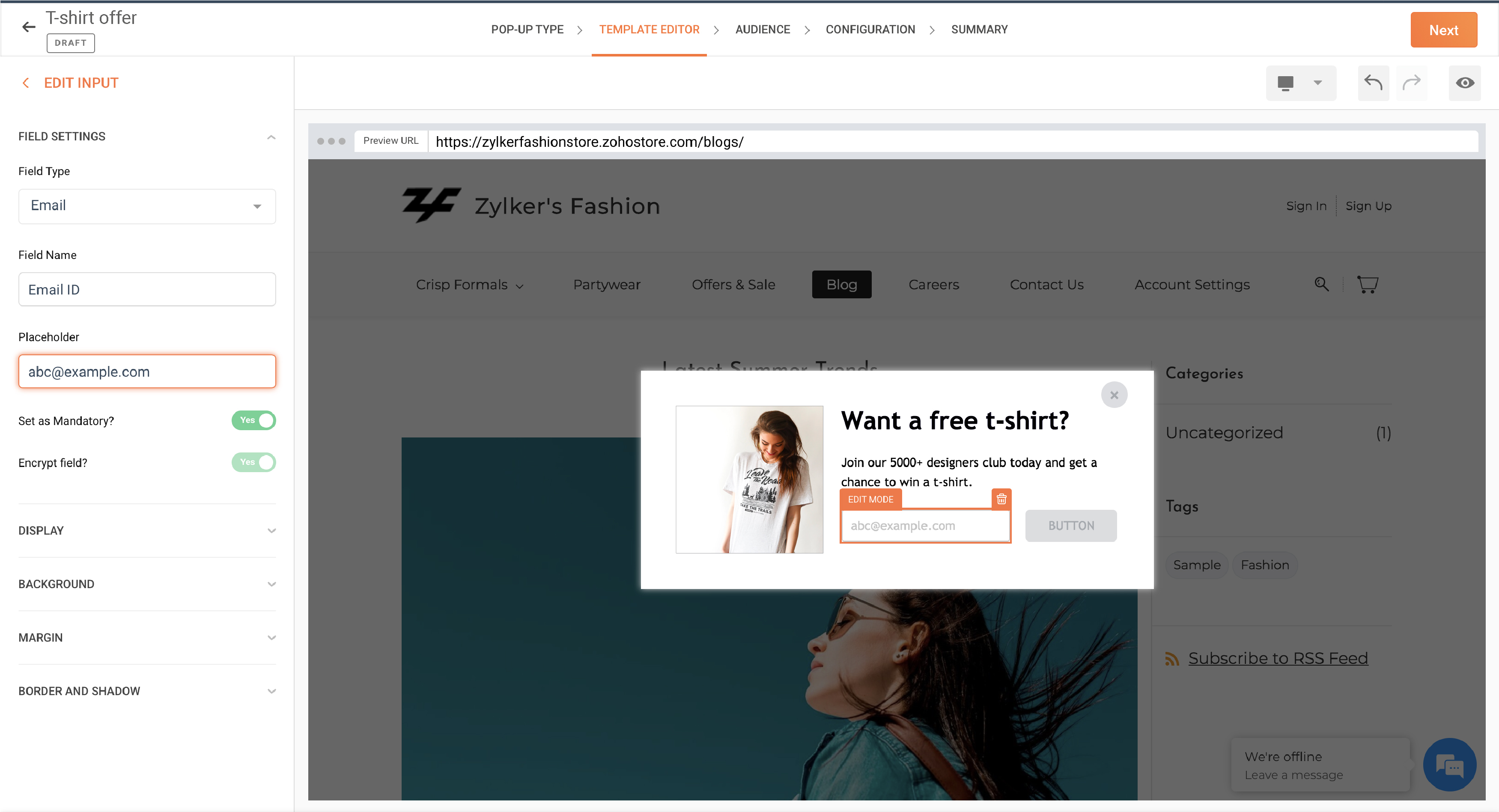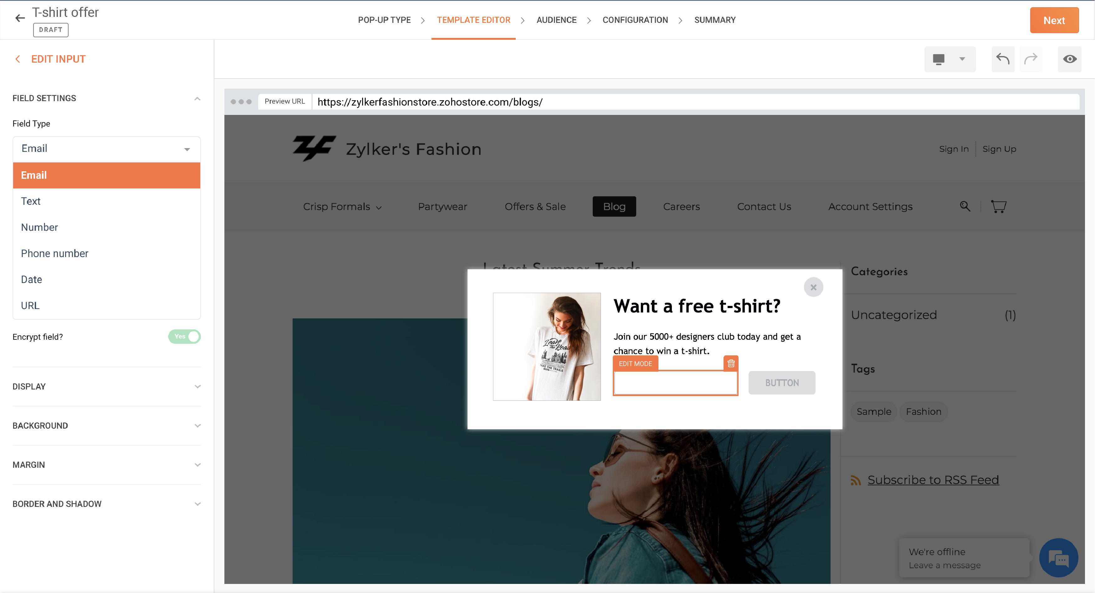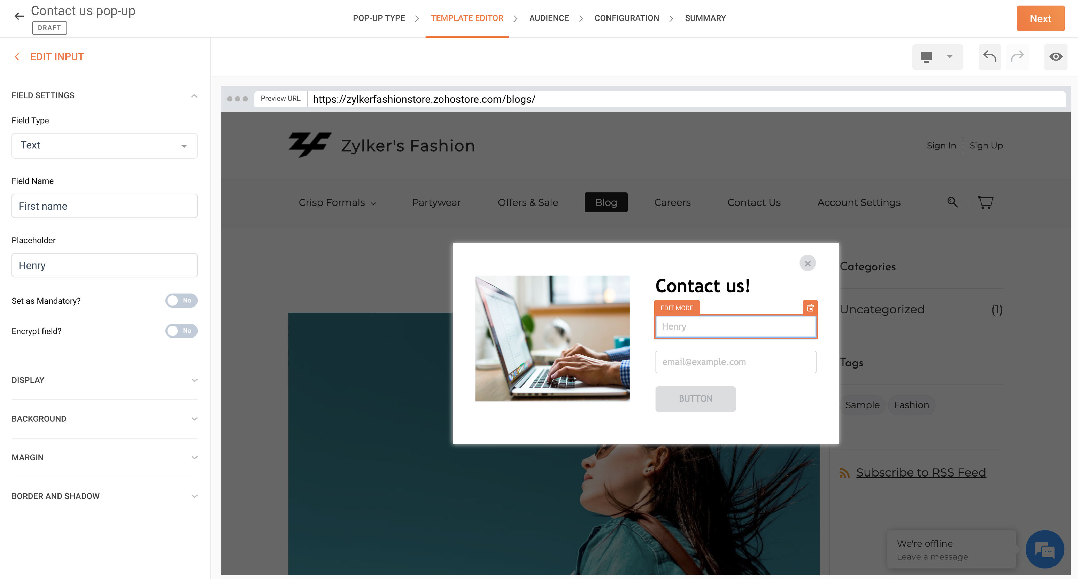 ファーストネーム、ラストネーム、メールアドレス、連絡先番号、URL、および日付などの入力フィールドは、ポップアップでのお客様の詳細情報の収集や将来の取引のための接触手段として最適な方法の一つです。これらは、ニュースレターの登録フォーム、サインアップフォーム、およびオファーフォームで効果的に使用することで、より良いメールリストの構築とビジネスの拡大を図ることができます。