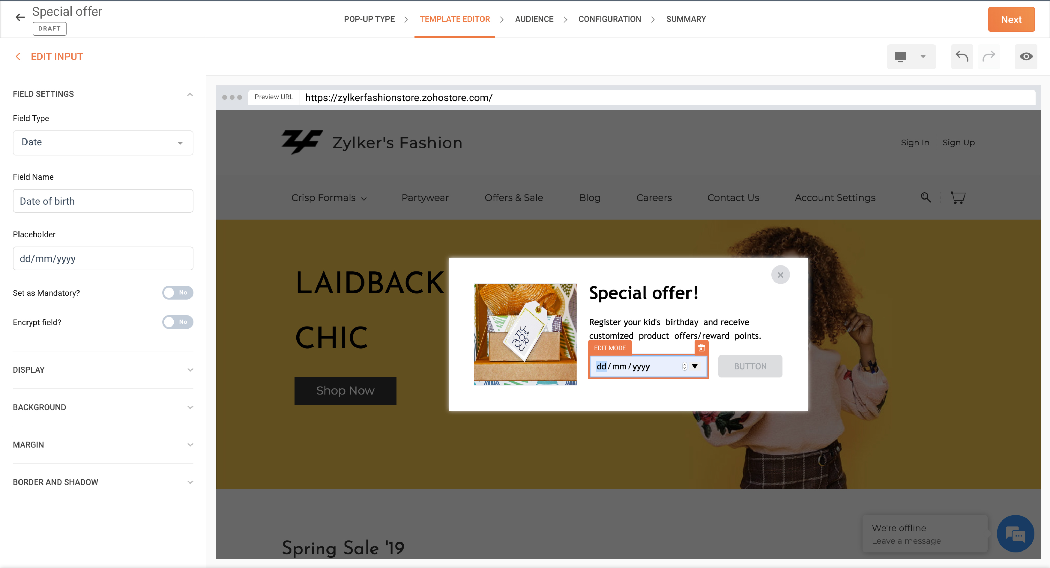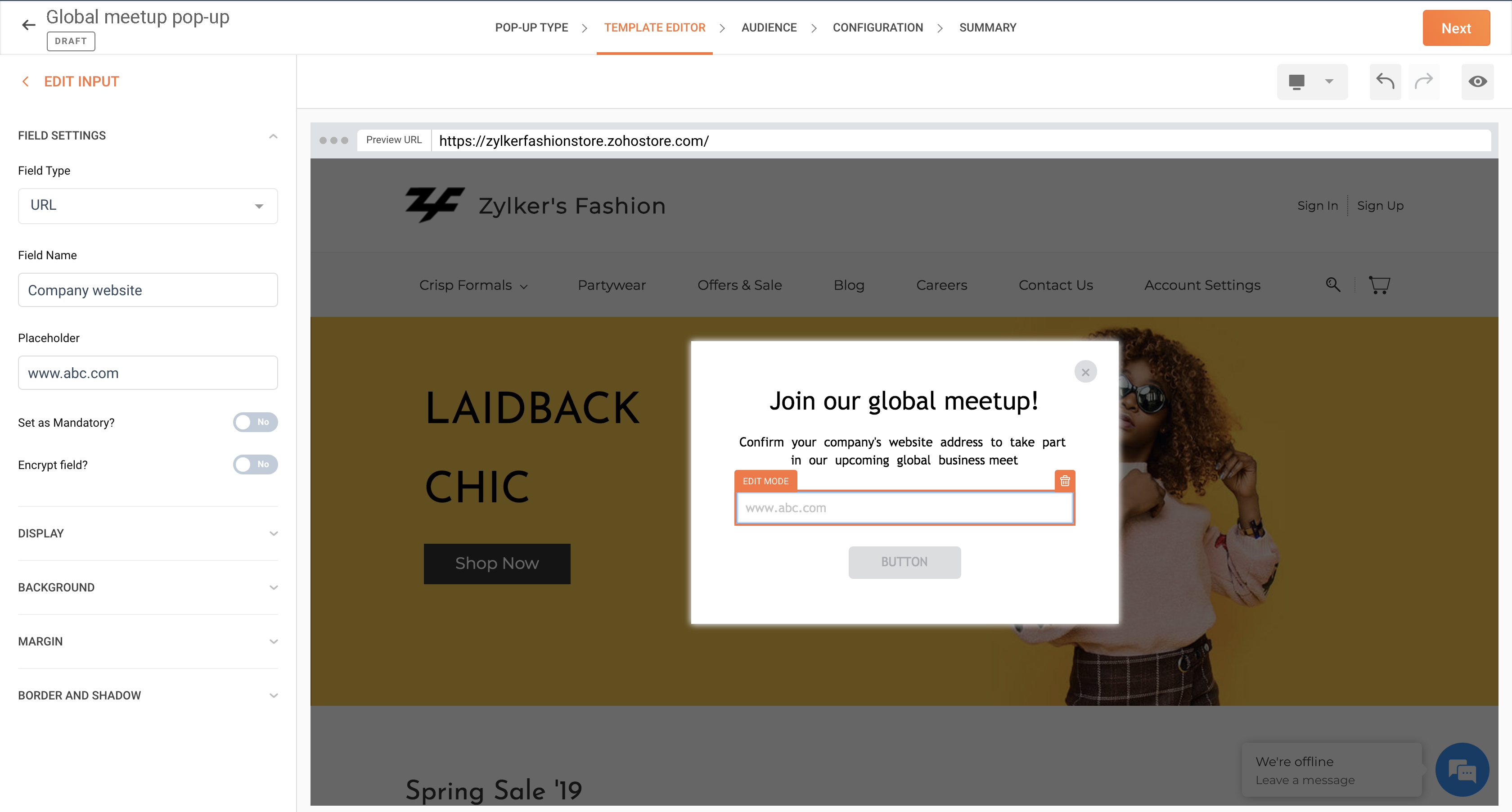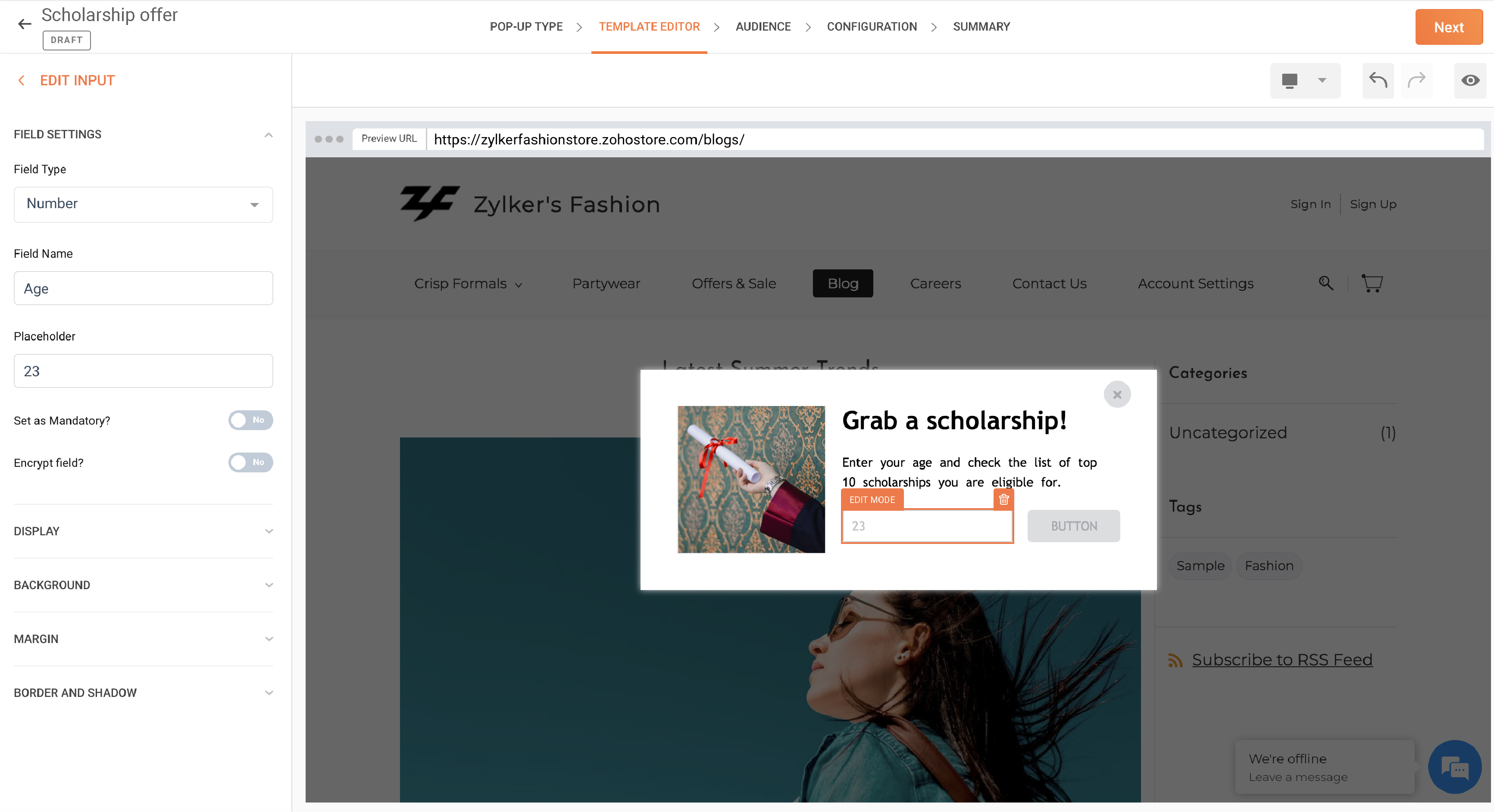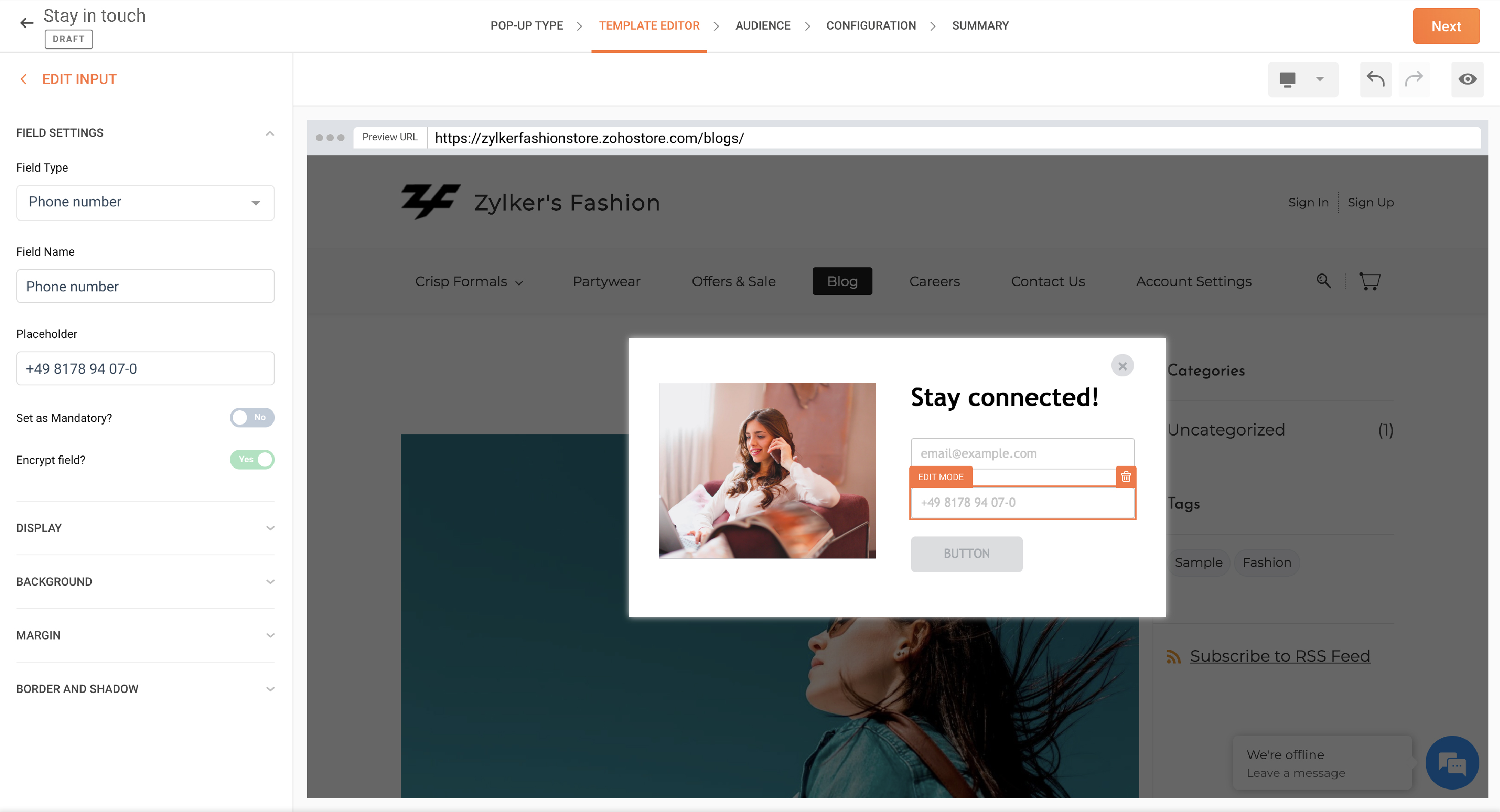 ファーストネーム、ラストネーム、メールアドレス、連絡先番号、URL、および日付などの入力フィールドは、ポップアップでのお客様の詳細情報の収集や将来の取引のための接触手段として最適な方法の一つです。これらは、ニュースレターの登録フォーム、サインアップフォーム、およびオファーフォームで効果的に使用することで、より良いメールリストの構築とビジネスの拡大を図ることができます。