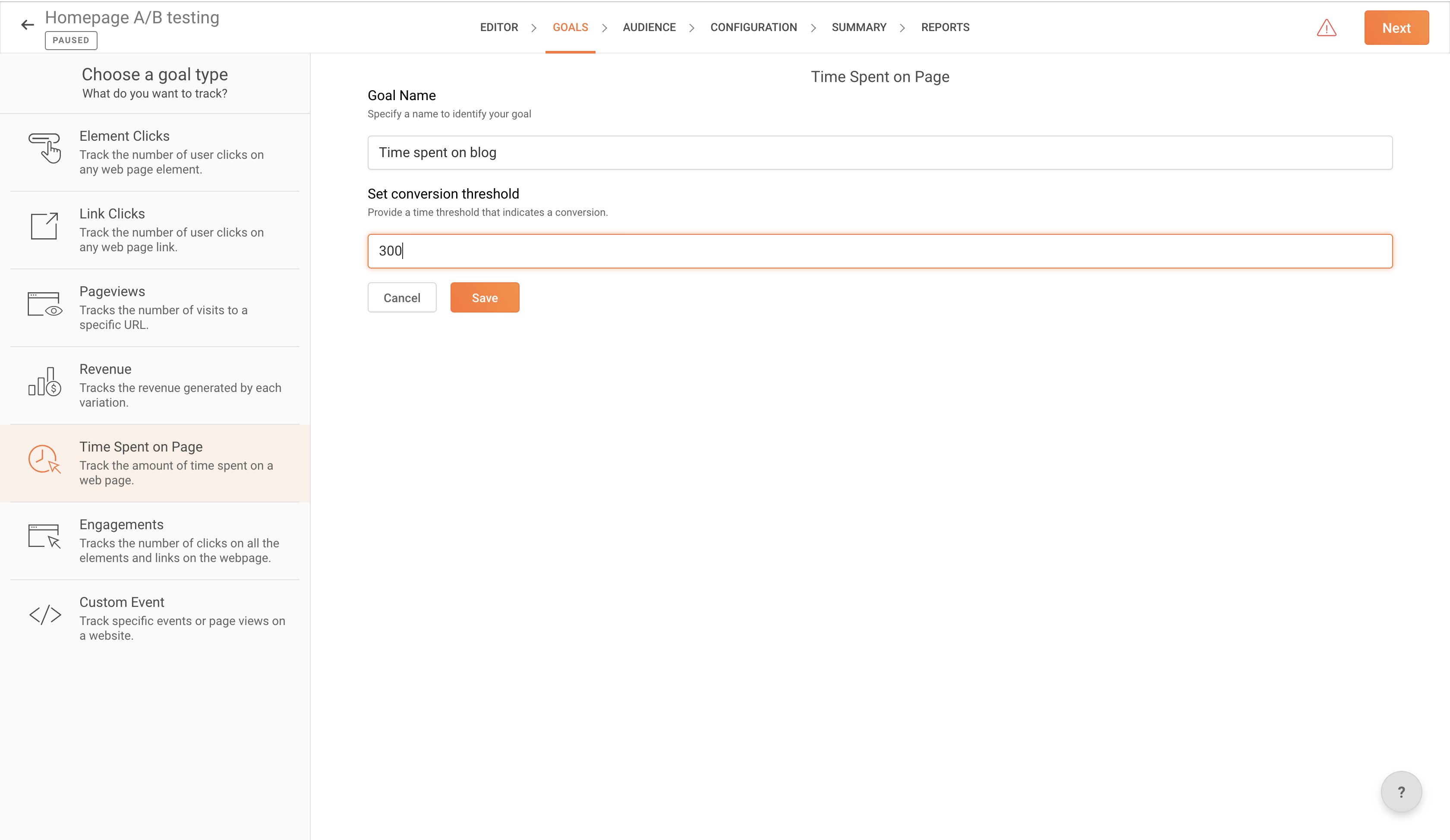 2. 左側のペインからページ滞在時間を選択し、テキストボックスに目標の説明的な名前を入力します。