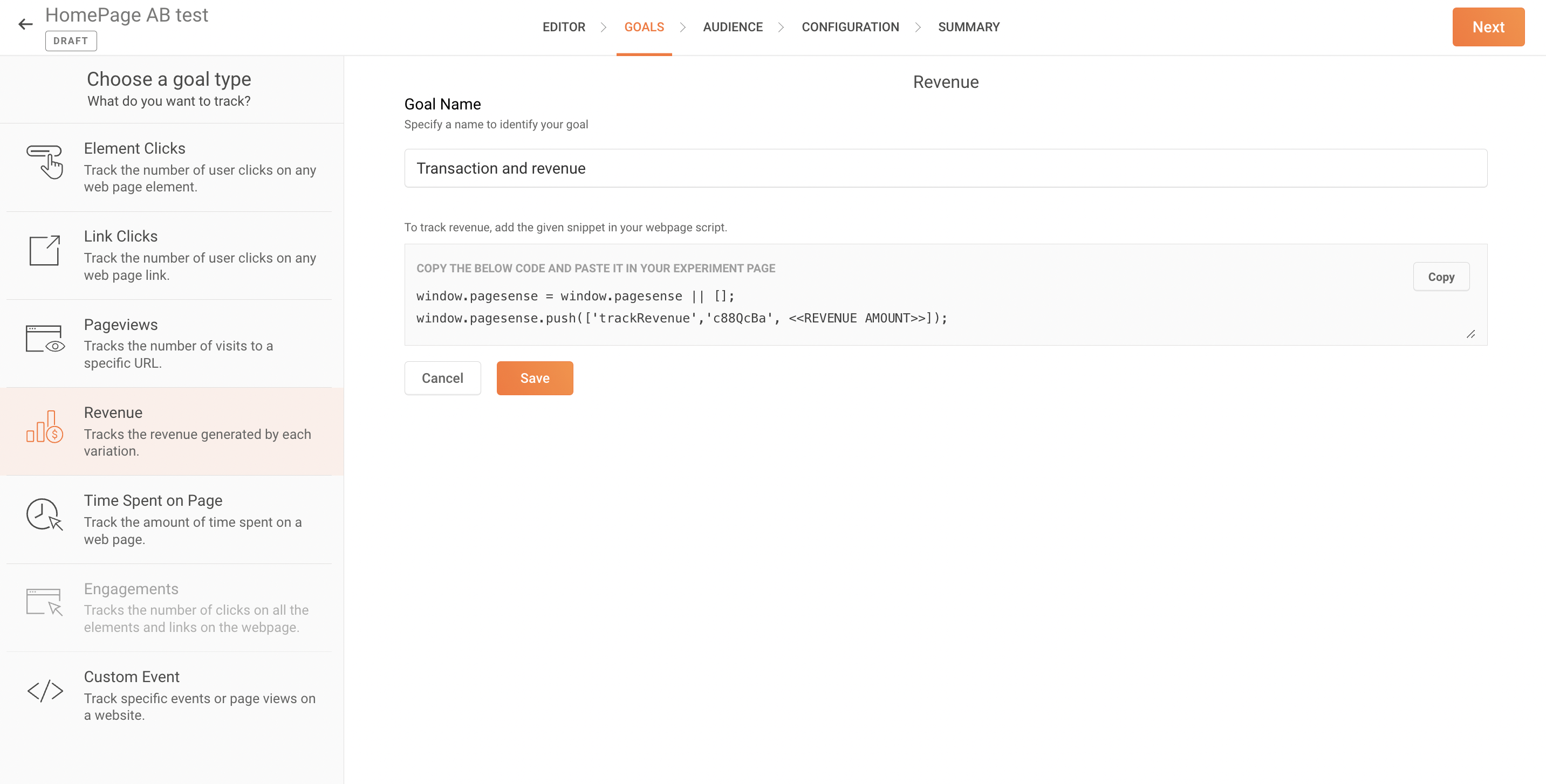 1. A/B または分割 URL テストのGOALSタブに移動し、+ 新規 Goalをクリックします。