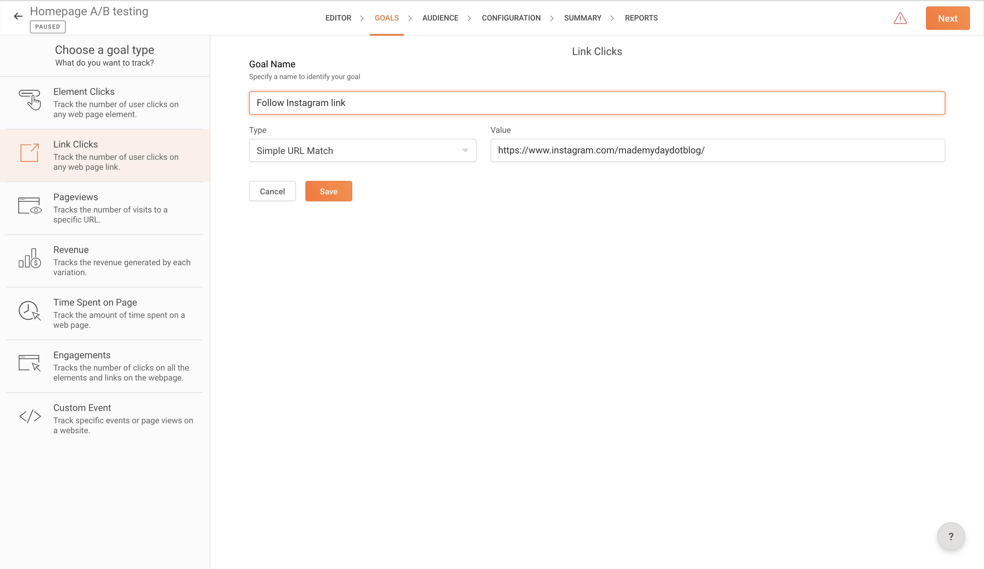 Zoho PageSenseのA/Bテストでは、'リンククリック'ゴールを作成することができます。このゴールでは、ウェブページのどの場所がリンクのクリック数とコンバージョン率を最大化するかをテストすることができます。このゴールタイプでは、異なる目的地ページにリンクするハイパーリンクをクリックした訪問者の数を追跡することができます。たとえば、製品の販売ページへのリンク、メールリストへの登録、またはソーシャルメディアページのフォローなどです。同じリンクの2つの異なる配置をテストし、どの配置が最も高いクリック率を引き寄せるかを判断するテストを実行することもできます。テストが終了したら、最適な配置を採用し、より高いクリック率を享受することができます。複数のページでゴールを追跡するために、異なるURLマッチタイプを使用することもできます。