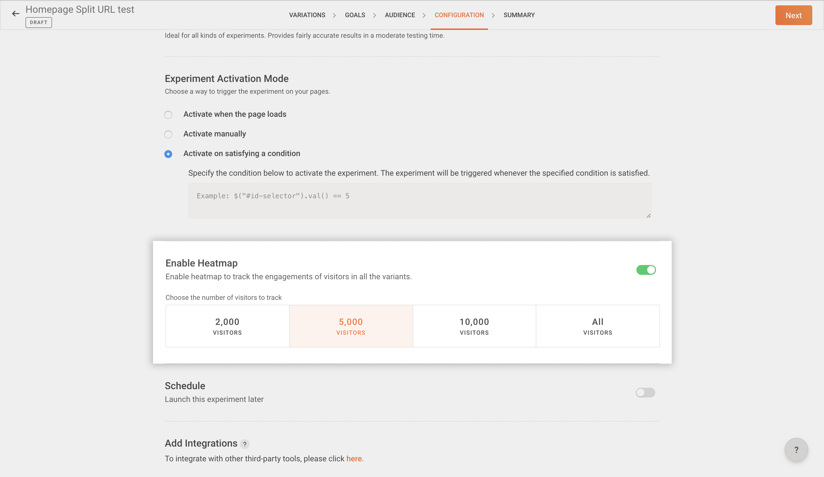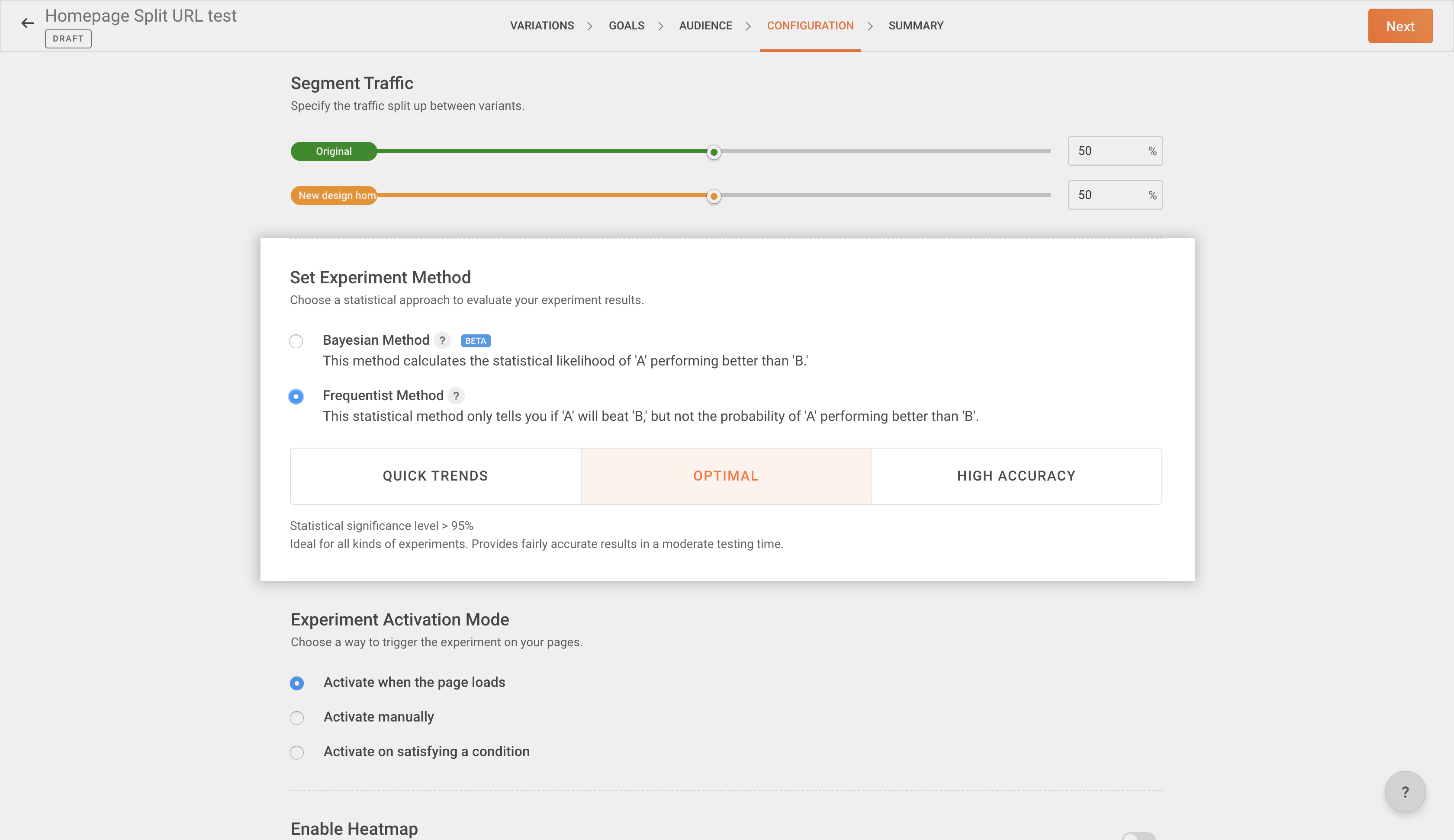 ヒートマップレポートを生成する: ヒートマップボタンを有効にすると、バリエーションとオリジナルページの異なるセクションでの訪問者のエンゲージメントを確認できます。
