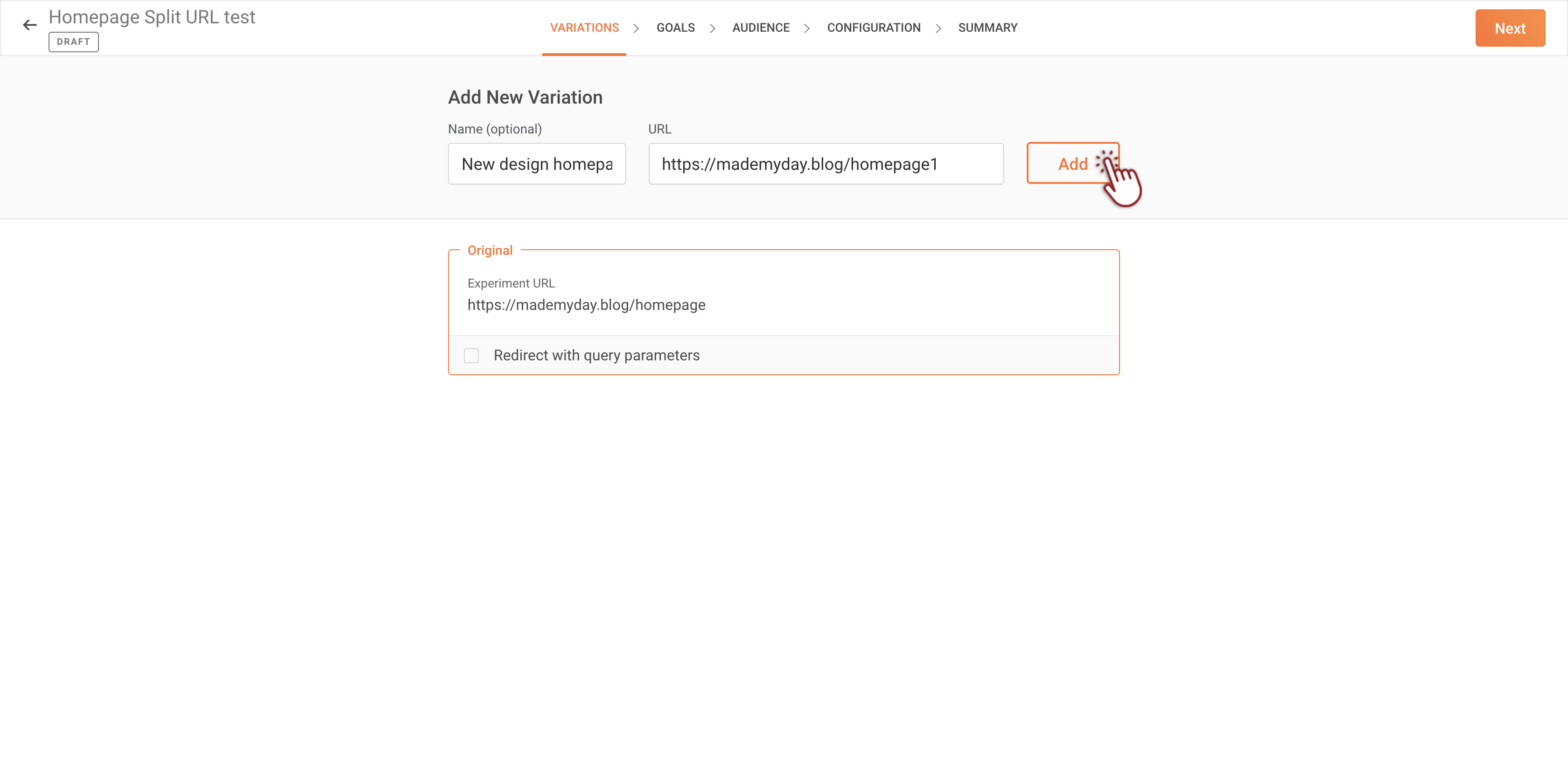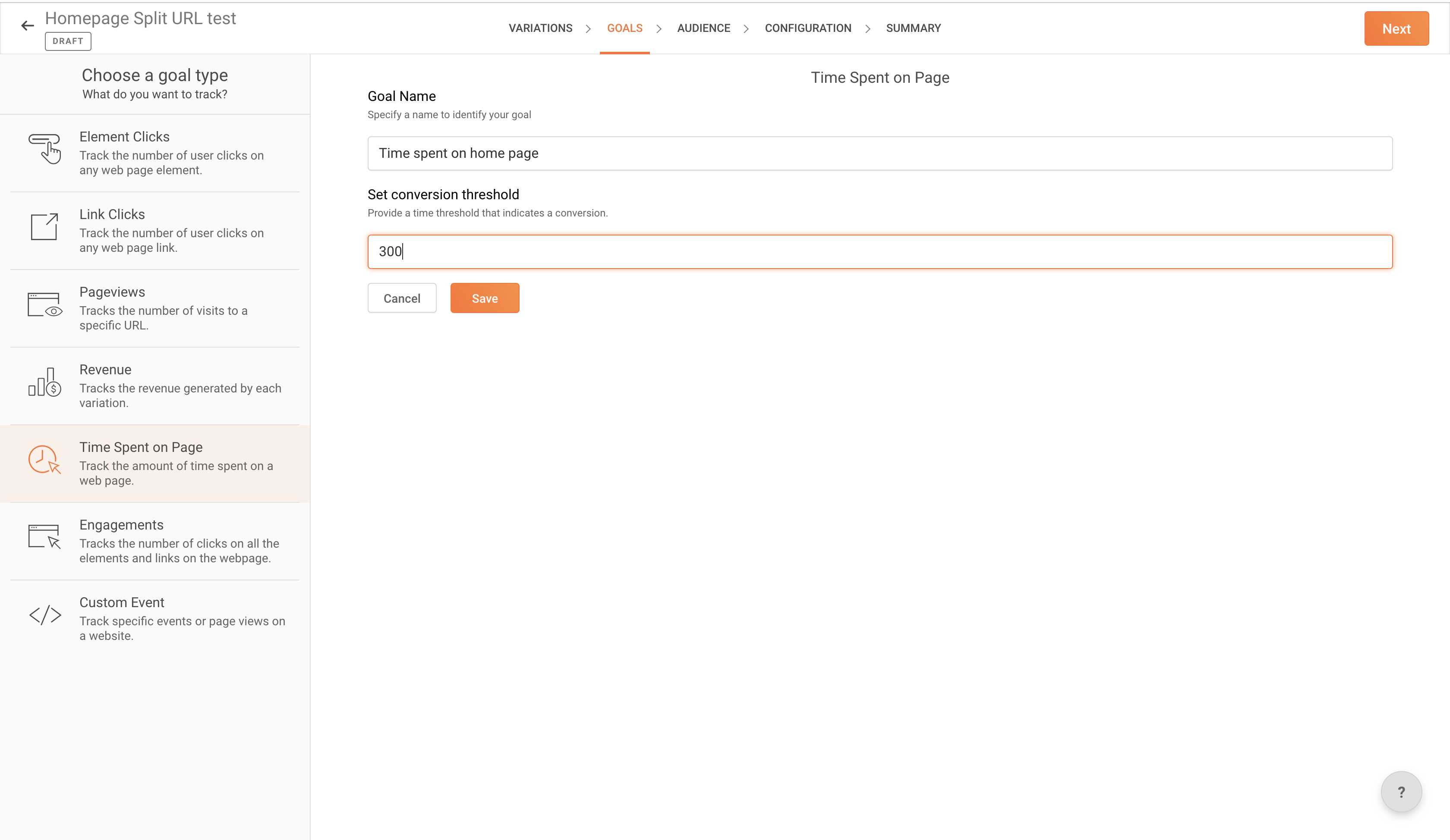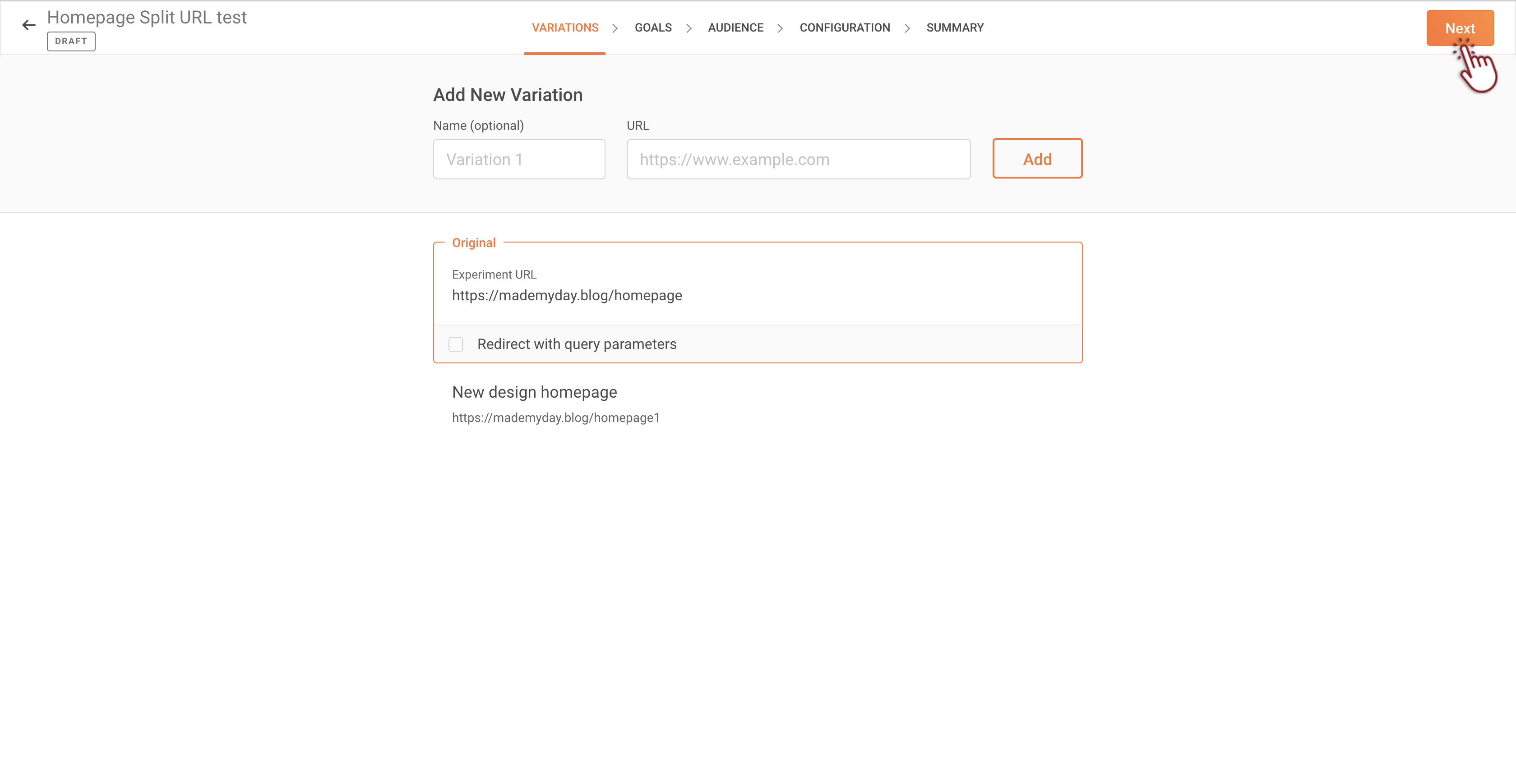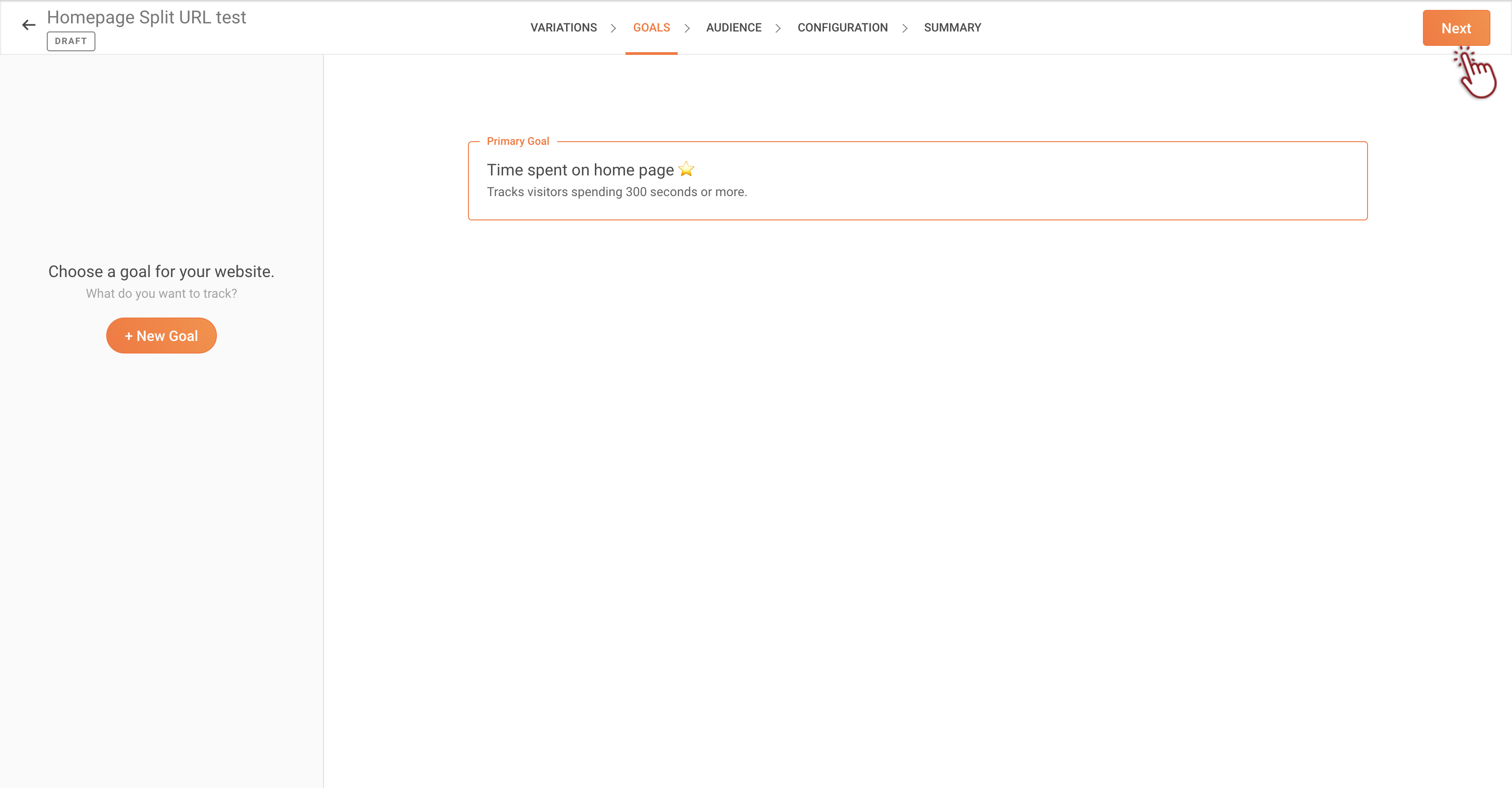 3. 保存 をクリックし、その後 次へ をクリックして、選択したバリエーションの目標を保存します。