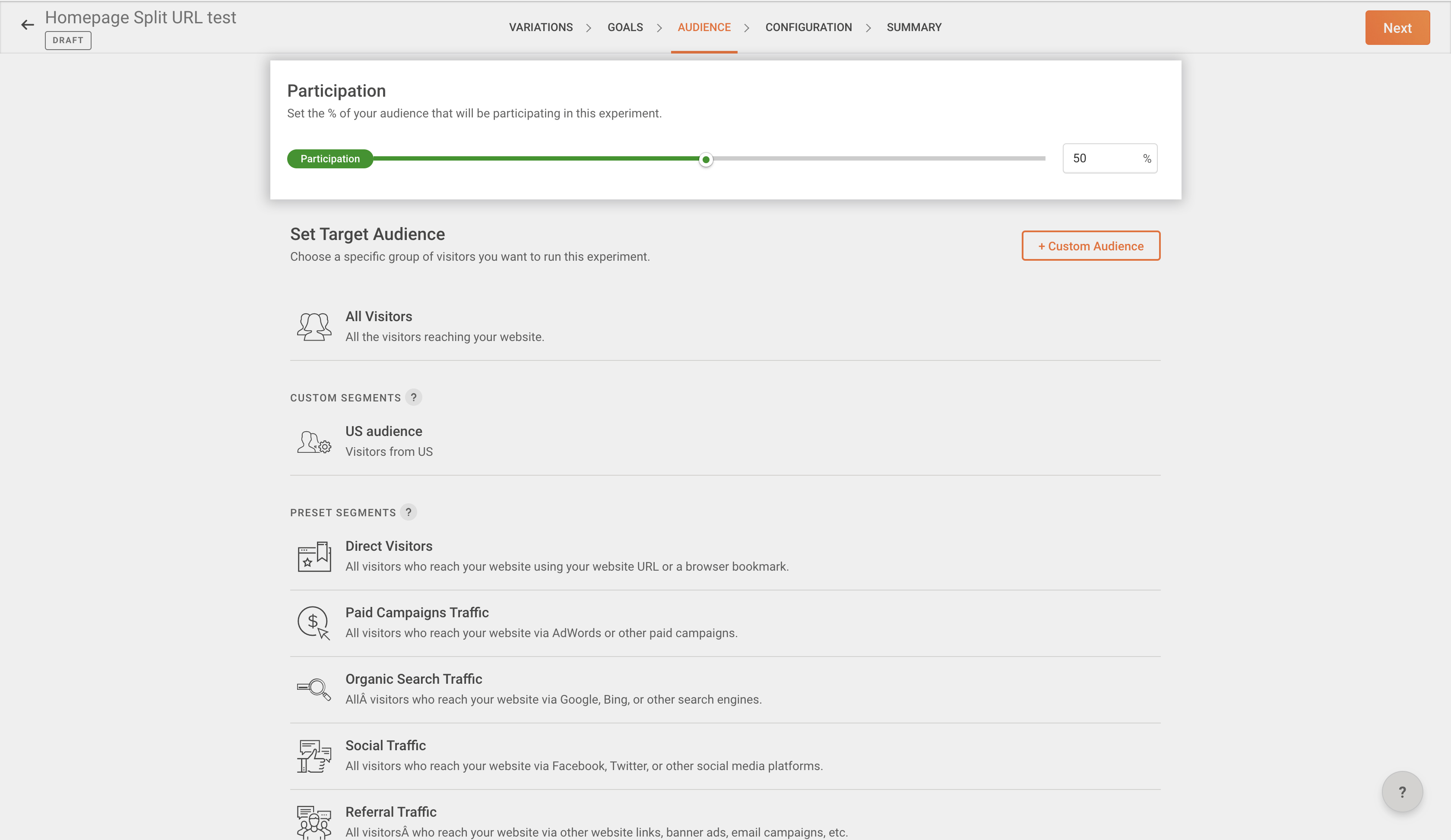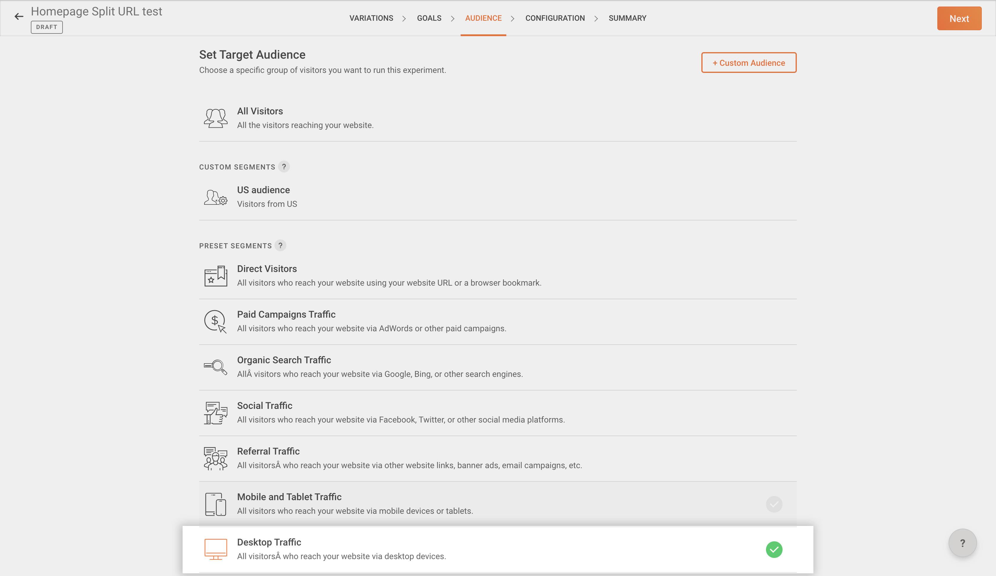 2. ターゲットオーディエンスセクションで、行動、場所、デバイスの使用状況などに基づいて、このバリエーションをターゲットにする特定の訪問者グループを選択します。