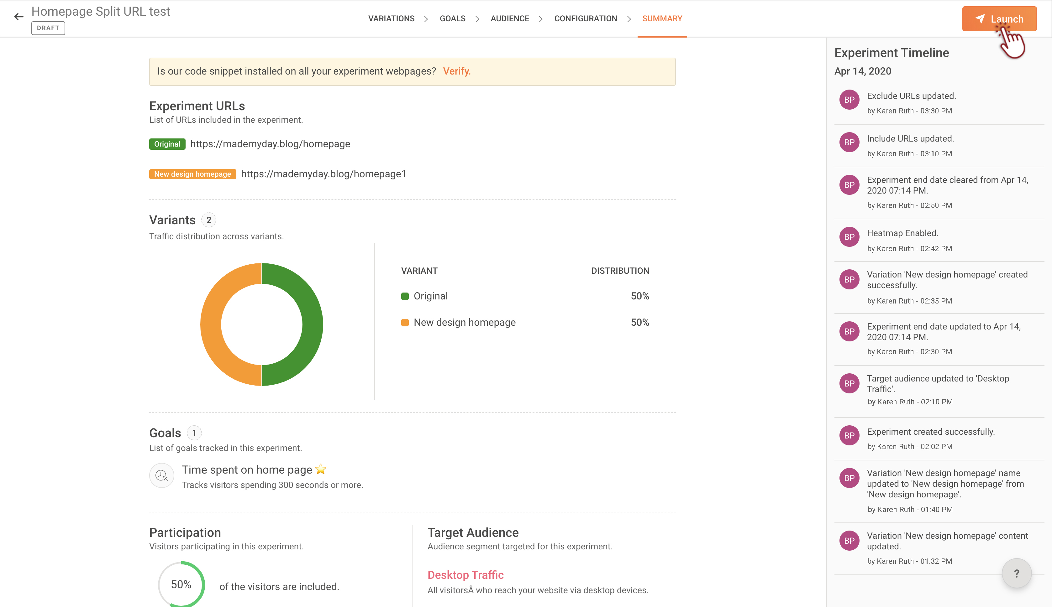 [概要]ページでは、実験の設定オプションの概要が表示されます。作成されたバリエーションの数、追加されたゴール、対象となるターゲットオーディエンスセグメント、およびその他の設定が確認できます。
