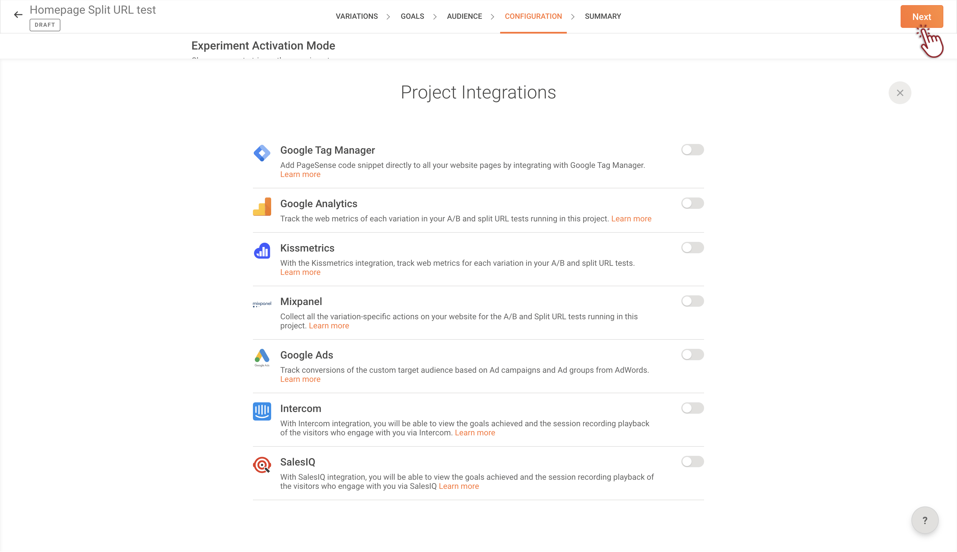 サードパーティツールとの連携:このオプションを使用すると、PageSenseプロジェクトをGoogle AnalyticsやIntercomなどの他のサードパーティアプリケーションと統合し、お好みのツール内で分割URLテストレポートにアクセスして読むことができます。