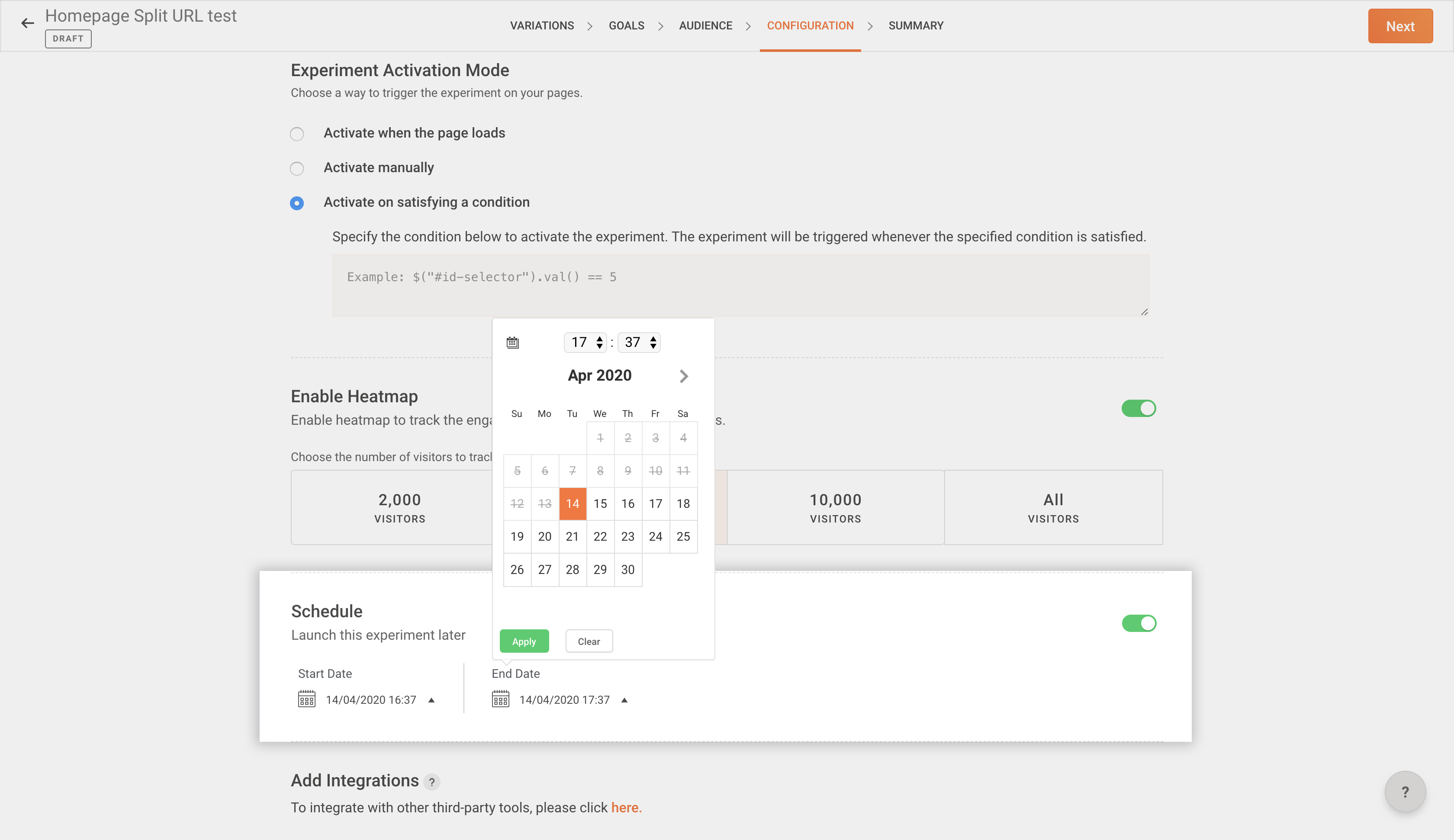 実験をスケジュールする: カレンダーを使用して、実験を開始する特定の日付を選択します。.