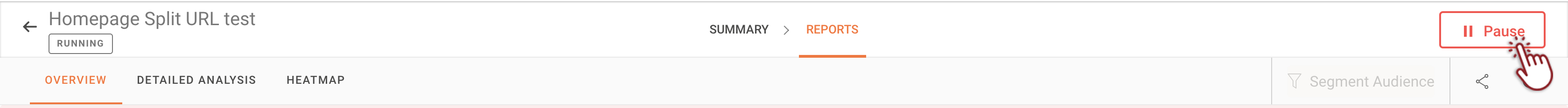 実験が実行されている間は、エディタ、ゴール、バリエーション、および設定タブは非表示になります。実験に変更を加えたい場合は、一時停止ボタンをクリックして必要な編集を行い、再度実験を実行するために再起動をクリックしてください。