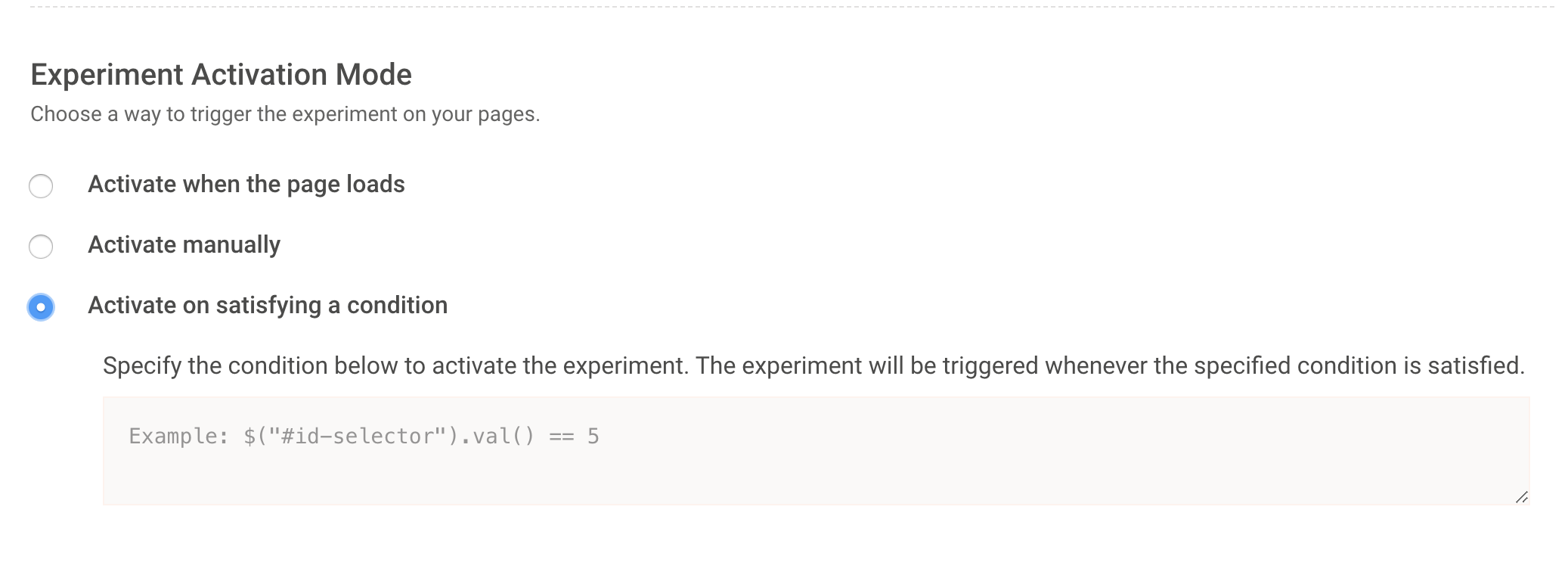 条件を満たすとアクティブ化:このオプションは、訪問者のウェブページ上での行動に基づいて真偽値(TrueまたはFalse)を返すカスタムJavaScriptコードを追加するために使用されます。もしJavaScriptコードがTrueを返す場合、実験は自動的にトリガーされ、実験ページが表示されます。なお、ブール条件はウェブページ上で50ミリ秒ごとに評価および監視されます。