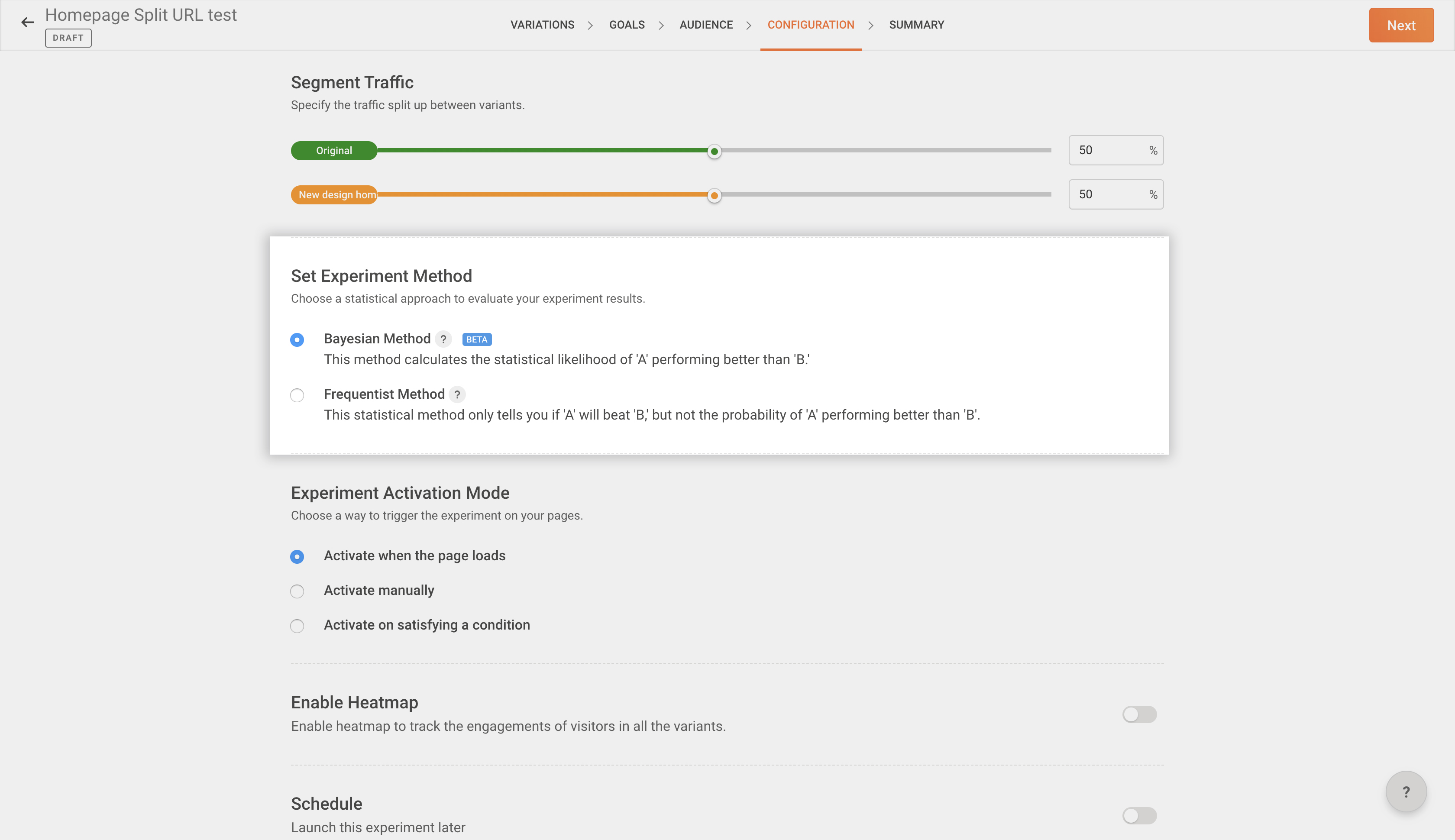 2. 希望する統計手法を選択し、セット実験手法セクションで分割URLテスト結果を評価します。Zoho PageSenseでは、2つの実験手法を提供しています: