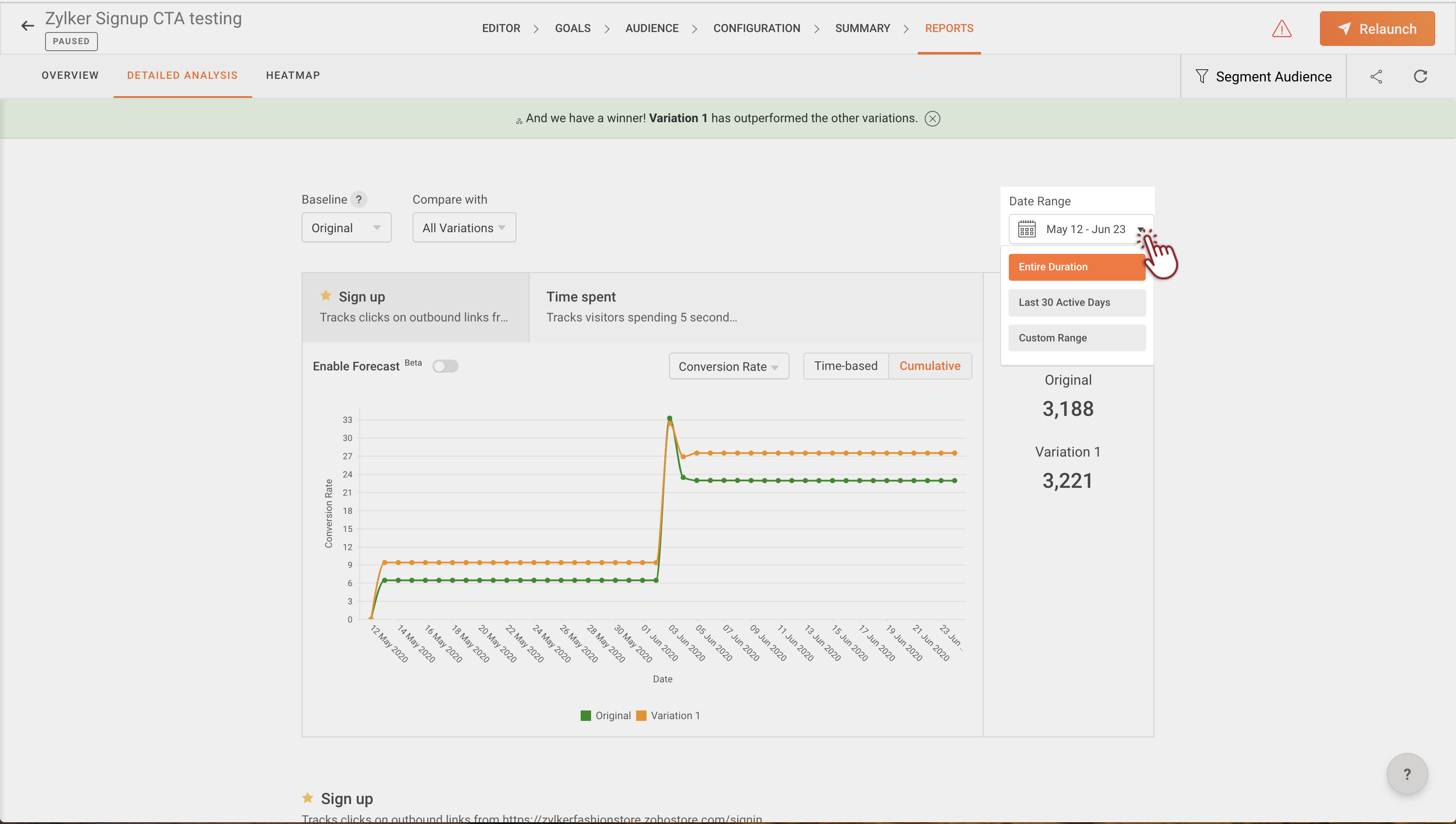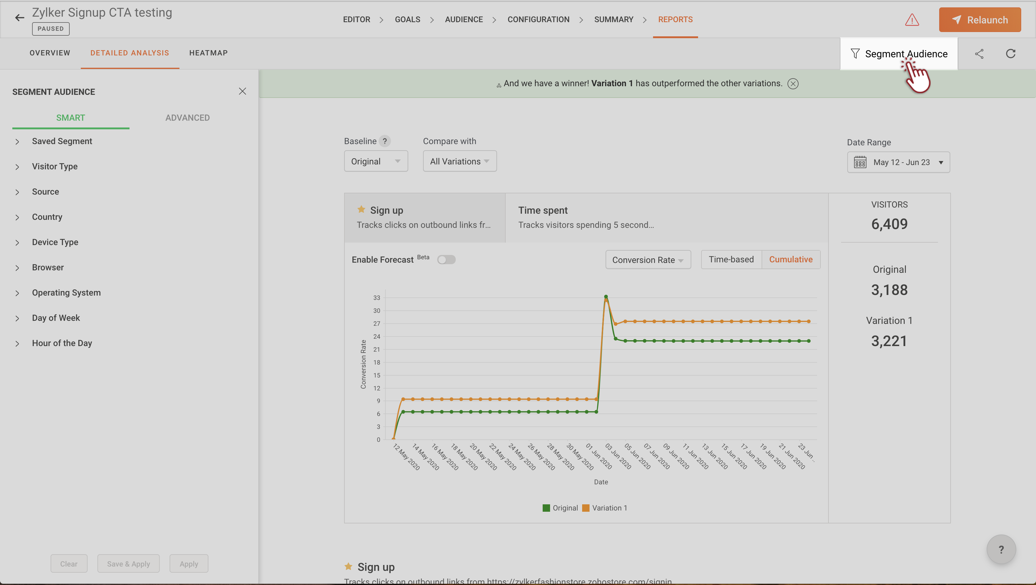 こうすることで、作成したバリエーションの変更が受ける影響や、それがどのようにコンバージョンに影響を与えたかをより包括的に理解することができます。 スマートで高度なオーディエンスセグメントを使用してレポートをフィルタリングする方法を学びましょう。