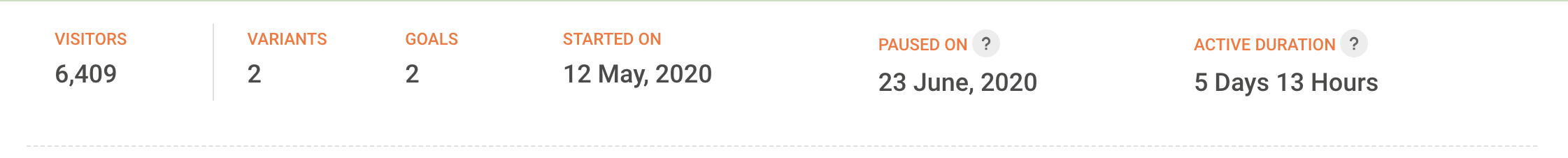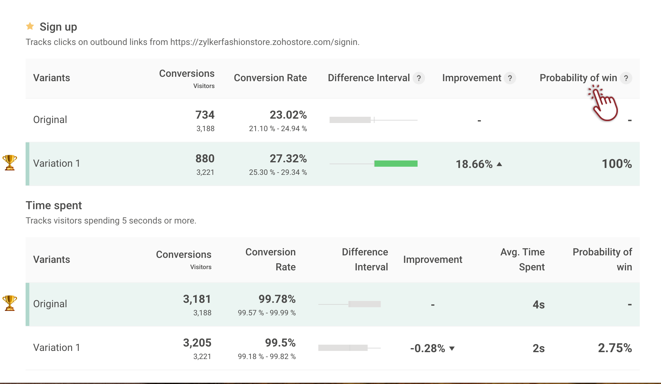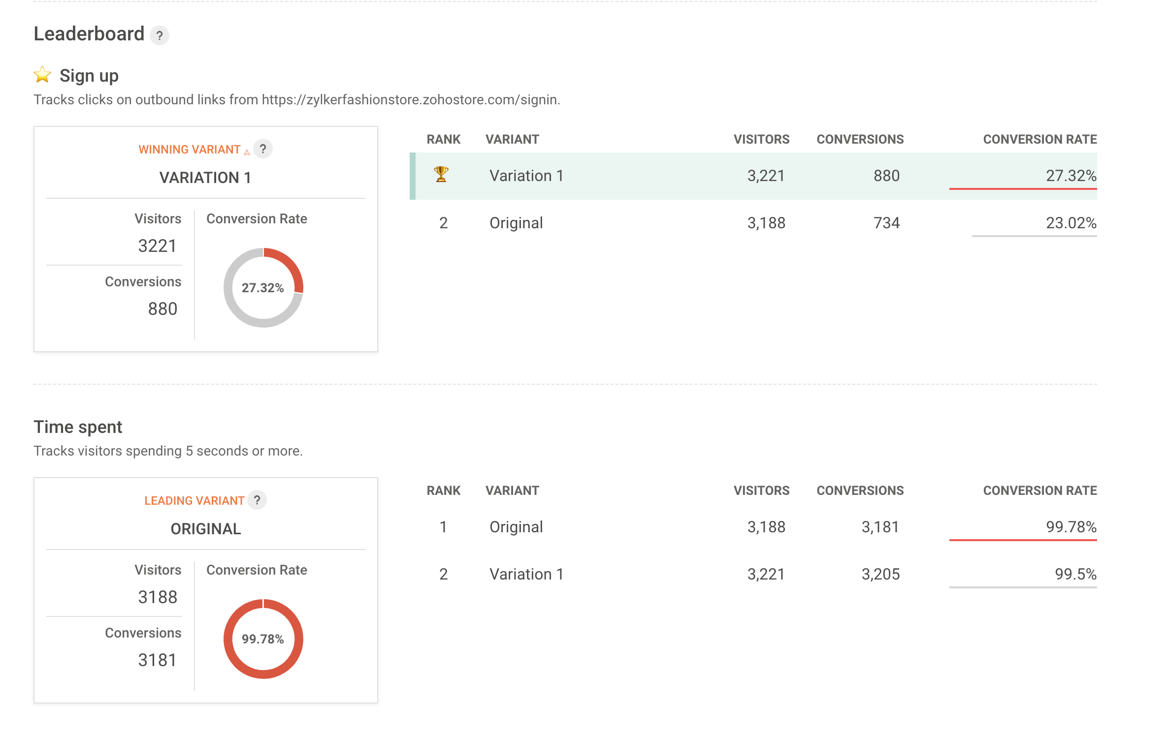 ゴール結果: A/Bテストの元の内容およびバリエーションページの変換率に基づいて、ゴールにおける勝者およびリードしているバリエーションを示します。