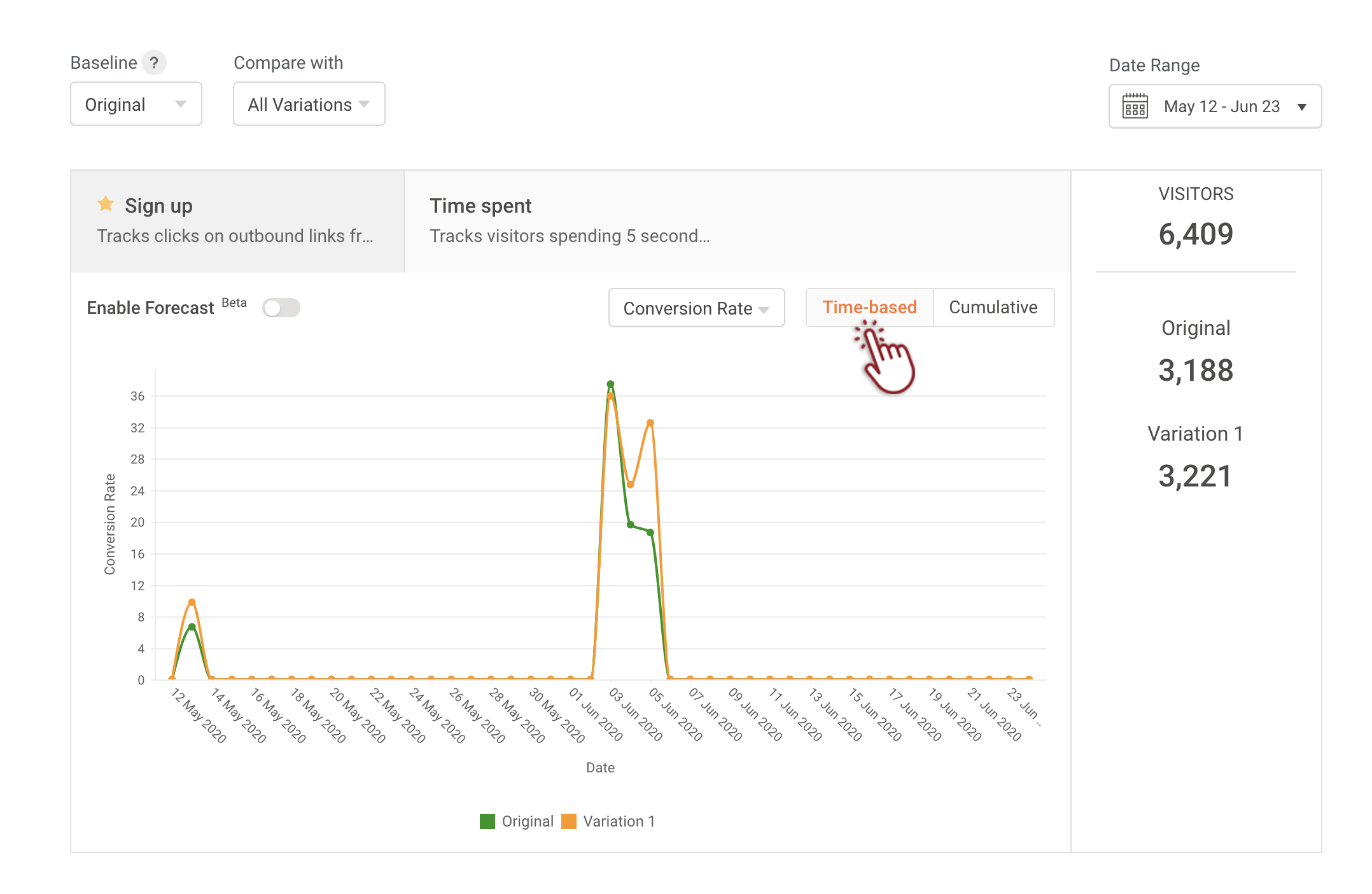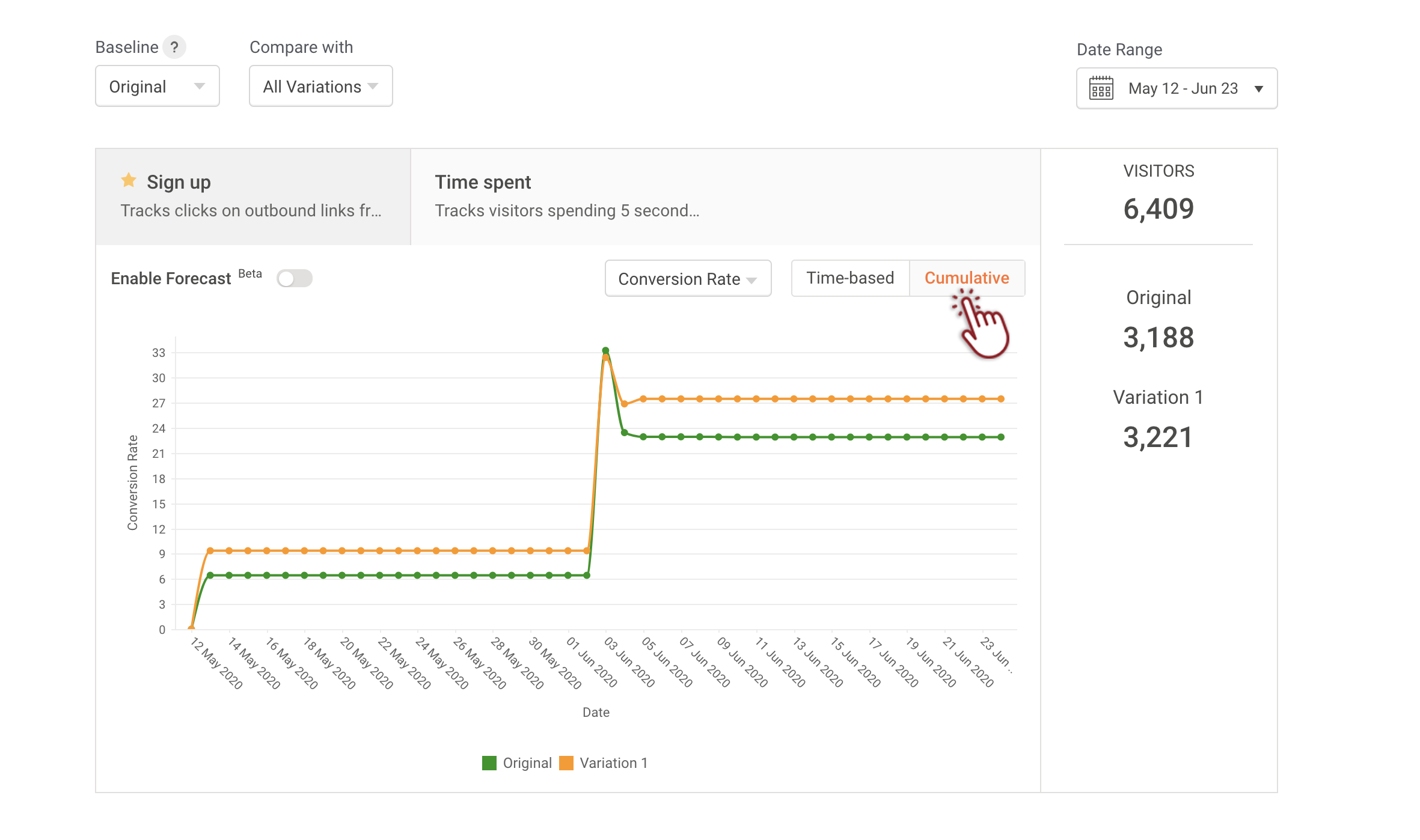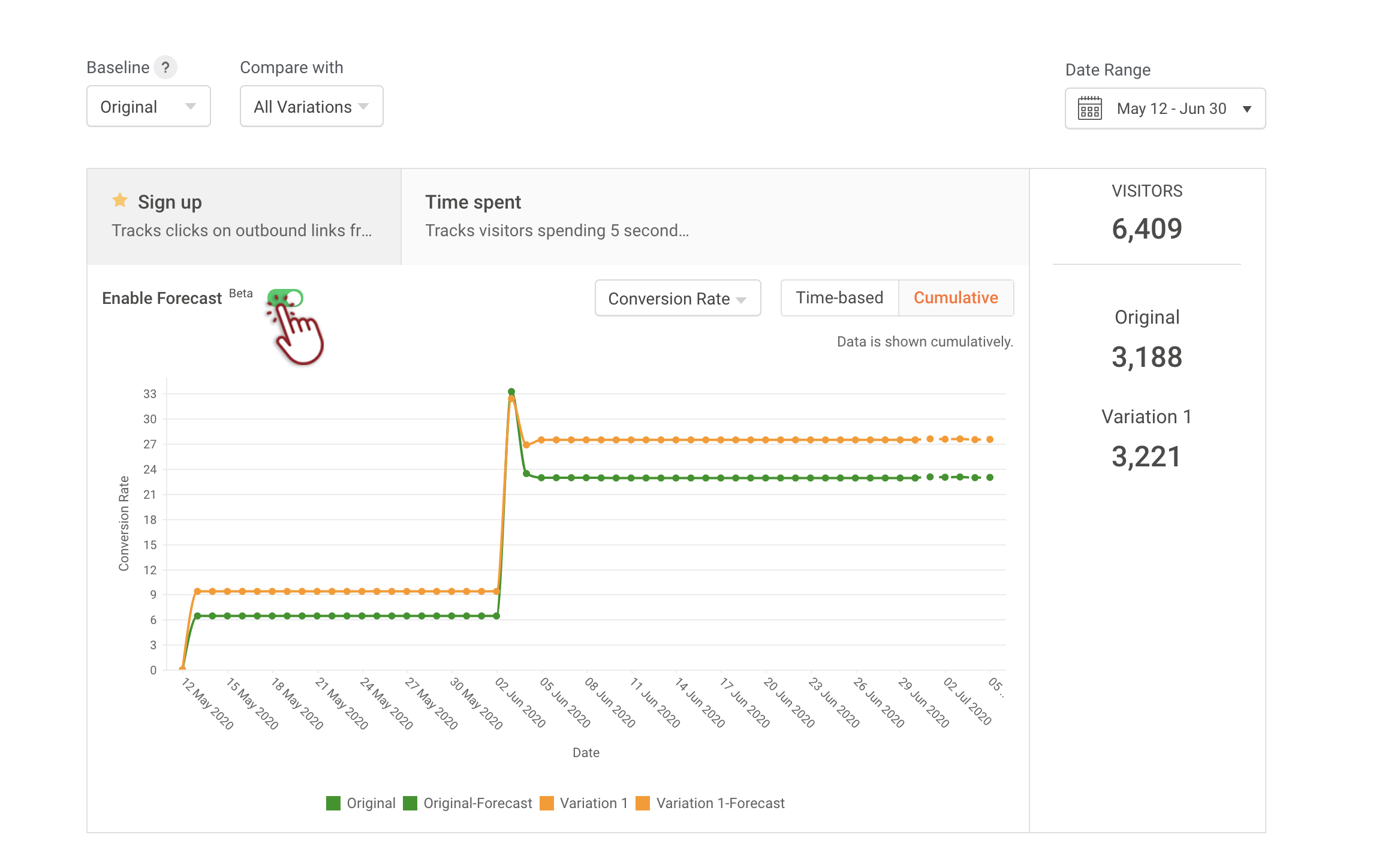 予測を表示:「Forecast」ボタンを有効にすると、選択した期間内で各バリエーションが達成する可能性のある変換率(および改善単価)の予測や変化を表示できます。予測は今後の期間における変化の推定値であり、A/Bテスト結果のパフォーマンスを評価したり、長期的な成果を予測したりする際に活用できます。
