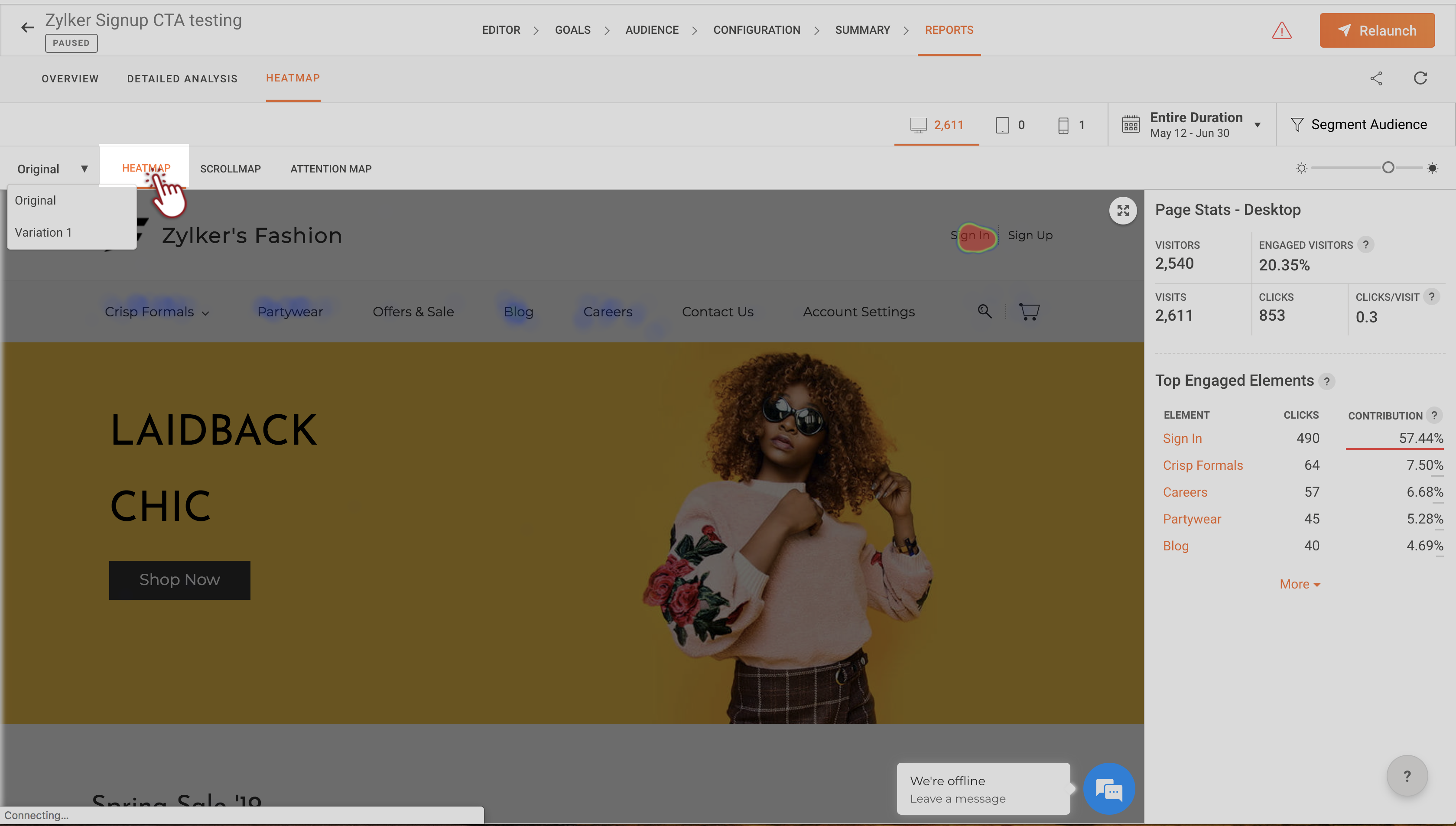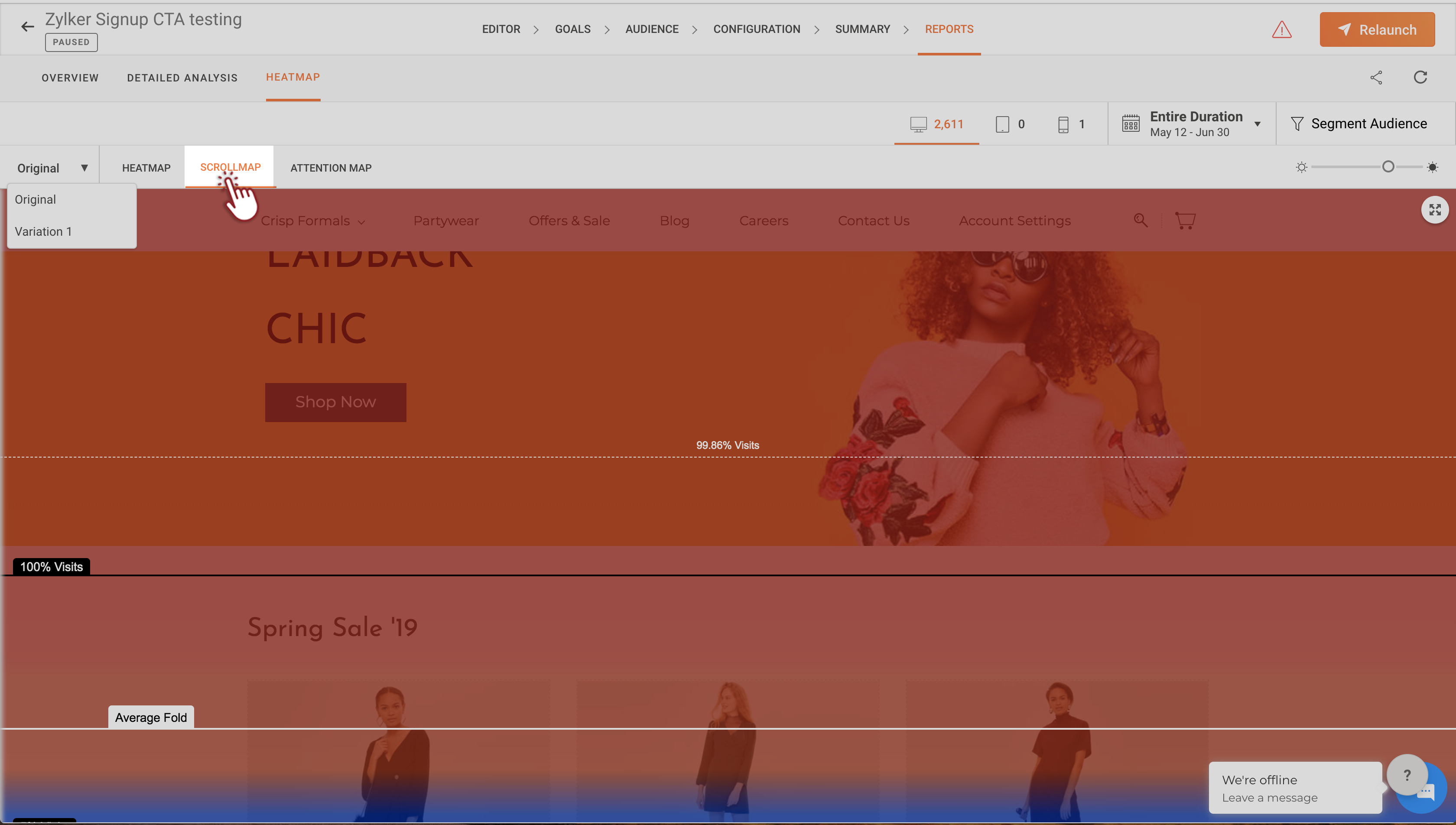 A/B(または分割URL)実験でヒートマップを有効化すると、訪問者が元の内容やバリエーションページのどこをクリックし、スクロールし、閲覧しているかを可視化して把握できます。このレポートは、特定のバリエーションが期待通りのパフォーマンスを示さなかった理由や、課題解決のために必要な変更点について、追加のインサイトも提供します。