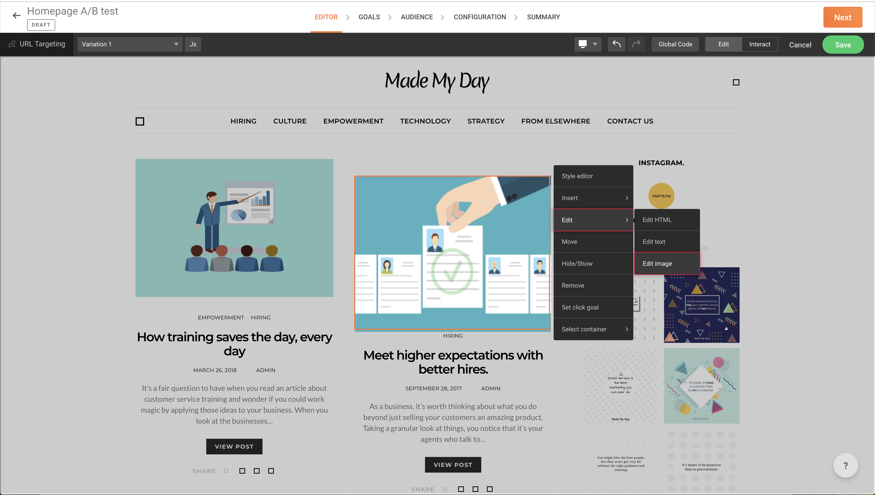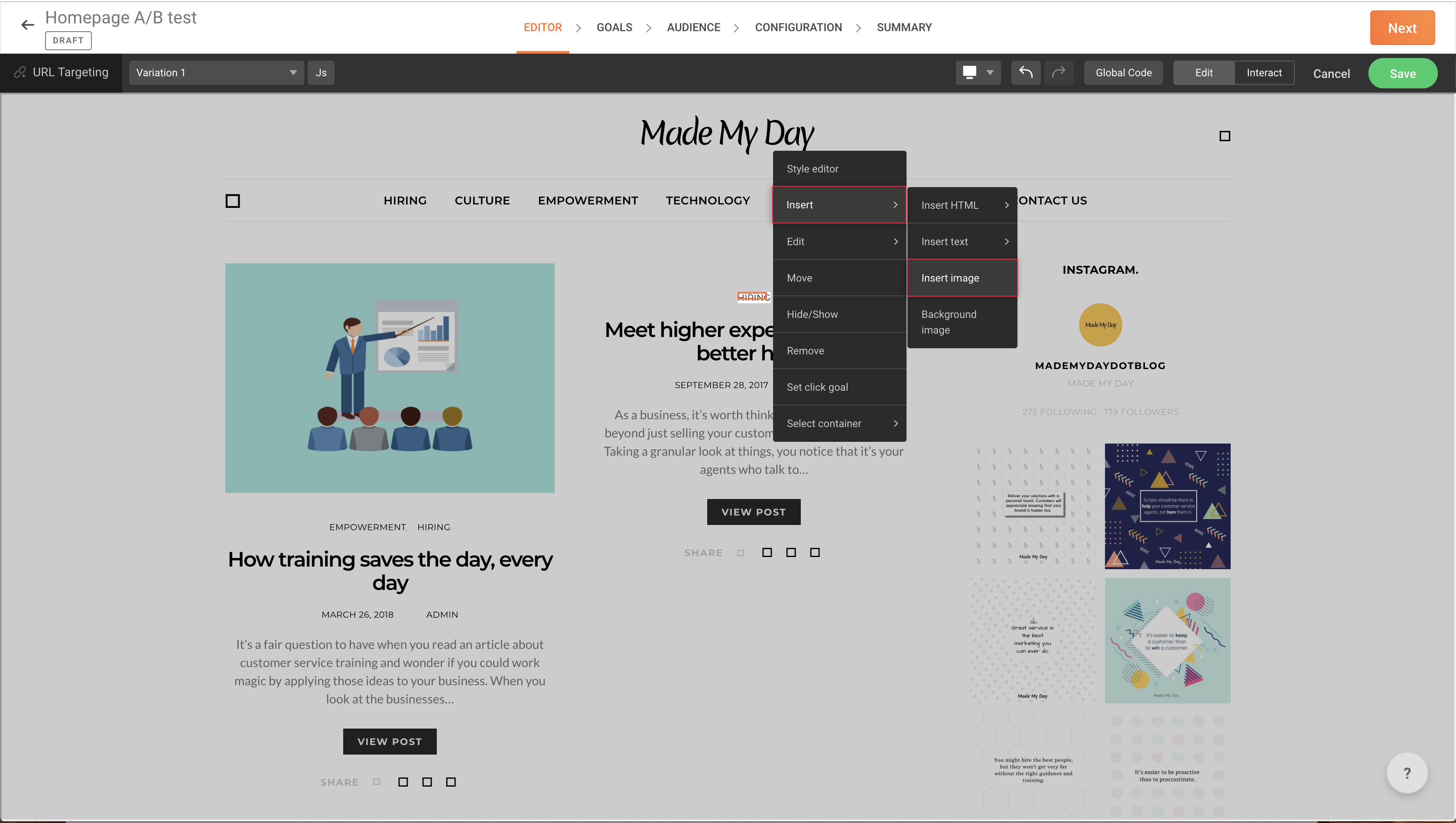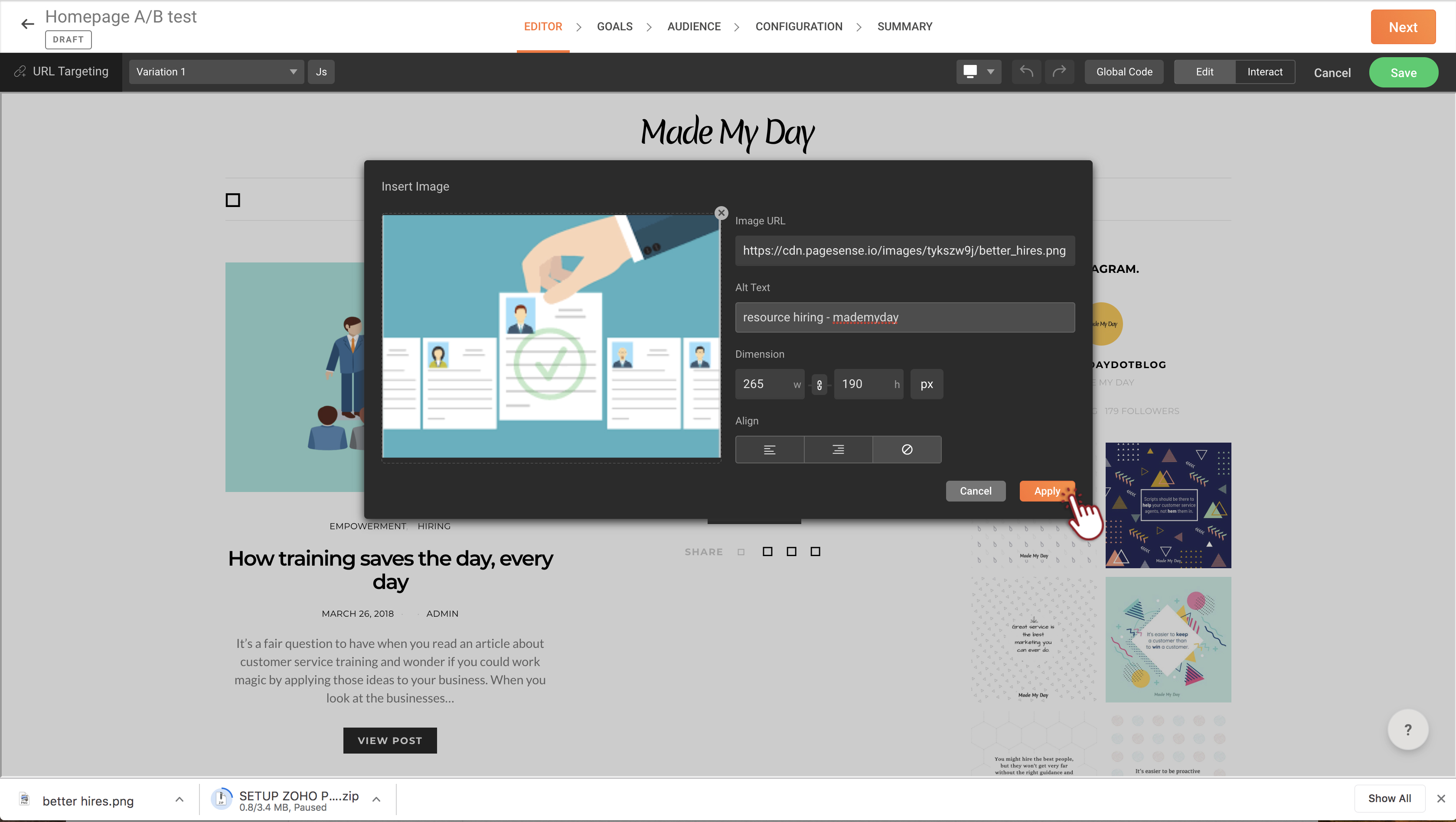 ランディングページや商品ページの画像は、ウェブサイトへの訪問者を引きつける最良の方法です。PageSenseのビジュアルエディタを使用すると、バリエーションページで画像を素早くアップロード、リサイズ、編集することができ、異なるターゲットに効果的にブランドのメッセージを伝えることができます。たとえば、商品の外観に基づいて製品を購入するようユーザーを誘引するために、ECサイトに製品画像をアップロードすることができます。また、ヘッダーやフッターセクションに会社のロゴを挿入することもできます。エディタでは、画像の説明のための代替テキストを追加することもでき、オンライン検索エンジンのSEOを向上させることができます。