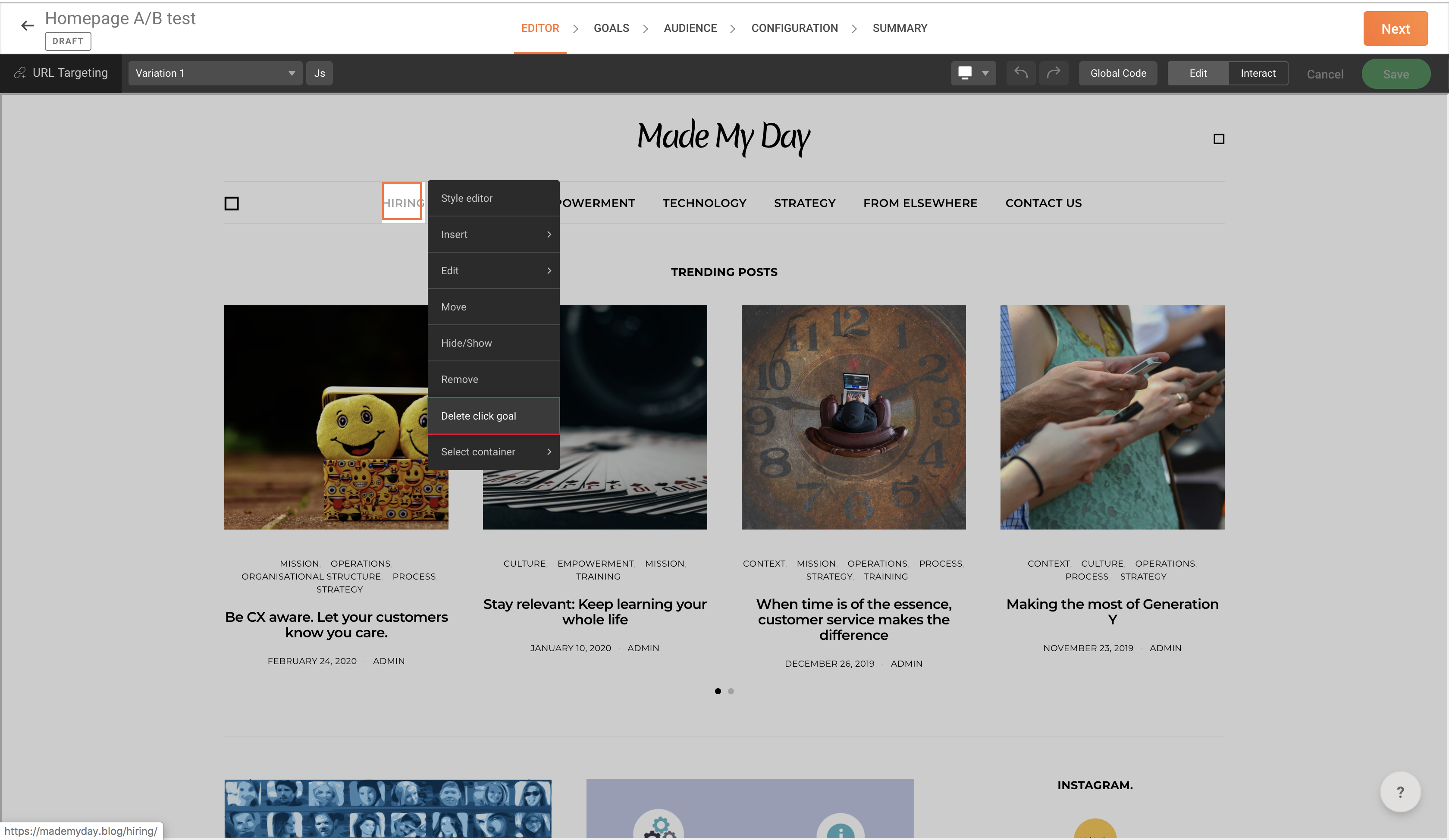 PageSenseでは、ビジュアルエディターで特定の要素を選択し、クリック目標を追加することができます。この要素目標の設定方法により、ウェブサイトのボタン(サインアップ、送信など)のクリックを追跡し、テスト用の変更を行う際に訪問者のメトリクスを収集することができます。また、実験の[目標]タブから、他の目標のタイプをバリエーションに追加することもできます。