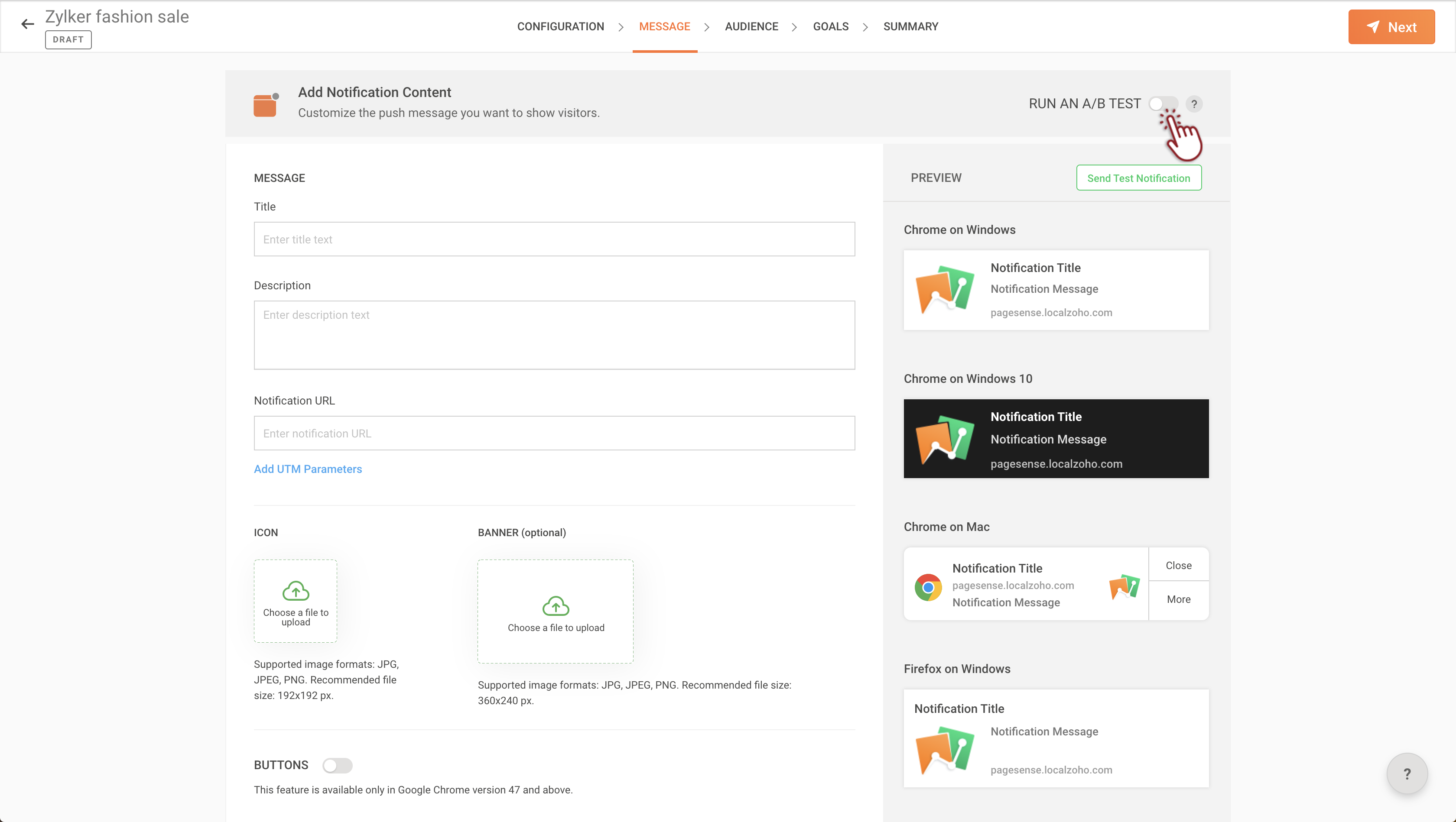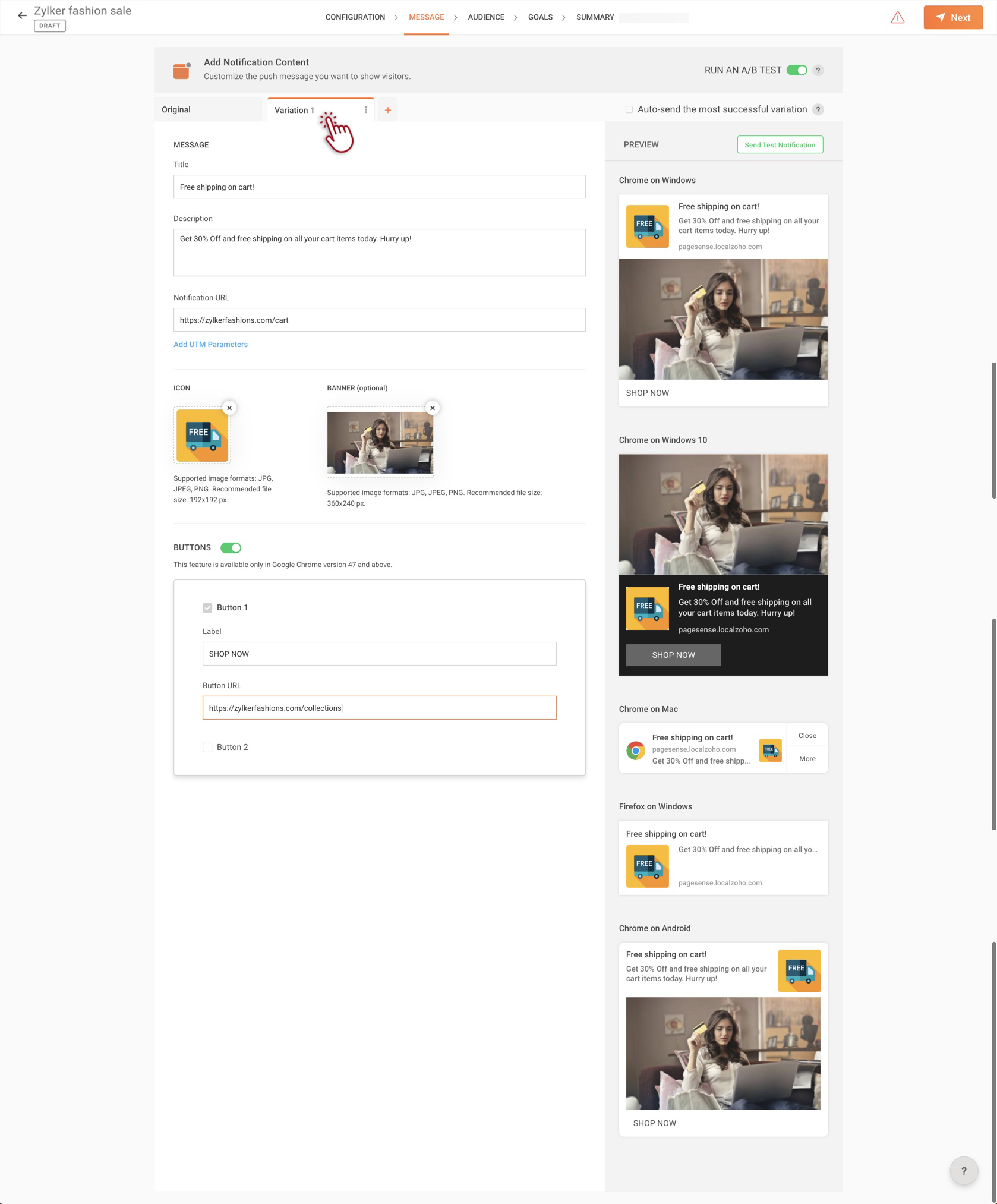 通知に特定のビジネス目標(CTAボタンのクリック数、ページ上での滞在時間など)を関連付けて、変換を追跡し、ユーザーへのメッセージの影響を測定します。