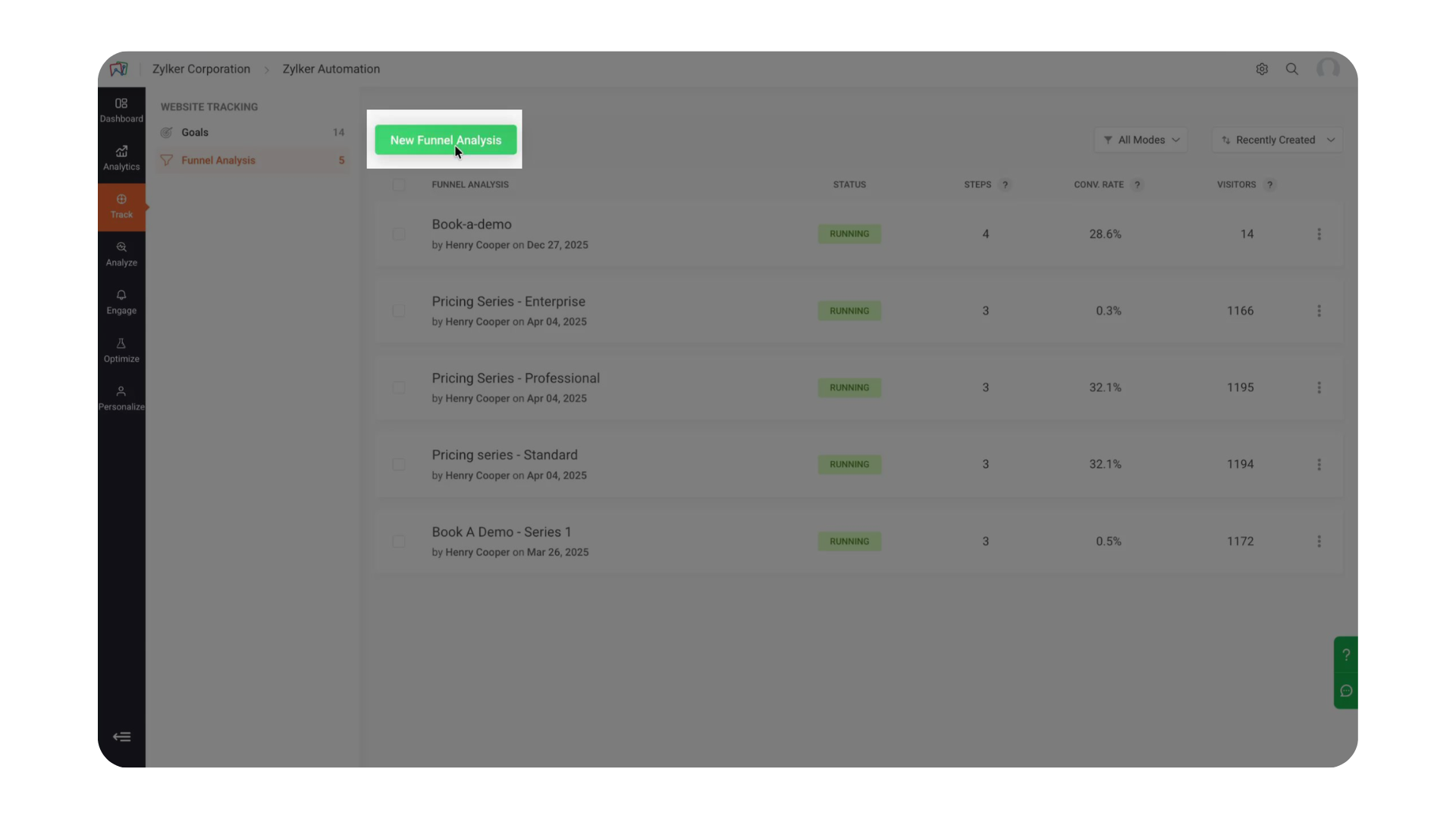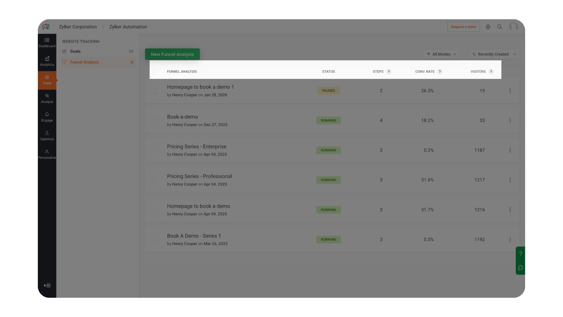 ステータスでファネルをフィルタリングし、「最近作成されたファネル」などの条件で並べ替えて、管理や分析をしやすくします。