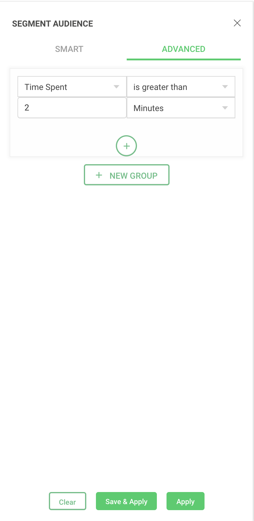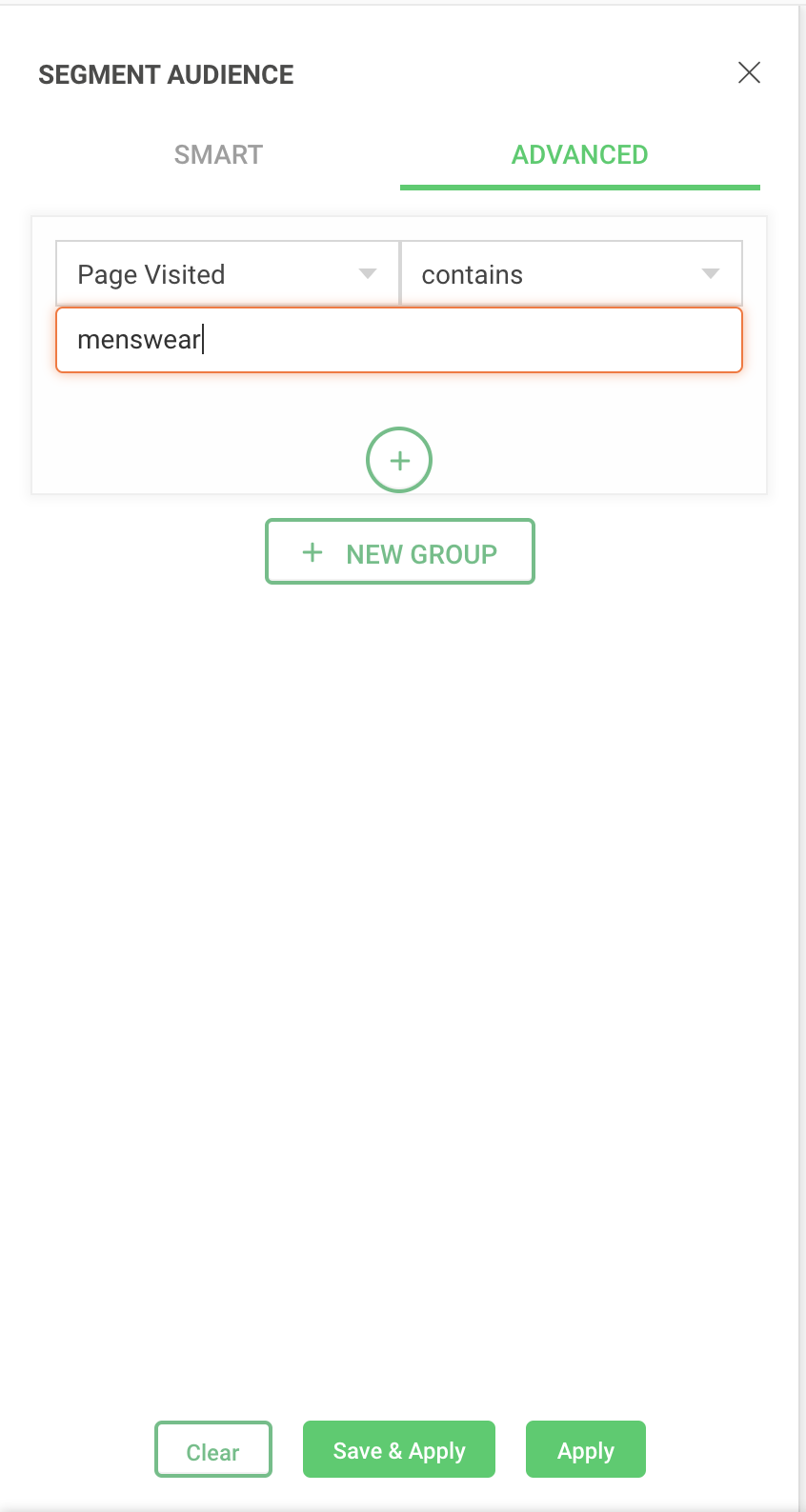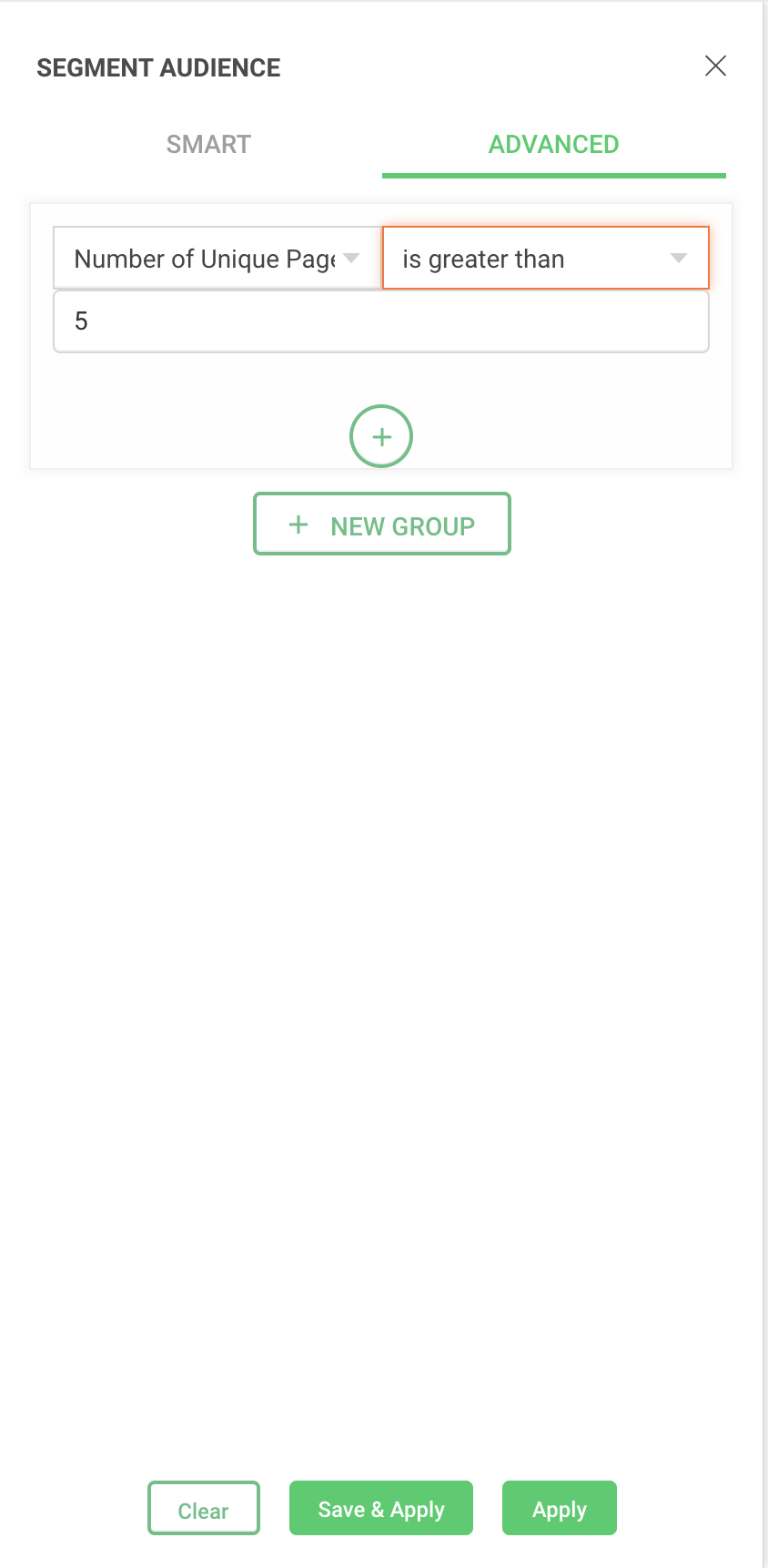 よりニッチで複雑なオーディエンスフィルタを作成するには、ADVANCED を選択します。AND/OR論理条件を使用して作成することができます。