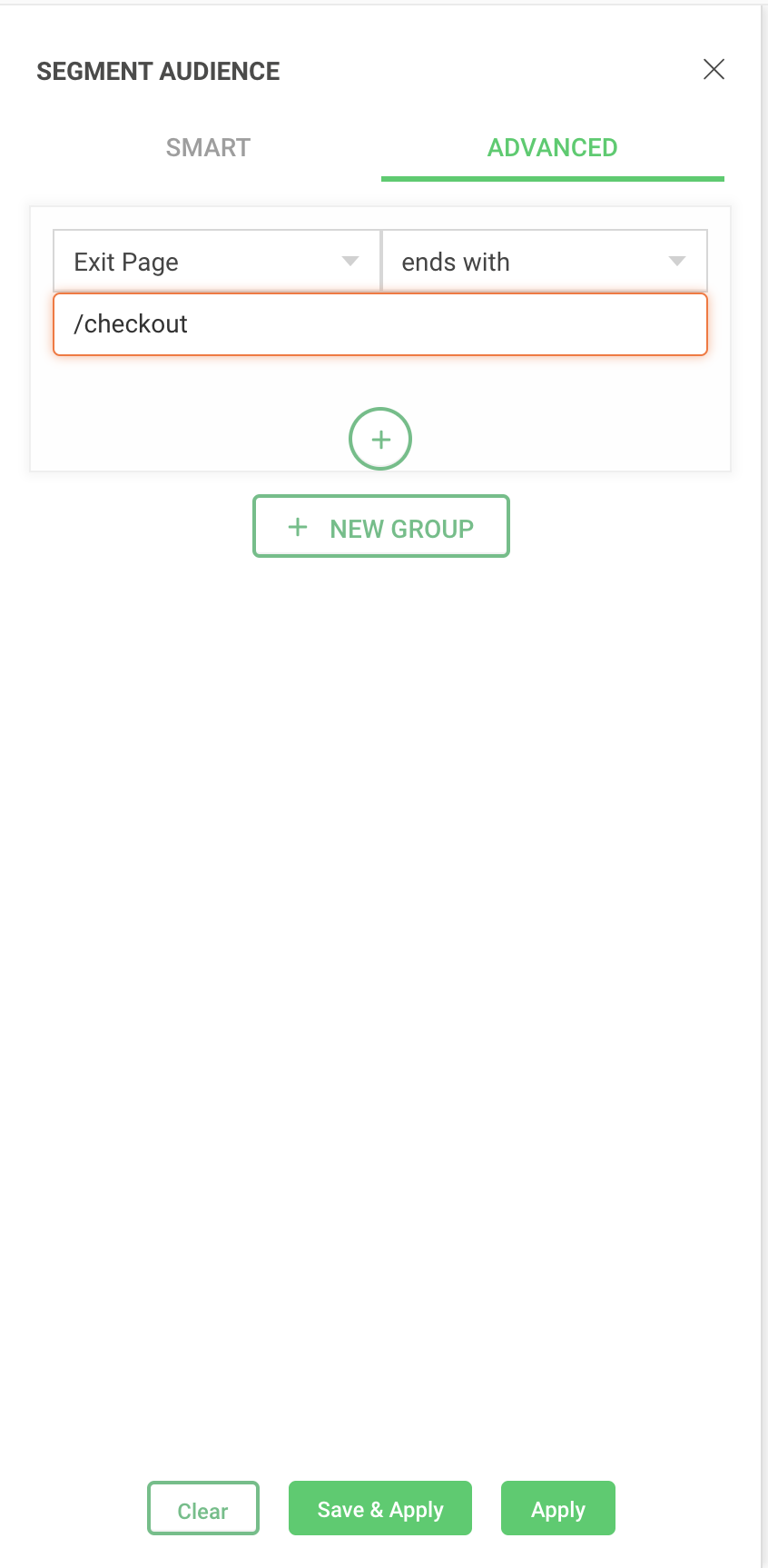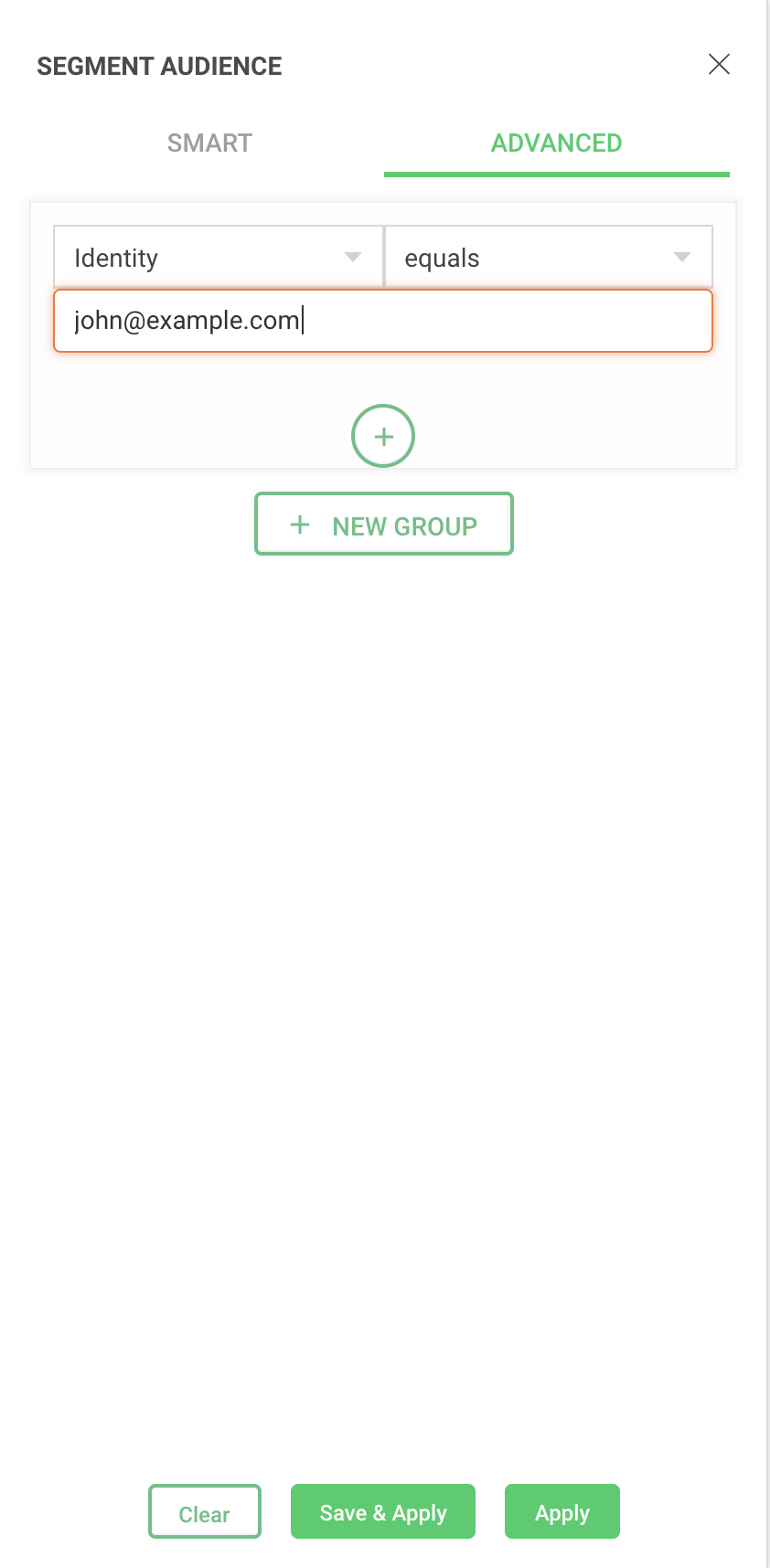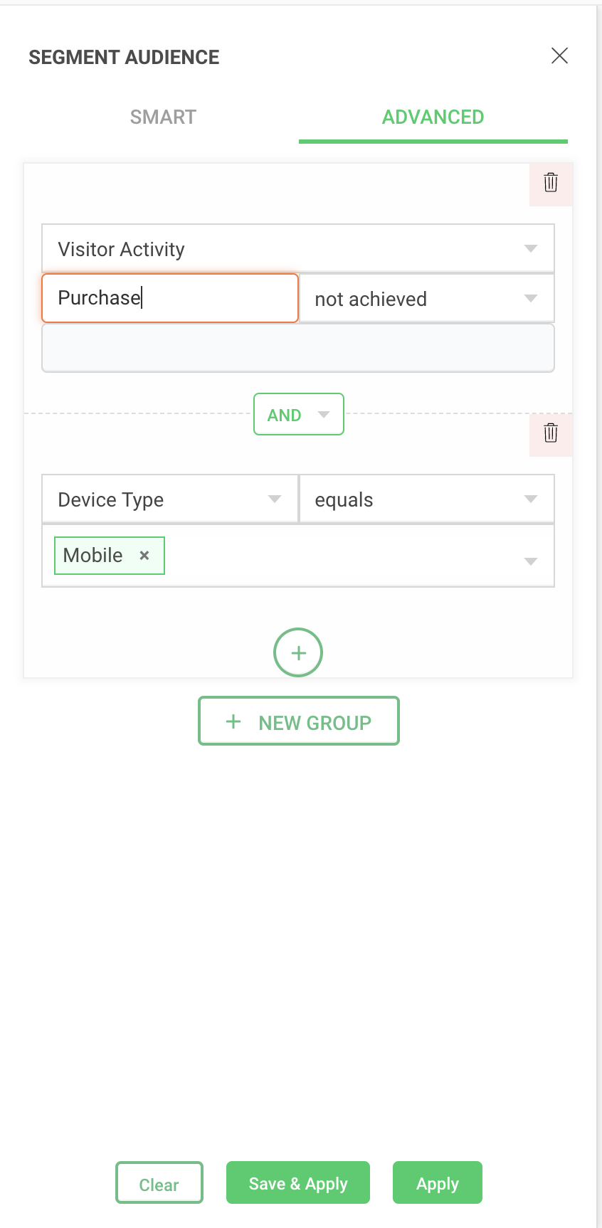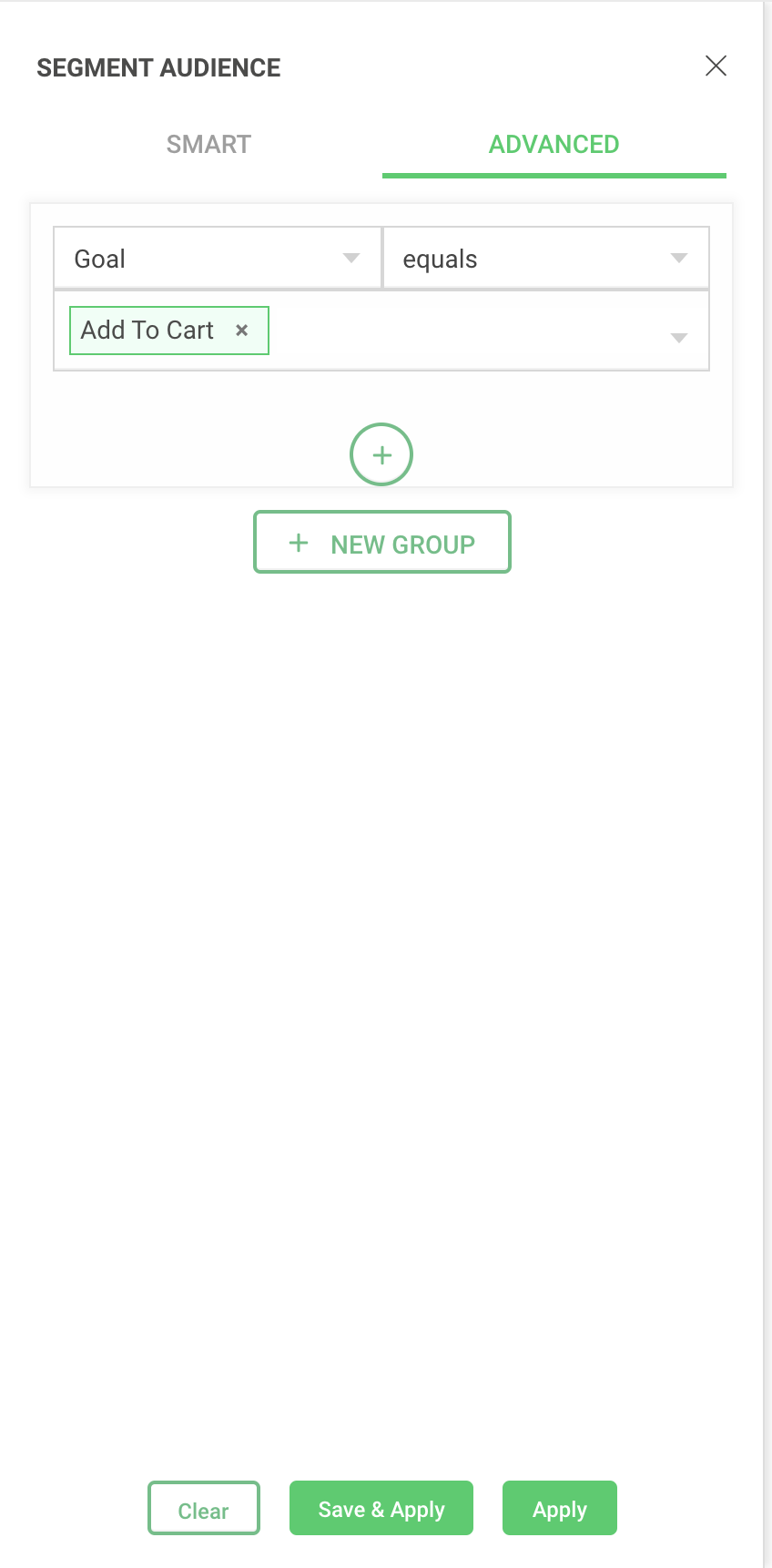よりニッチで複雑なオーディエンスフィルタを作成するには、ADVANCED を選択します。AND/OR論理条件を使用して作成することができます。