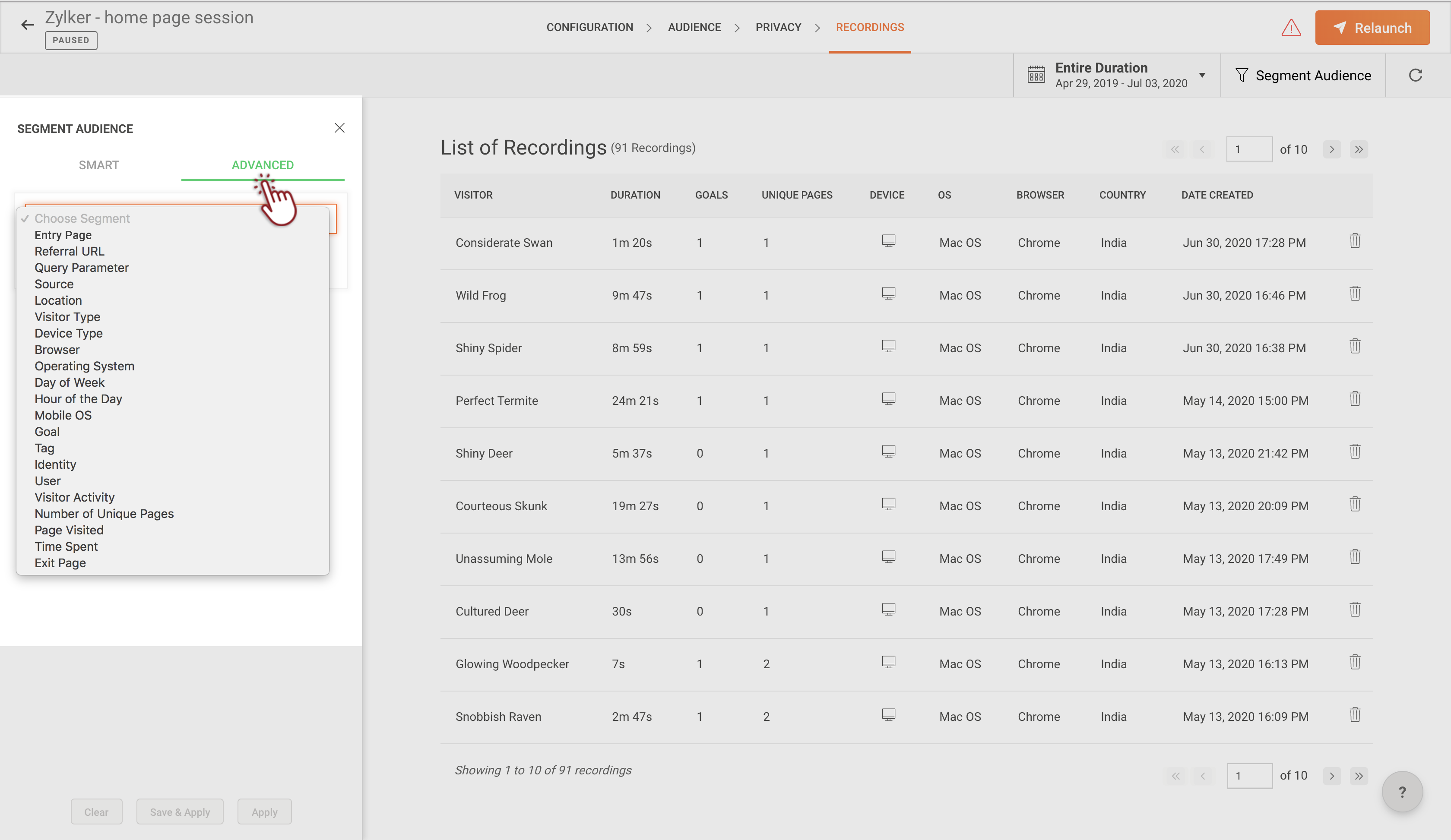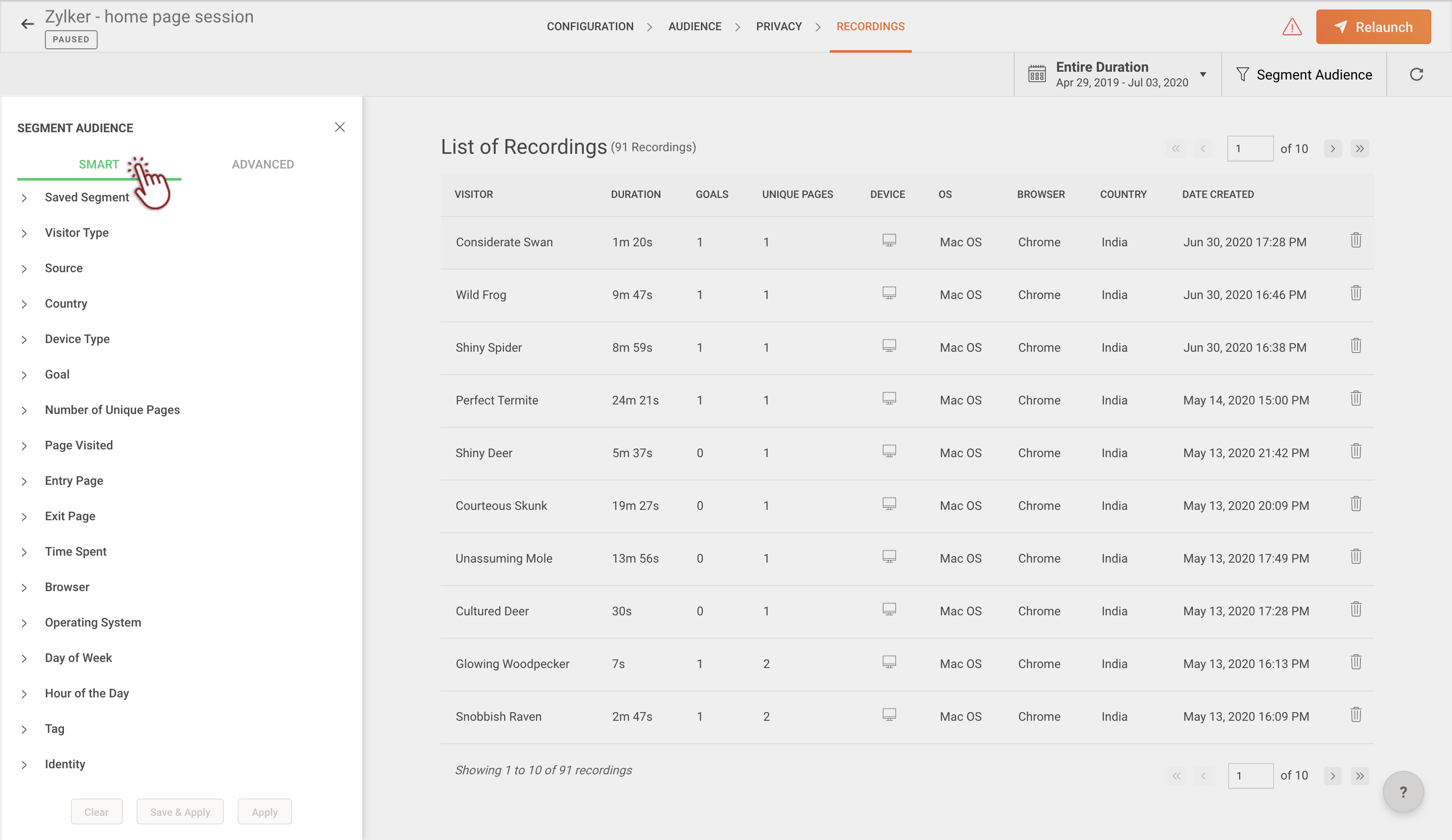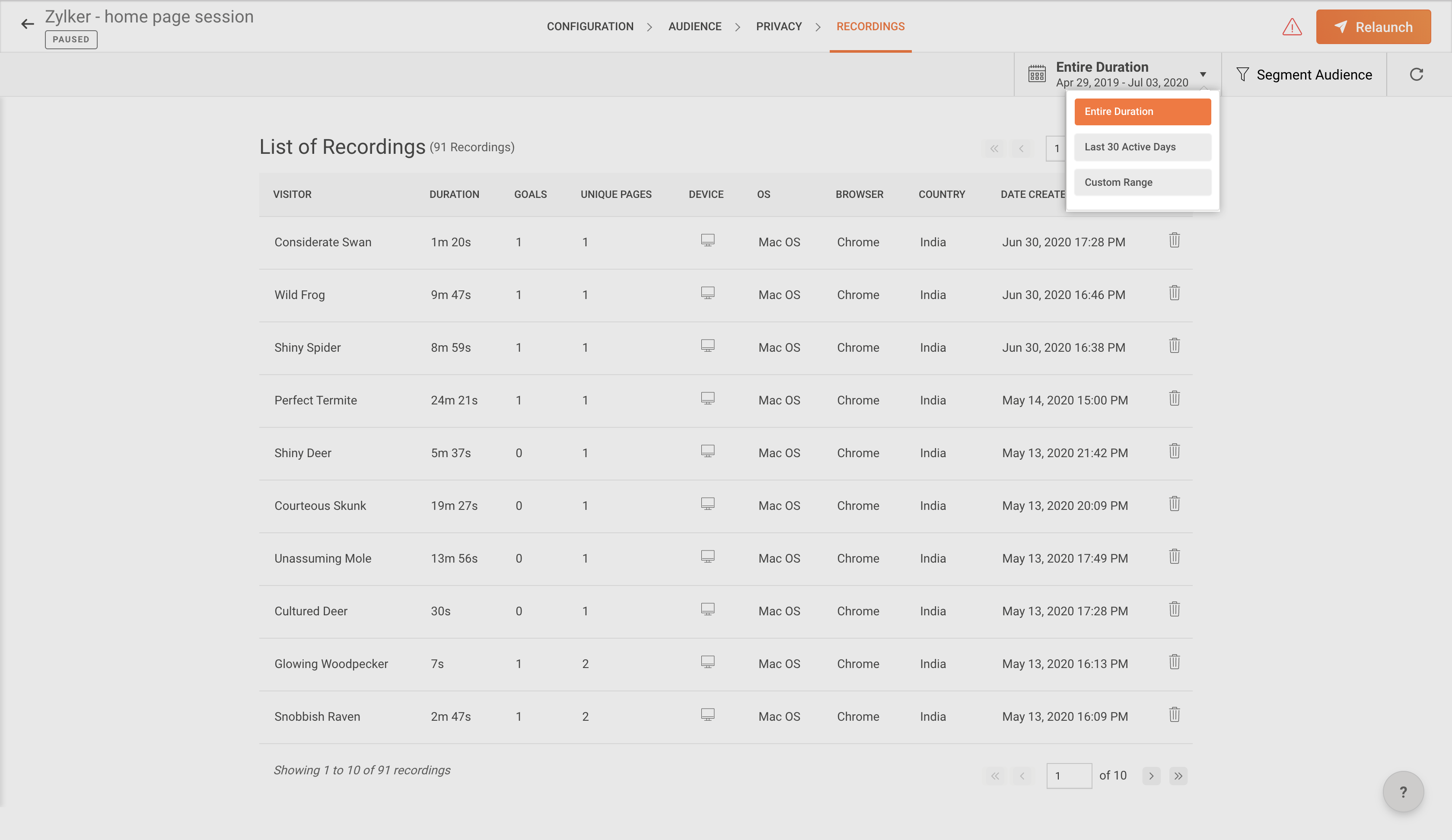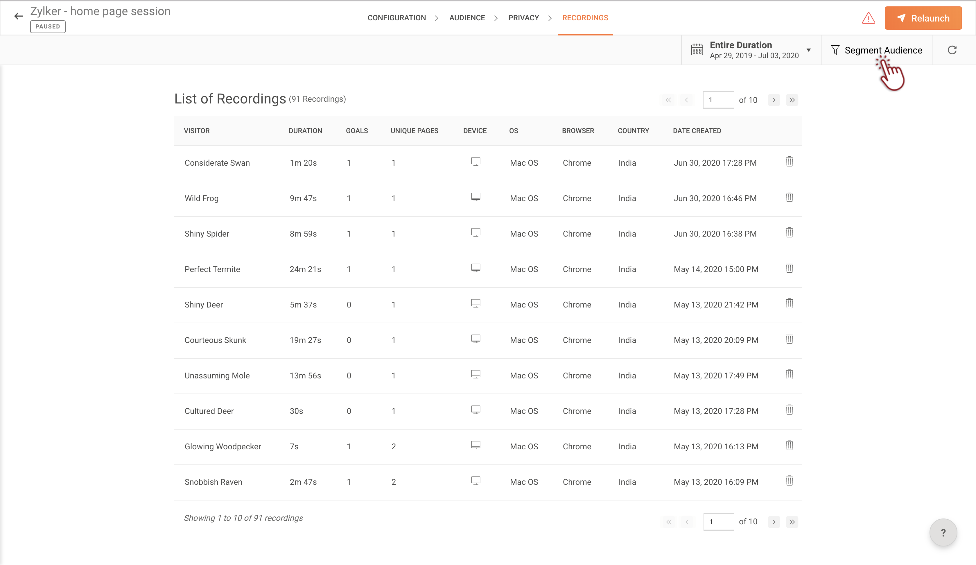 ウェブサイト上で2分以上滞在した訪問者の録画リストが表示されます。訪問者が閲覧したページ数に関係なく、3分間に2つのウェブページを閲覧した場合や、3分間に7つのウェブページを閲覧した場合でも、訪問者の録画がリストに表示されます。