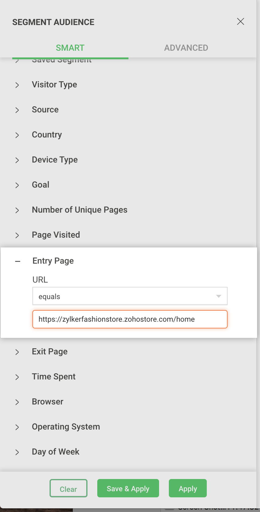 PageSenseで利用可能な事前定義されたオプションから、訪問者のタイプ、デバイスの種類、ソースなどを含む、オーディエンスフィルタを直接作成するには、SMARTを選択します。