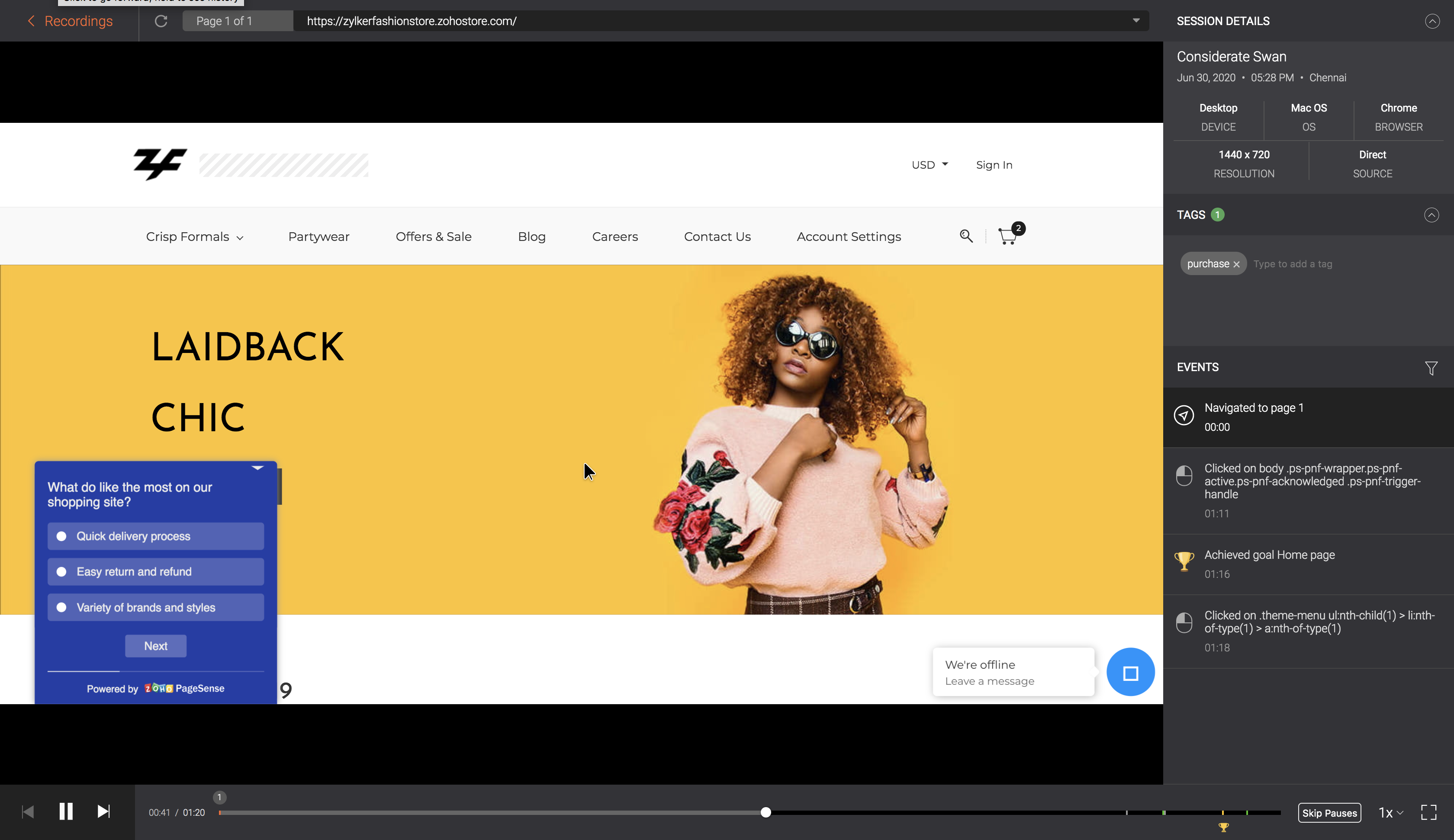 レポートでは、設定された目標を達成しなかったすべての訪問者の録画のリストが、より焦点を絞った形で表示されます。このリスト内の個々のビデオをクリックすることで、カートにアイテムを追加する前に訪問者がたどるパスやページ、特定のCTAボタンをクリックする際に直面するUXの問題(ある場合)、および変換せずにサイトを離れるページを表示することができます。これらの洞察を活用して、訪問者を変換に導くために必要な改善を次に行うことができます。