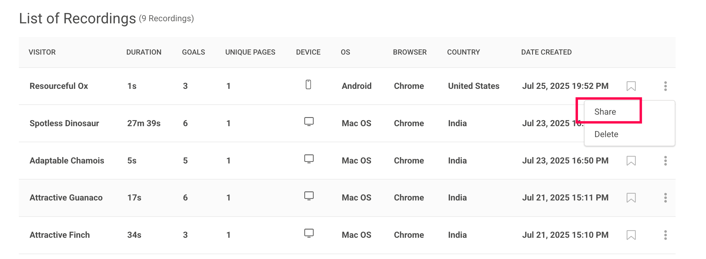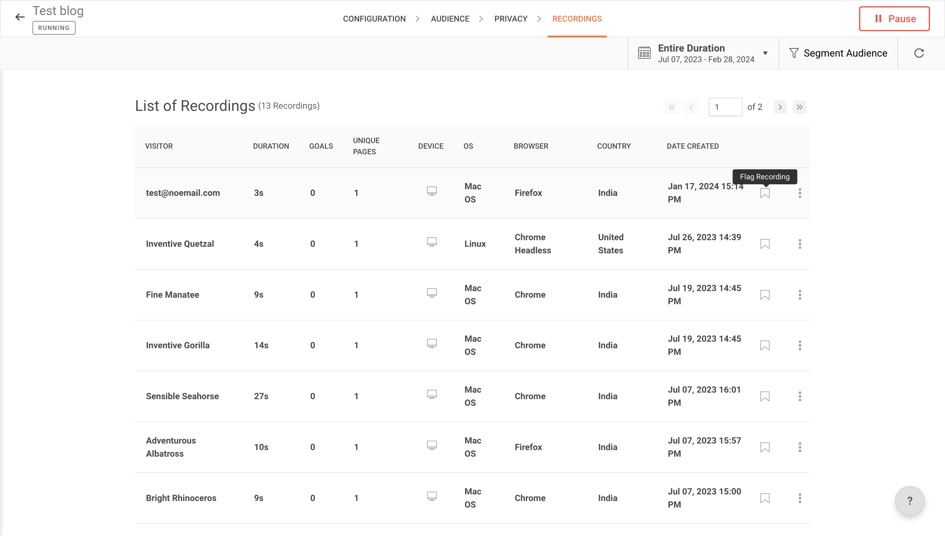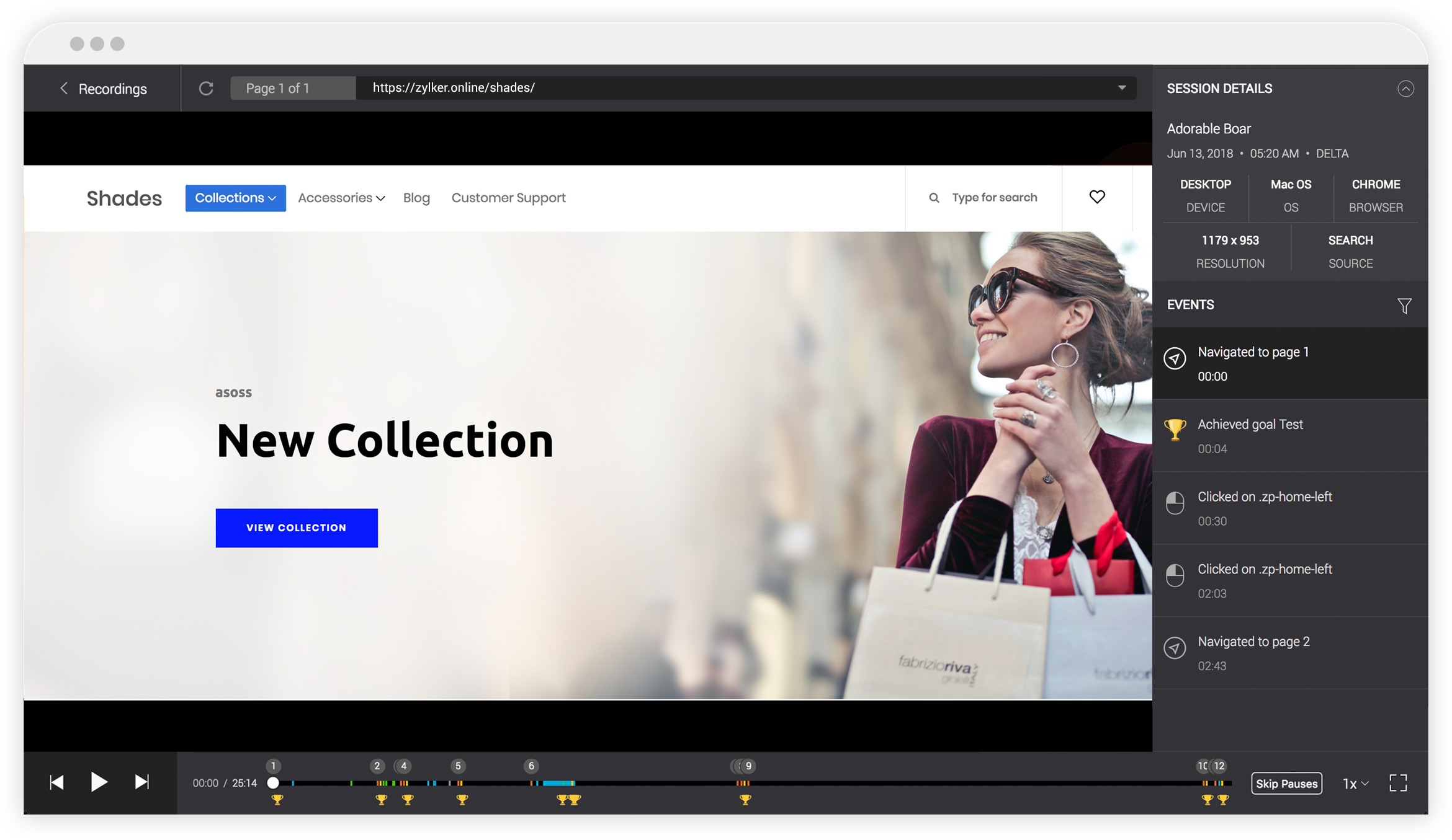 訪問者が目標を達成したタイムスタンプにはゴールアイコンが表示されます。また、ポーズをスキップしたり、再生速度の調整、右側のタブを非表示にして全画面で録画を閲覧することも可能です。